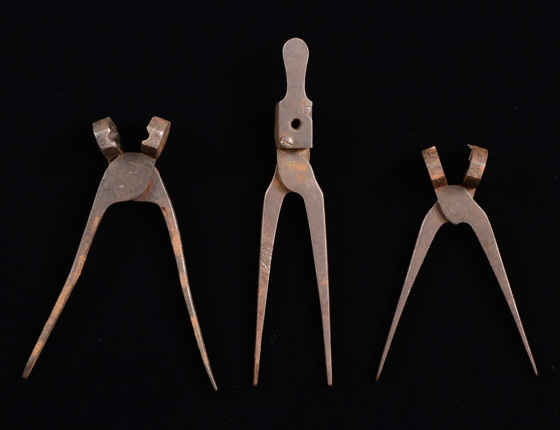USED RIFLE MINIE MOLDS. None of these 3 iron molds have any discernable markings. 1 Is similar to Hanoverian bullet in 58 cal. 1 Has sprue cutter in approx. 58 cal. CONDITION: mold w/ sprue cutter is very good w/ pitting. Other 2 molds are good w/ pitting. PROVENANCE: Estate Collection of Dan Poppen. (02-13447-3/JS). $800-1,200.