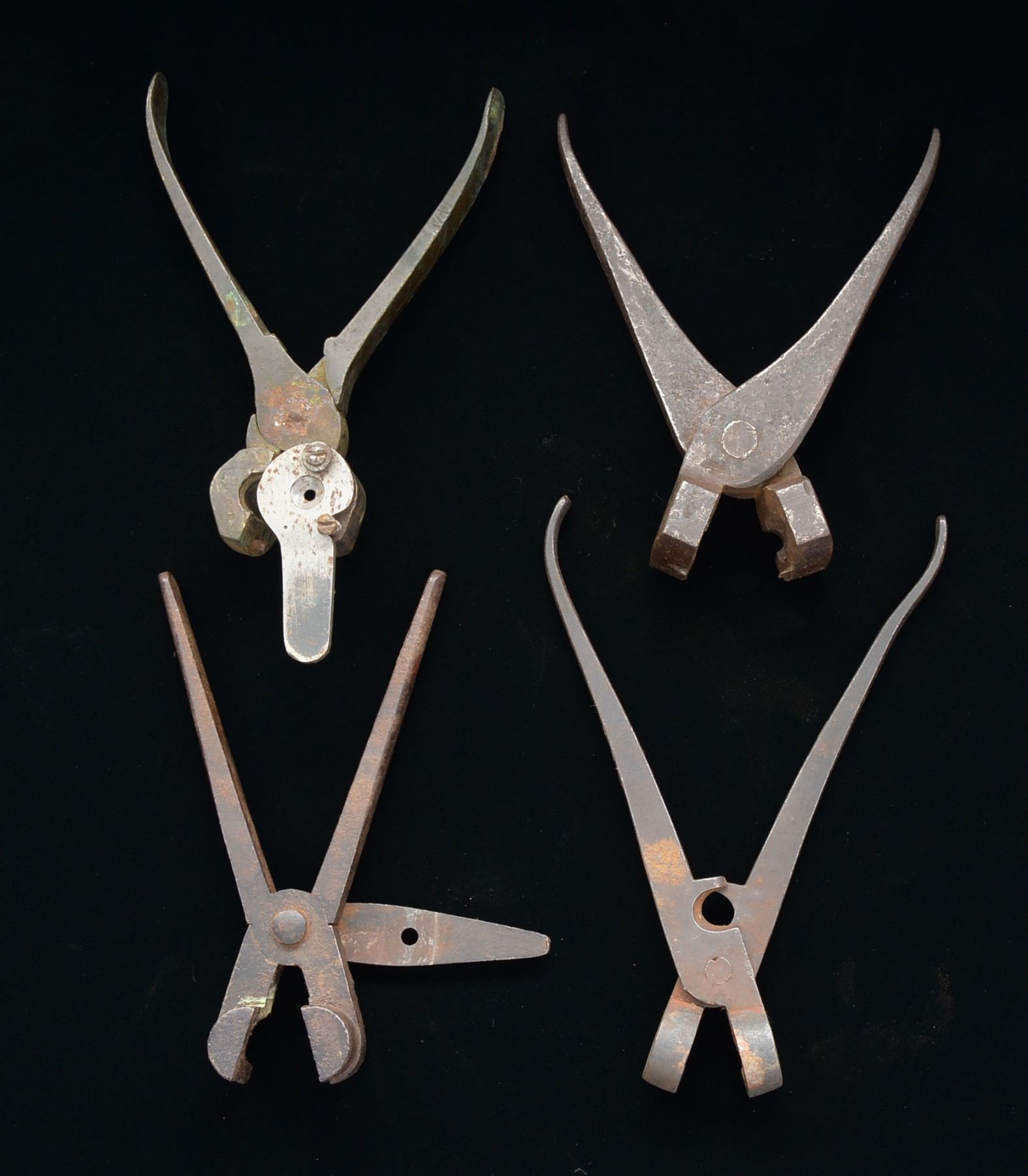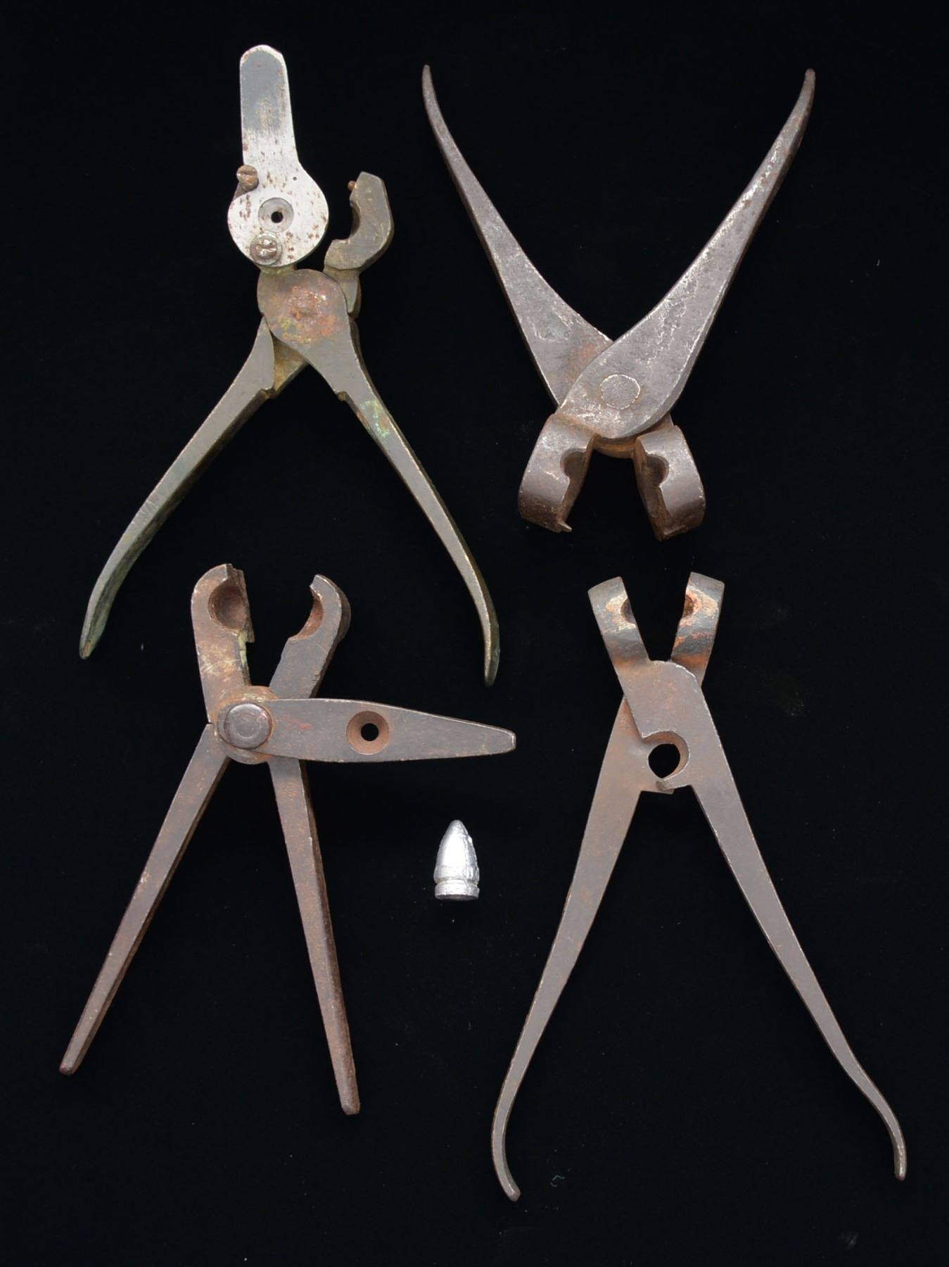 USED BULLET MOLDS. Four unique iron molds, one .58 cal. smooth sided “sugarloaf”, engraved “25” for bore corresponding to .58 cal. The 3 other molds are .45, .50 & .52 calibers, the .50 a picket & the other two look like CS carbine bullets. CONDITION: good to very good overall. Sprue cutter new on .52 & bullet molded w/ it accompanies. Iron molds show rust & pitting. PROVENANCE: Estate Collection of Dan Poppen. (02-13447-6/JS). $800-1,200.