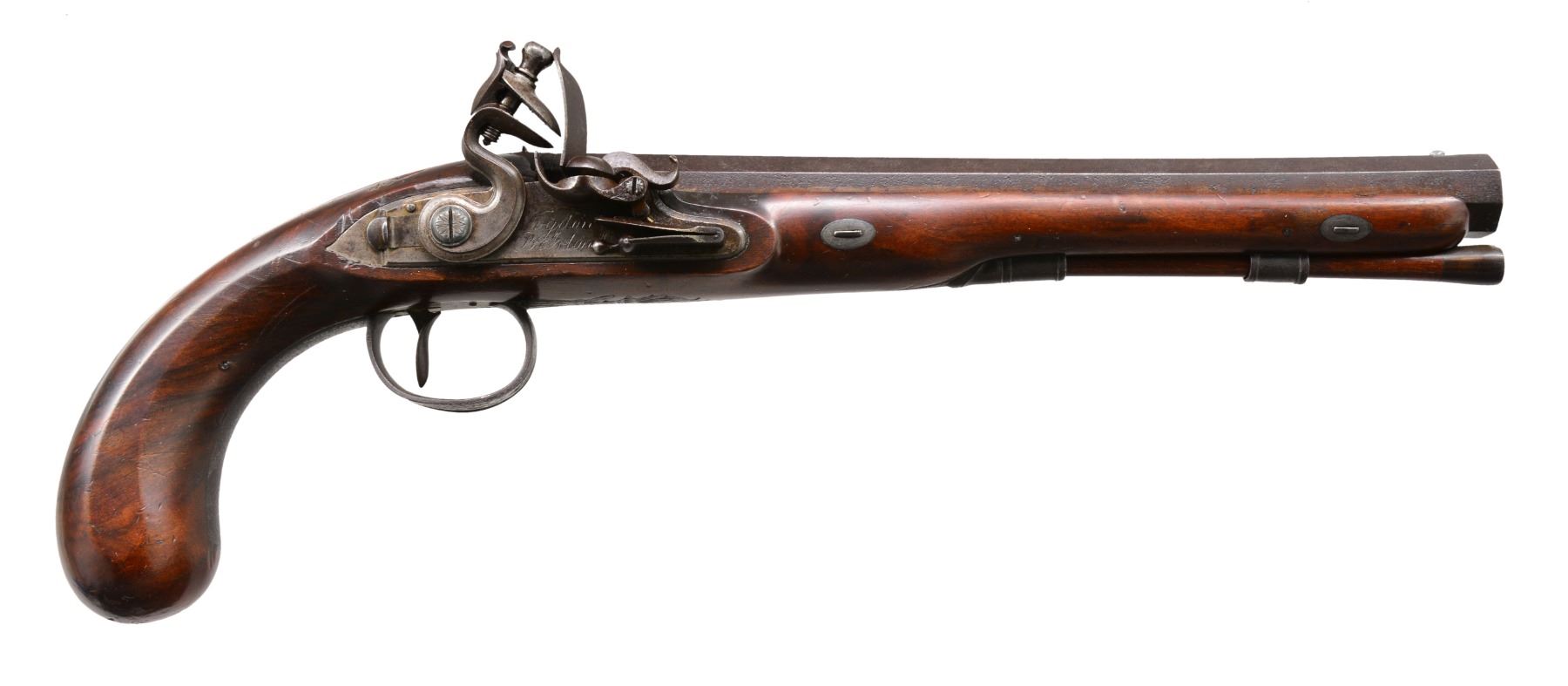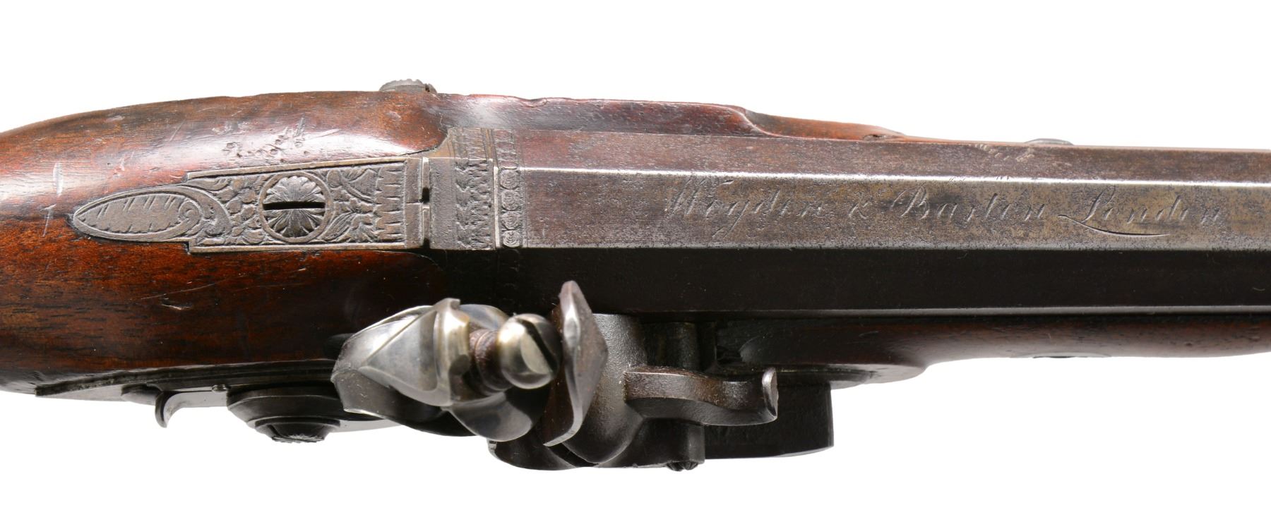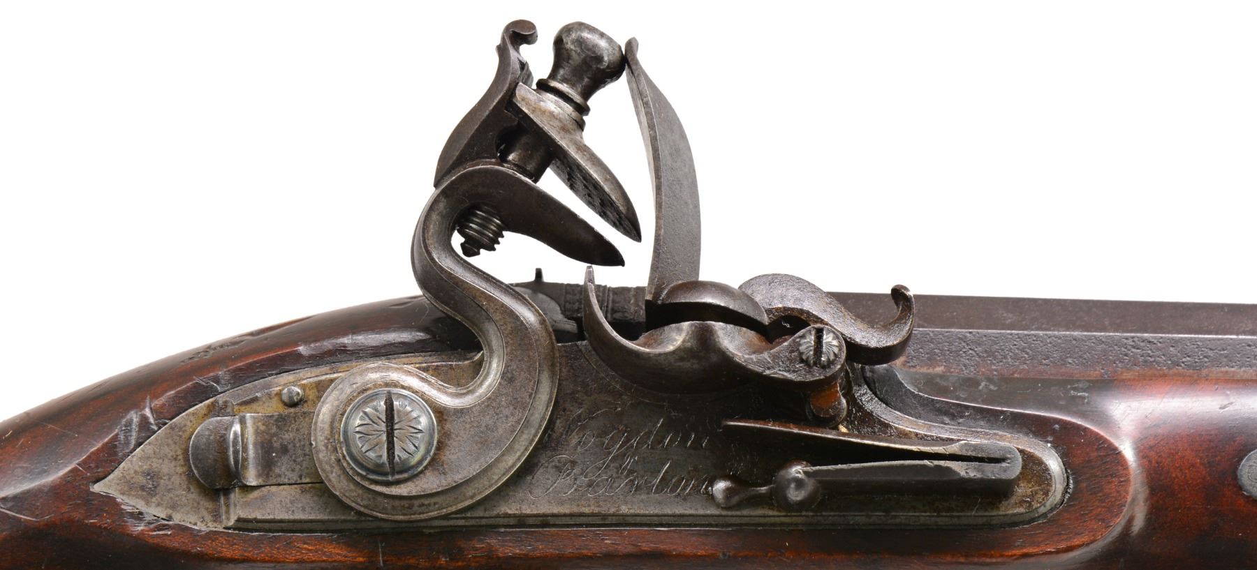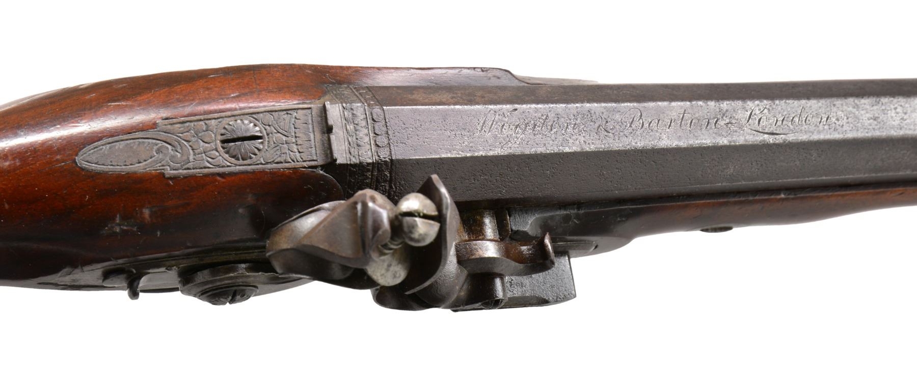 OFFICER'S PISTOLS BY WOGDON & BARTON, LONDON. Cal. 28 Bore (approx. 54 cal.) NSN. Pistols are 15" overall w/ 10" oct. slightly swamped bbls. w/ inset silver front sights & fixed rear sights. Bbls. are browned, locks case hardened & other iron mountings are blued. Bottom flats of bbls. have London proofs. Patent breeches are engraved & inlaid w/ platinum bands & have gold lined touch holes. Chambered lockplates w/ beveled lined edges are engraved forward of cock "WOGDON / & / BARTON" in script. Beveled serpentine cocks have matching lined border to lock & are fitted w/ back sliding safeties. Walnut stocks; each have 2 silver keyway escutcheons. Iron furniture is well fitted, trigger bows are engraved w/ panoplies of arms & trigger guard finials are engraved terminating in pineapples. UNATTACHED ACCESSORIES: mahogany case w/ dbl. hook closure & central brass faced lock. Lid is fitted w/ folding brass handle. Case is lined in green baize w/ several accessories including brass mounted rosewood cleaning rod, brass bag flask, screwdriver/vent cleanout combination tool, iron scissor mold & brass powder measure. CONDITION: very good overall. Guns appear complete & original w/ exception of replaced ramrod on 1 gun. Bbls. show traces of brown finish externally. Strong brown patina where protected under bbls., scattered pitting & brown overall. Locks show traces of case color & are smooth dark gray overall. Traces of bright blue are found on trigger guards w/ balance dark patina. Stocks are sound w/ sharp edges, scattered dings & dents, retaining much of their original oiled finish. Bores are fine, one showing light frosting. Locks are fine & functional. Casing is sound w/ old cracks in base, surface w/ staining. Lining soiled & worn w/ staining & sm. reductions. (01-17288/JS). ANTIQUE. $4,000-6,000.