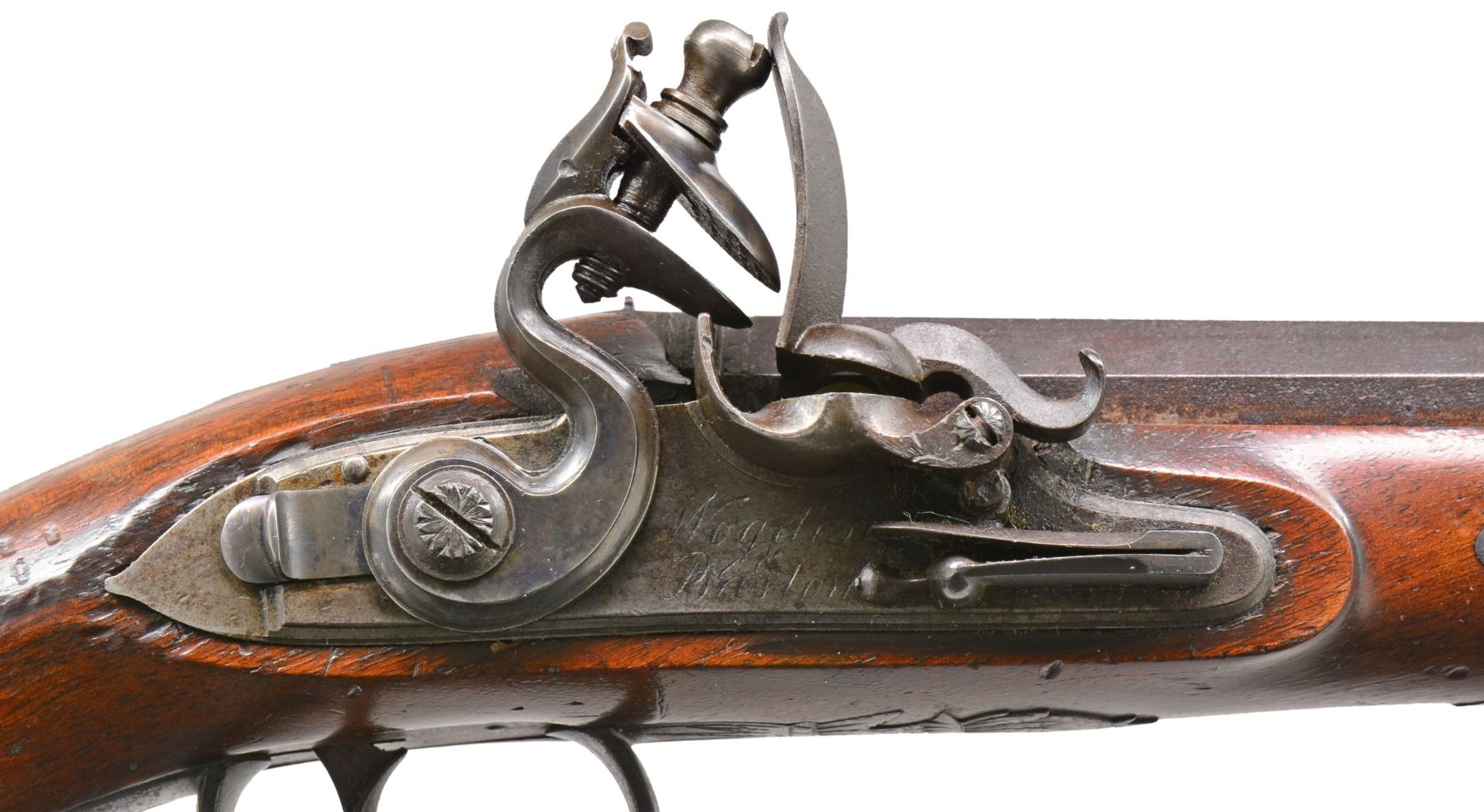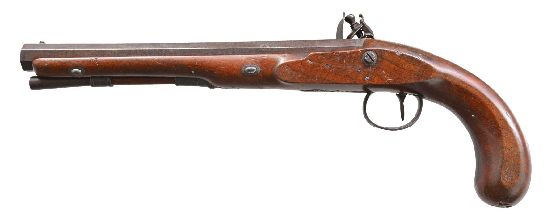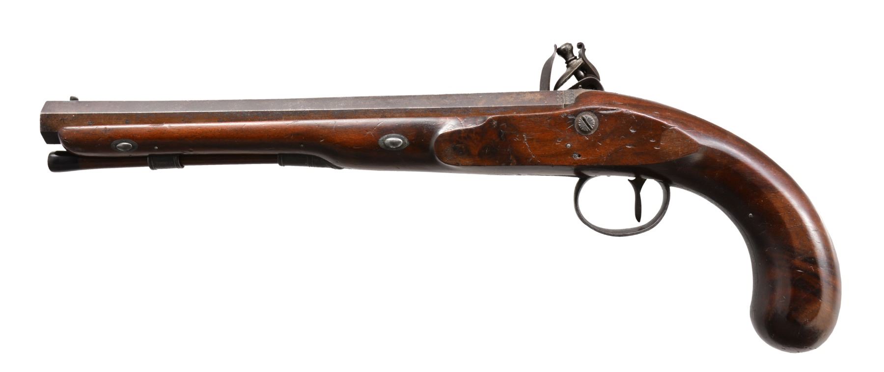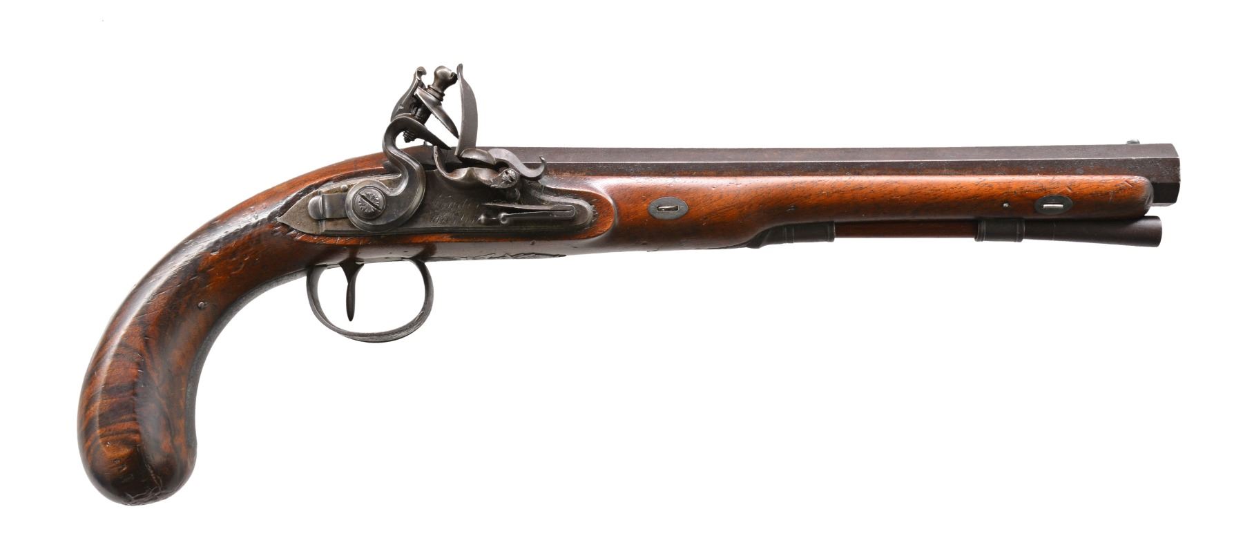 OFFICER'S PISTOLS BY WOGDON & BARTON, LONDON. Cal. 28 Bore (approx. 54 cal.) NSN. Pistols are 15" overall w/ 10" oct. slightly swamped bbls. w/ inset silver front sights & fixed rear sights. Bbls. are browned, locks case hardened & other iron mountings are blued. Bottom flats of bbls. have London proofs. Patent breeches are engraved & inlaid w/ platinum bands & have gold lined touch holes. Chambered lockplates w/ beveled lined edges are engraved forward of cock "WOGDON / & / BARTON" in script. Beveled serpentine cocks have matching lined border to lock & are fitted w/ back sliding safeties. Walnut stocks; each have 2 silver keyway escutcheons. Iron furniture is well fitted, trigger bows are engraved w/ panoplies of arms & trigger guard finials are engraved terminating in pineapples. UNATTACHED ACCESSORIES: mahogany case w/ dbl. hook closure & central brass faced lock. Lid is fitted w/ folding brass handle. Case is lined in green baize w/ several accessories including brass mounted rosewood cleaning rod, brass bag flask, screwdriver/vent cleanout combination tool, iron scissor mold & brass powder measure. CONDITION: very good overall. Guns appear complete & original w/ exception of replaced ramrod on 1 gun. Bbls. show traces of brown finish externally. Strong brown patina where protected under bbls., scattered pitting & brown overall. Locks show traces of case color & are smooth dark gray overall. Traces of bright blue are found on trigger guards w/ balance dark patina. Stocks are sound w/ sharp edges, scattered dings & dents, retaining much of their original oiled finish. Bores are fine, one showing light frosting. Locks are fine & functional. Casing is sound w/ old cracks in base, surface w/ staining. Lining soiled & worn w/ staining & sm. reductions. (01-17288/JS). ANTIQUE. $4,000-6,000.