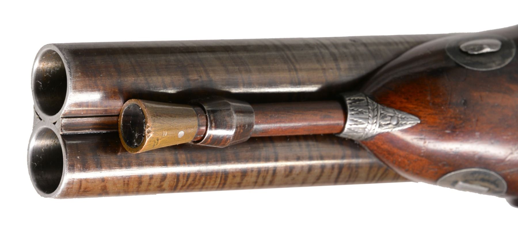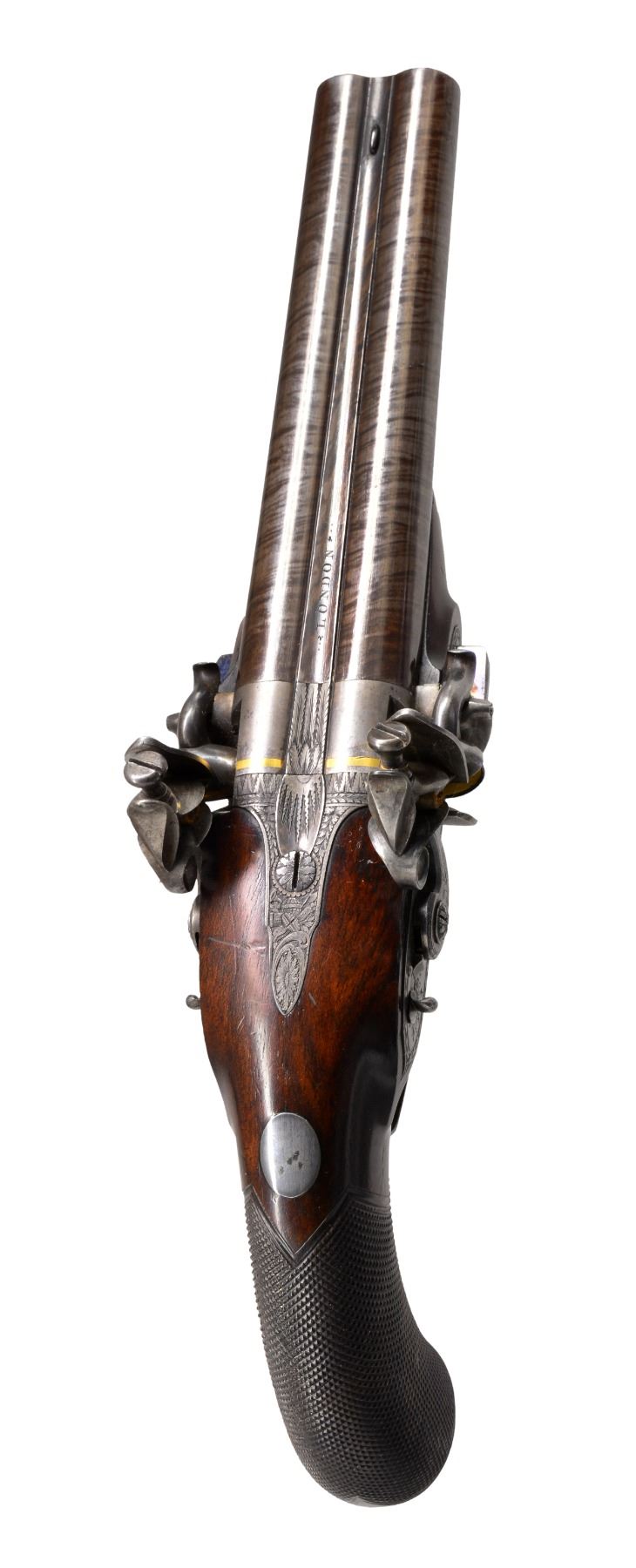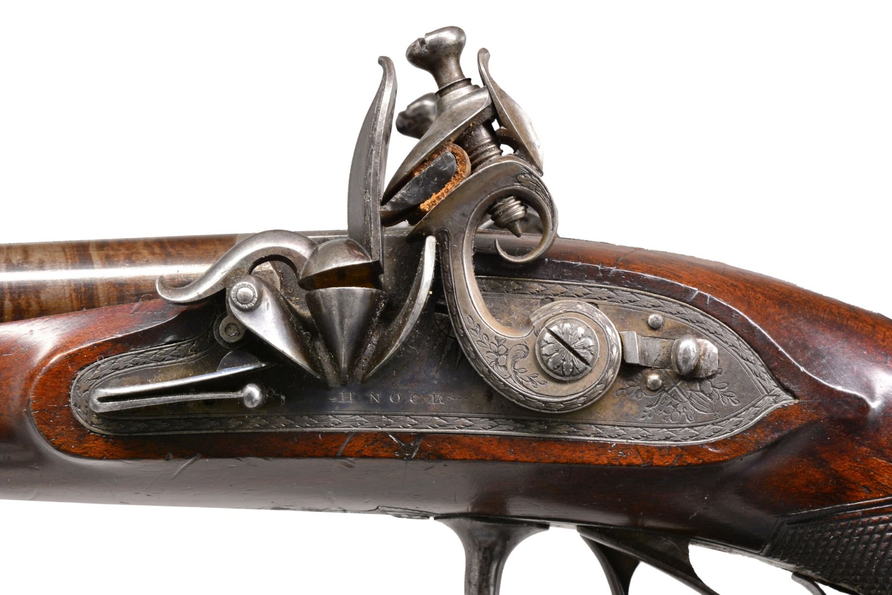 CIRCA 1790. Cal. 25 Bore (approx. .577). NSN. Dbl. bbl. flint pistol of the highest quality. 7" Rnd. twist bbls. w/ brown striping. Central rib engraved "LONDON". Patent breech inlaid w/ gold band. Gold lined touch holes. A stand of arms is engraved on the breech irons. Elegant lock plates have feathered edges w/ inwardly curved tails to match contour of stock. Unique cocks have scrolled tails & are engraved en suite w/ beveled feathered borders. Stand of arms engraving at back portion of plates & "H NOCK" (Henry Nock 1741-1804) is under waterproof gold lined pans. Frizzens are unbridled w/ patent rollers & have feathered borders. Iron trigger guard is very nicely finished & engraved w/ panoply of arms on bow w/ feathered border & stylized urn & pineapple finial. Finely engraved silver rear thimble, silver oval keyway escutcheons & void silver oval thumb plate complete furniture. The trigger guard & forward iron thimble are fire blued. Wood ramrod has brass tip & fitted iron screw on other end. European walnut stock has wraparound checkering at wrist w/ zig zag border on top. Henry Nock was not as well known as a couple of his contemporaries such as Durs Egg, for mfg. of non military arms. The quality represented here shows his ability to make the most elegant & high quality firearms. CONDITION: extremely fine. Bbls. retain virtually all of their bright striping w/ wear at muzzle end. Breech, lock, cocks & frizzens retain strong traces of case colors w/ balance silver/gray patina. Trigger guard & frizzen springs retain approx. 30% of their bright fire blue w/ balance silver/gray patina. Stock is fine, well fit, sharp edges, minor cosmetic blemishes. Mechanically like new. Crisp actions, bright shiny smooth bores. (01-17277/JS). ANTIQUE. $6,000-8,000.