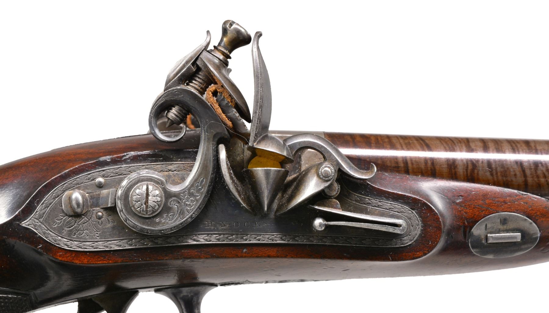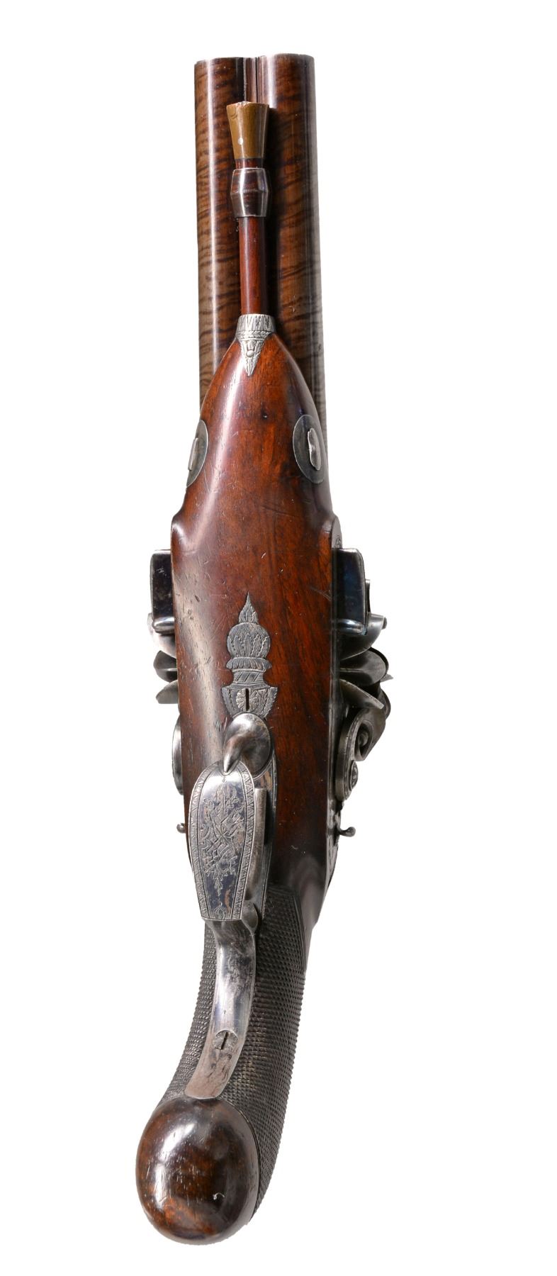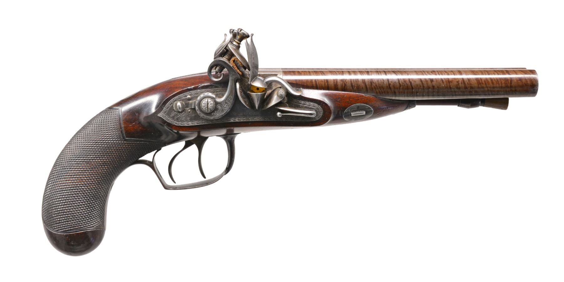 CIRCA 1790. Cal. 25 Bore (approx. .577). NSN. Dbl. bbl. flint pistol of the highest quality. 7" Rnd. twist bbls. w/ brown striping. Central rib engraved "LONDON". Patent breech inlaid w/ gold band. Gold lined touch holes. A stand of arms is engraved on the breech irons. Elegant lock plates have feathered edges w/ inwardly curved tails to match contour of stock. Unique cocks have scrolled tails & are engraved en suite w/ beveled feathered borders. Stand of arms engraving at back portion of plates & "H NOCK" (Henry Nock 1741-1804) is under waterproof gold lined pans. Frizzens are unbridled w/ patent rollers & have feathered borders. Iron trigger guard is very nicely finished & engraved w/ panoply of arms on bow w/ feathered border & stylized urn & pineapple finial. Finely engraved silver rear thimble, silver oval keyway escutcheons & void silver oval thumb plate complete furniture. The trigger guard & forward iron thimble are fire blued. Wood ramrod has brass tip & fitted iron screw on other end. European walnut stock has wraparound checkering at wrist w/ zig zag border on top. Henry Nock was not as well known as a couple of his contemporaries such as Durs Egg, for mfg. of non military arms. The quality represented here shows his ability to make the most elegant & high quality firearms. CONDITION: extremely fine. Bbls. retain virtually all of their bright striping w/ wear at muzzle end. Breech, lock, cocks & frizzens retain strong traces of case colors w/ balance silver/gray patina. Trigger guard & frizzen springs retain approx. 30% of their bright fire blue w/ balance silver/gray patina. Stock is fine, well fit, sharp edges, minor cosmetic blemishes. Mechanically like new. Crisp actions, bright shiny smooth bores. (01-17277/JS). ANTIQUE. $6,000-8,000.