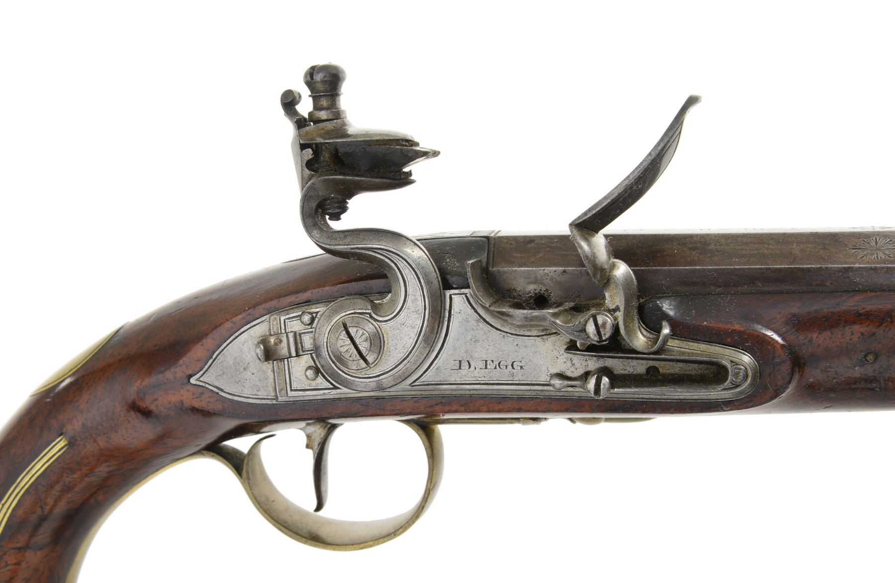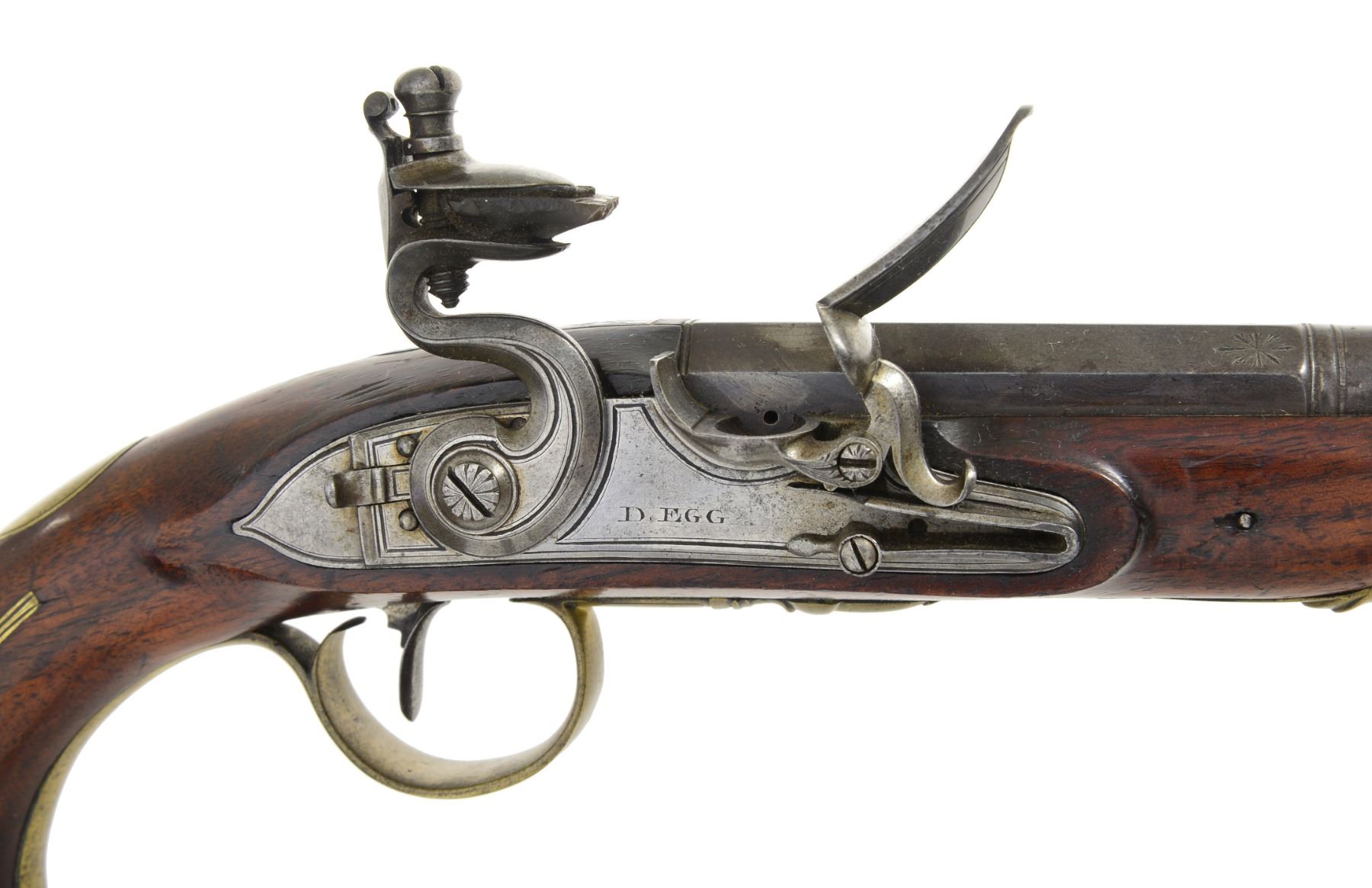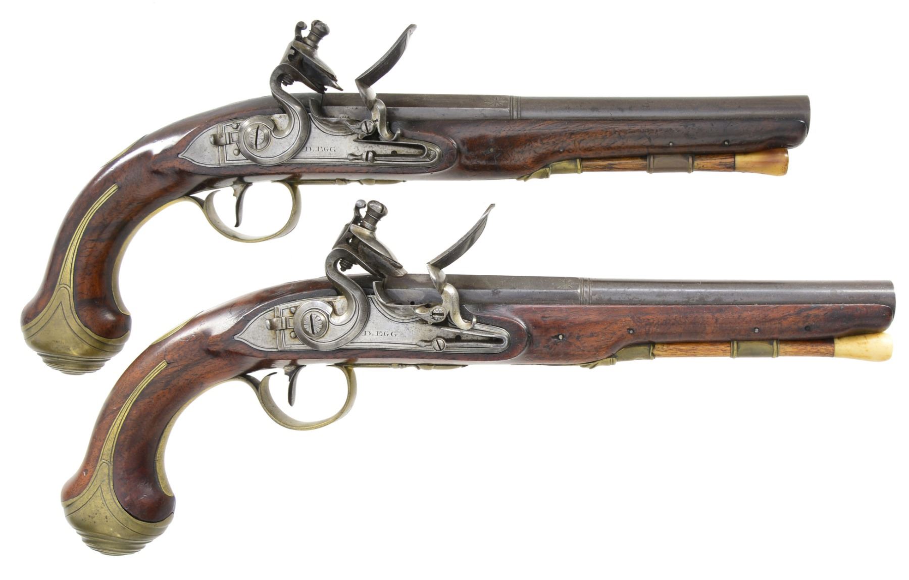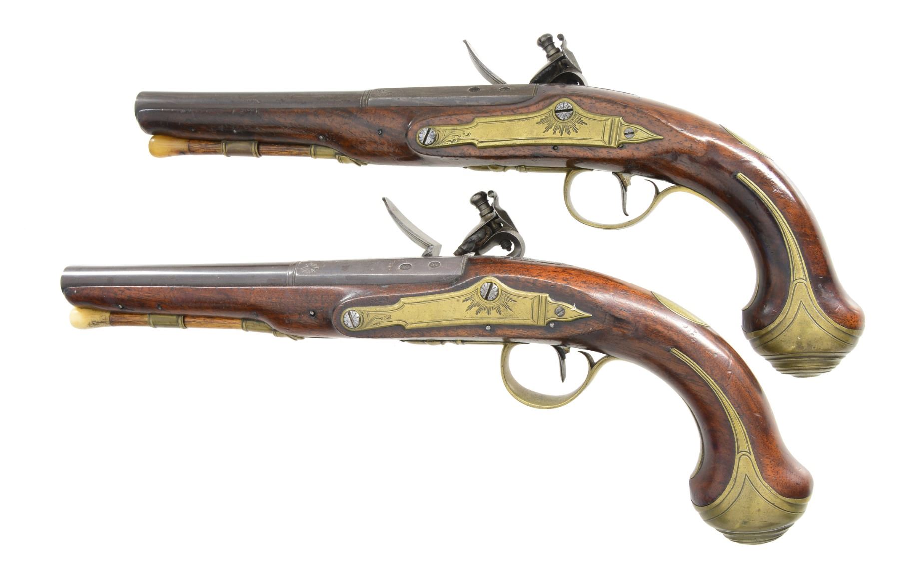 1805. Cals.22 bore (about 60). Both NSN. A fine pair of gentleman’s pistols by among the most revered London gunmaker of his day Durs Egg (1748-1831). Bbls. 8" oct. to rnd. w/ wedding ring transitions, top flats marked "D. EGG - LONDON" and starburst engraving on upper 3 flats, London proofs on left rear flat. Breech iron has armorial & floral engraving with edge line borders en suite with chamfered locks w/ rear sliding safeties signed under pans “D. EGG”. Cocks and bridled frizzens are border edge engraved en suite. Lightly figured European walnut have brass furniture with border edge lined engraved en suite. Sideplate, buttcap, and trigger bow are florally engraved. Trigger guard terminates into acorn shaped finial. Wrists are fitted w/ vacant large oval brass thumb plates. Hardwood ramrods have bone tips. CONDITION: Fine overall, all matching and original, clear markings though one address a bit weak from typical early bbl. refinish, retaining 90% thin striped re-browned bbls. and breech irons. Locks & cocks are overall bright/gray. Pin-prick pitting around breeches, stocks well fit with hand worn patina with most of their original varnish though thinning. Brass has medium mustard patina. Mechanically crisp with bright smooth bores, one bbl. has scattered pitting. PROVENANCE: Estate Collection of George W. Browning. (01-16138 (2)/DS). ANTIQUE. $5,000-9,000.