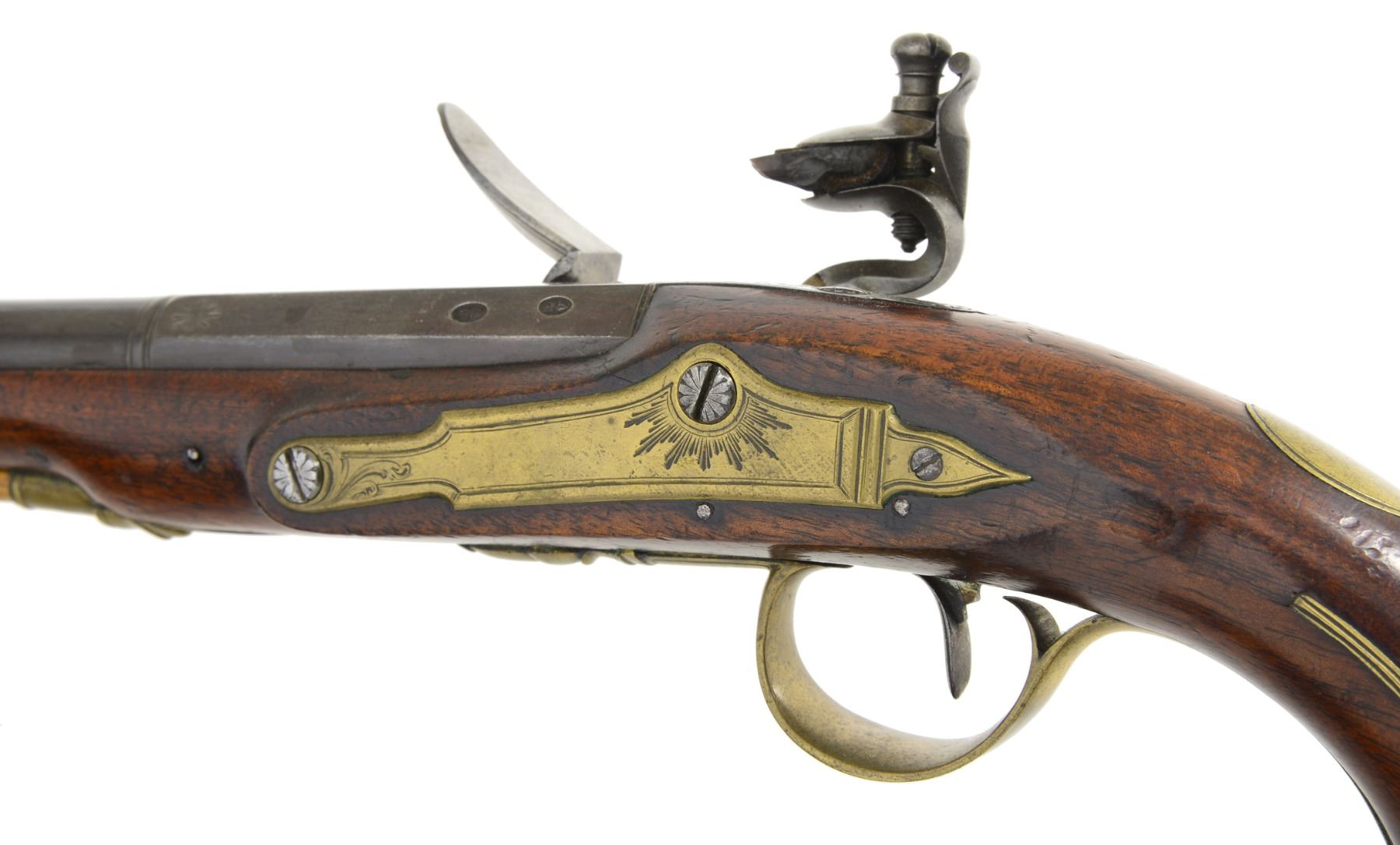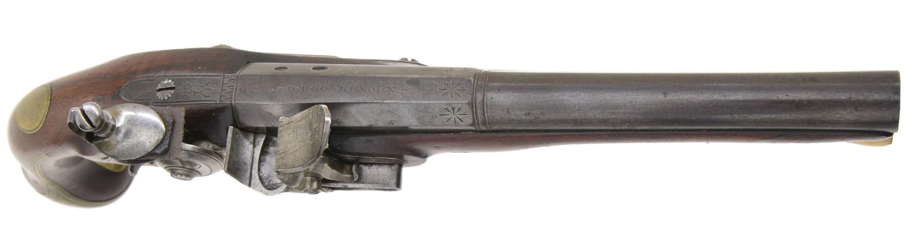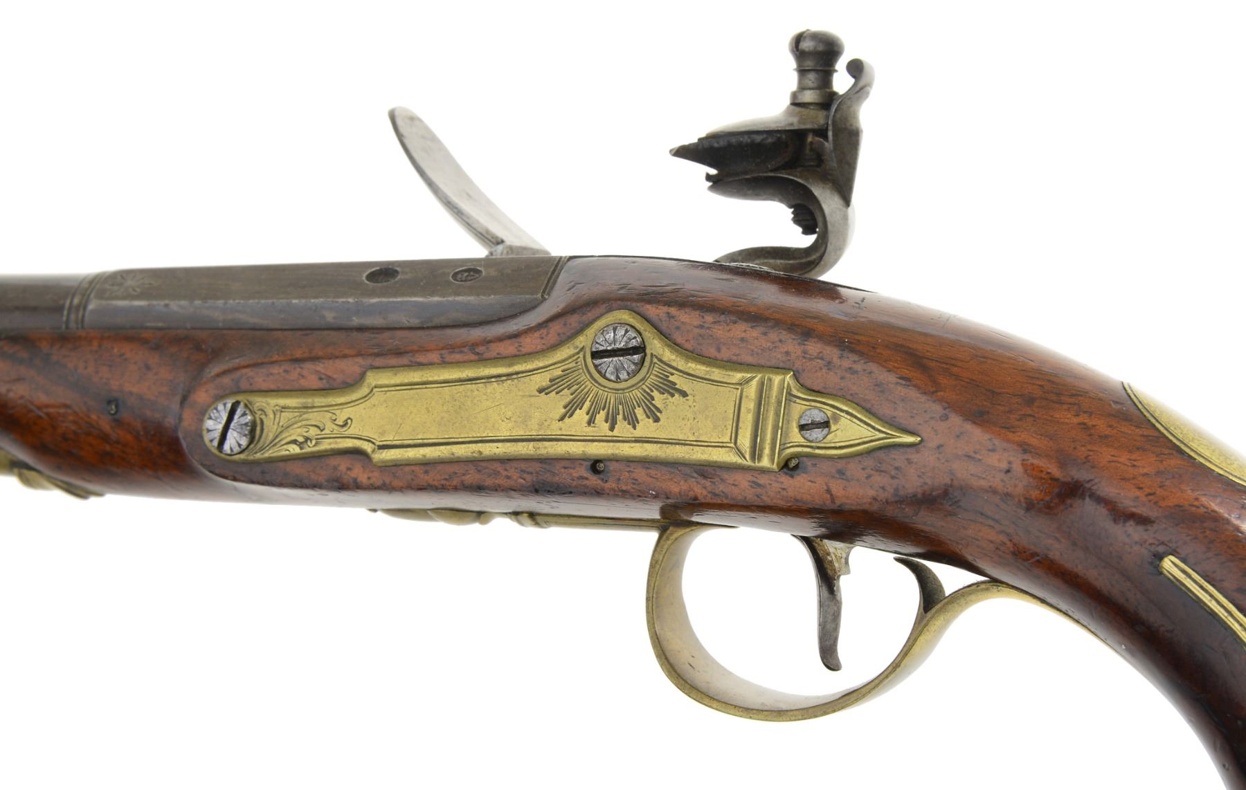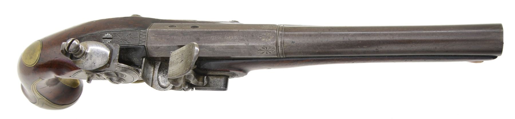 1805. Cals.22 bore (about 60). Both NSN. A fine pair of gentleman’s pistols by among the most revered London gunmaker of his day Durs Egg (1748-1831). Bbls. 8" oct. to rnd. w/ wedding ring transitions, top flats marked "D. EGG - LONDON" and starburst engraving on upper 3 flats, London proofs on left rear flat. Breech iron has armorial & floral engraving with edge line borders en suite with chamfered locks w/ rear sliding safeties signed under pans “D. EGG”. Cocks and bridled frizzens are border edge engraved en suite. Lightly figured European walnut have brass furniture with border edge lined engraved en suite. Sideplate, buttcap, and trigger bow are florally engraved. Trigger guard terminates into acorn shaped finial. Wrists are fitted w/ vacant large oval brass thumb plates. Hardwood ramrods have bone tips. CONDITION: Fine overall, all matching and original, clear markings though one address a bit weak from typical early bbl. refinish, retaining 90% thin striped re-browned bbls. and breech irons. Locks & cocks are overall bright/gray. Pin-prick pitting around breeches, stocks well fit with hand worn patina with most of their original varnish though thinning. Brass has medium mustard patina. Mechanically crisp with bright smooth bores, one bbl. has scattered pitting. PROVENANCE: Estate Collection of George W. Browning. (01-16138 (2)/DS). ANTIQUE. $5,000-9,000.