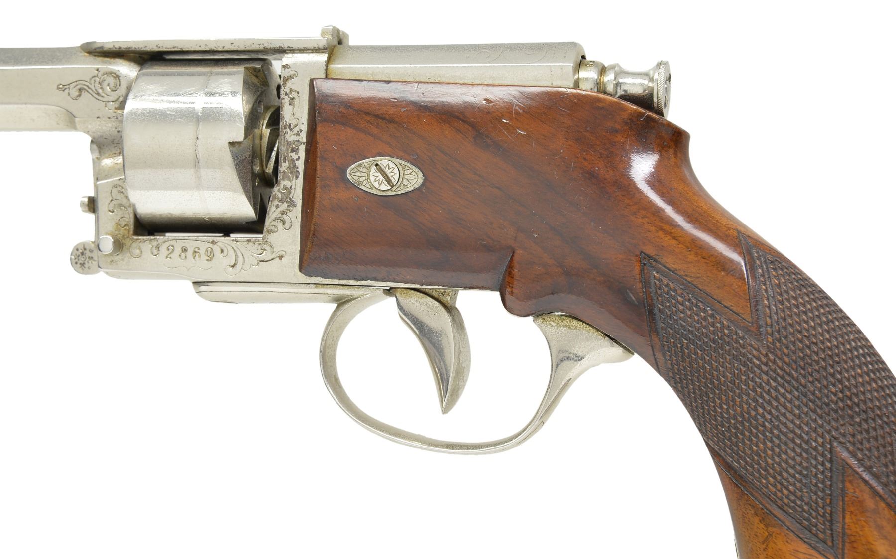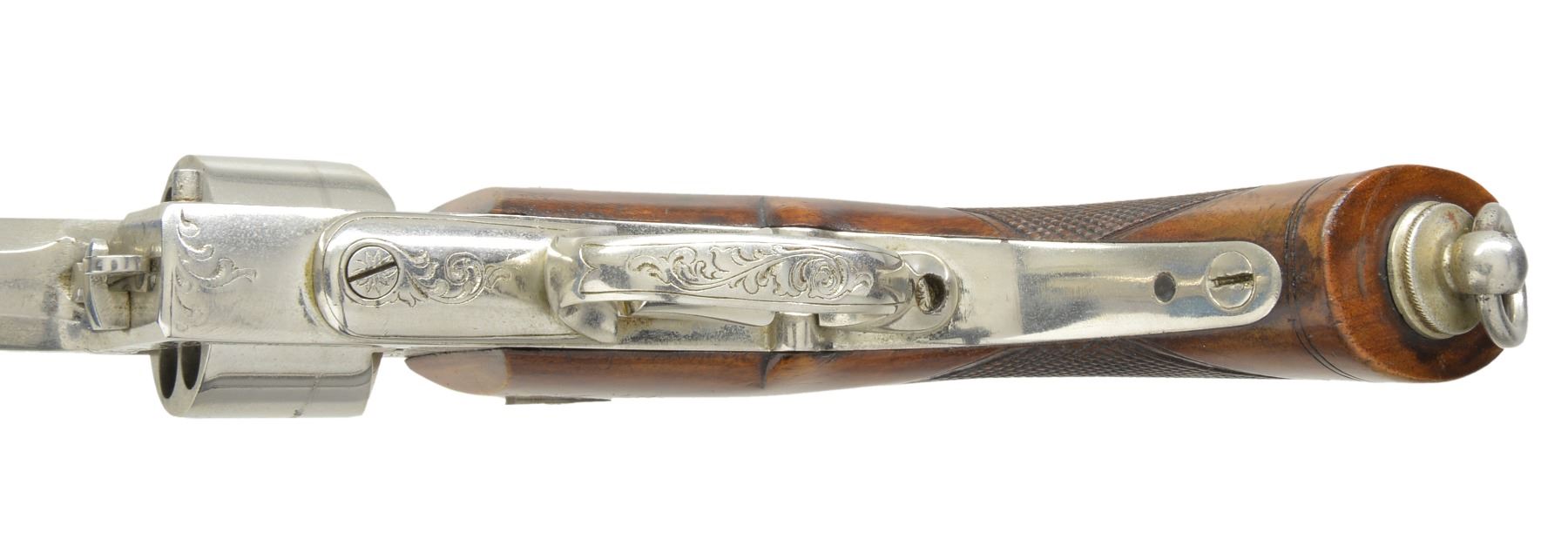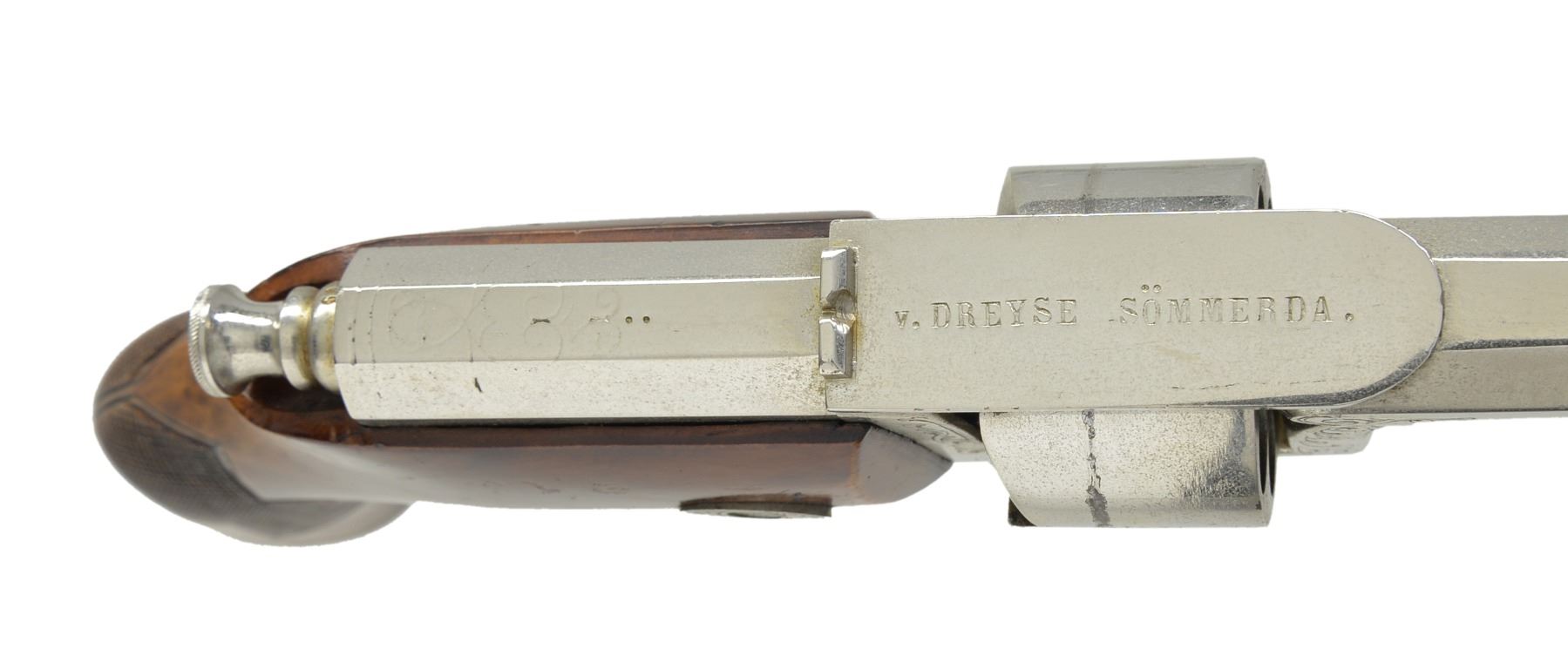 Cal. .39 4 1/2 Cent, Prussian cal. measurement equals .43 cal. for 11.5 gr. of black powder. S# 2869. Bbl. 4 11/16" oct. w/ drift adj. semi circular front sight & fixed V notch rear sight. Patented by GL Kufahl of United Kingdom in 1852. Total production of approx. 11,000 guns. Top strap has "V. DREYSE SOMMARDA" markings confirming mfg. before 1864. 6 Shot cyl. Double Action only. Added full nickel finish w/ engraved scroll highlights on frame & trigger guard. 1 Piece checkered walnut grip w/ lanyard ring at butt. CONDITION: retains over 90% nickel finish showing scratches, cyl. drag line & sm. areas of flaking. Original grip finish shows wear spots & handling marks. Needle is intact. Bore retains strong rifling showing spots of scattered pitting. (01-17071/DS). ANTIQUE. $5,000-7,500.