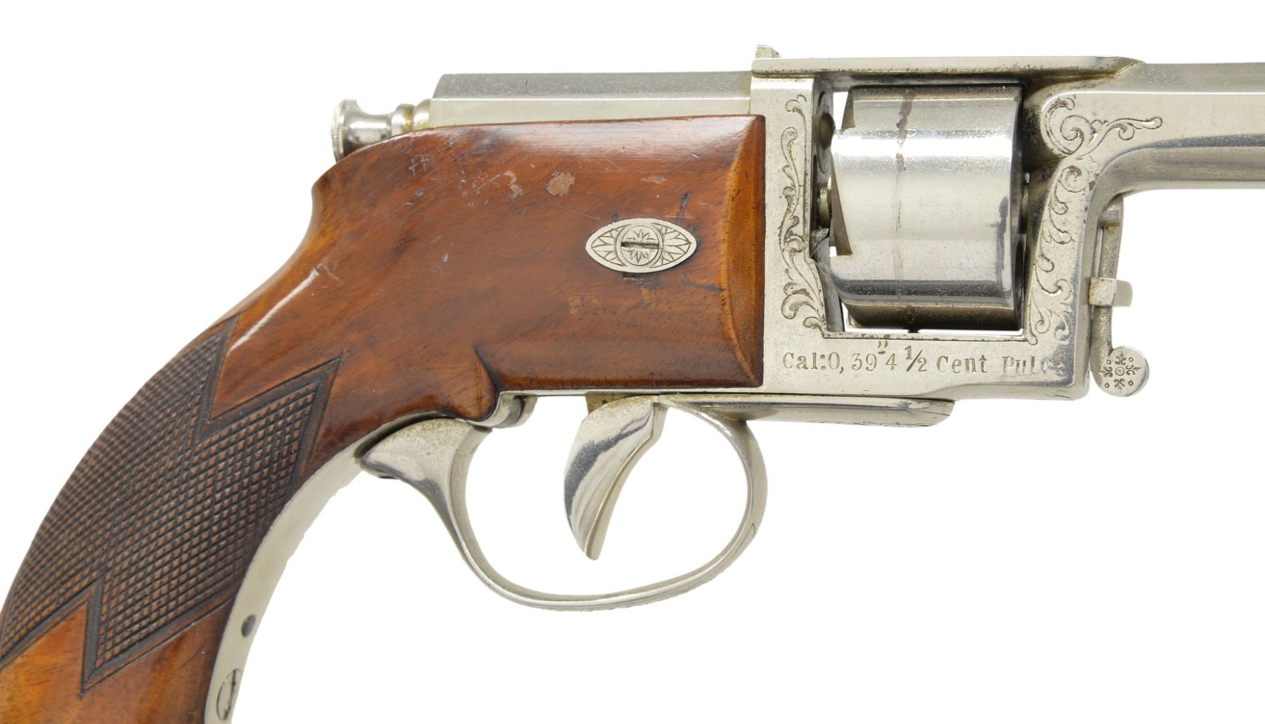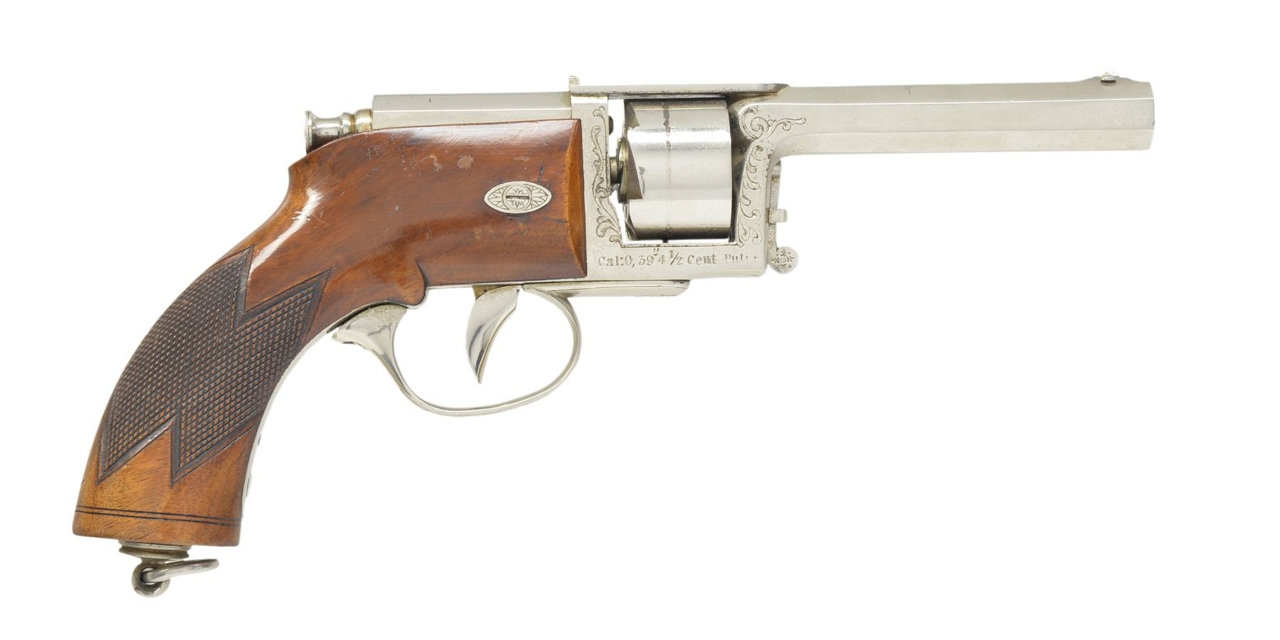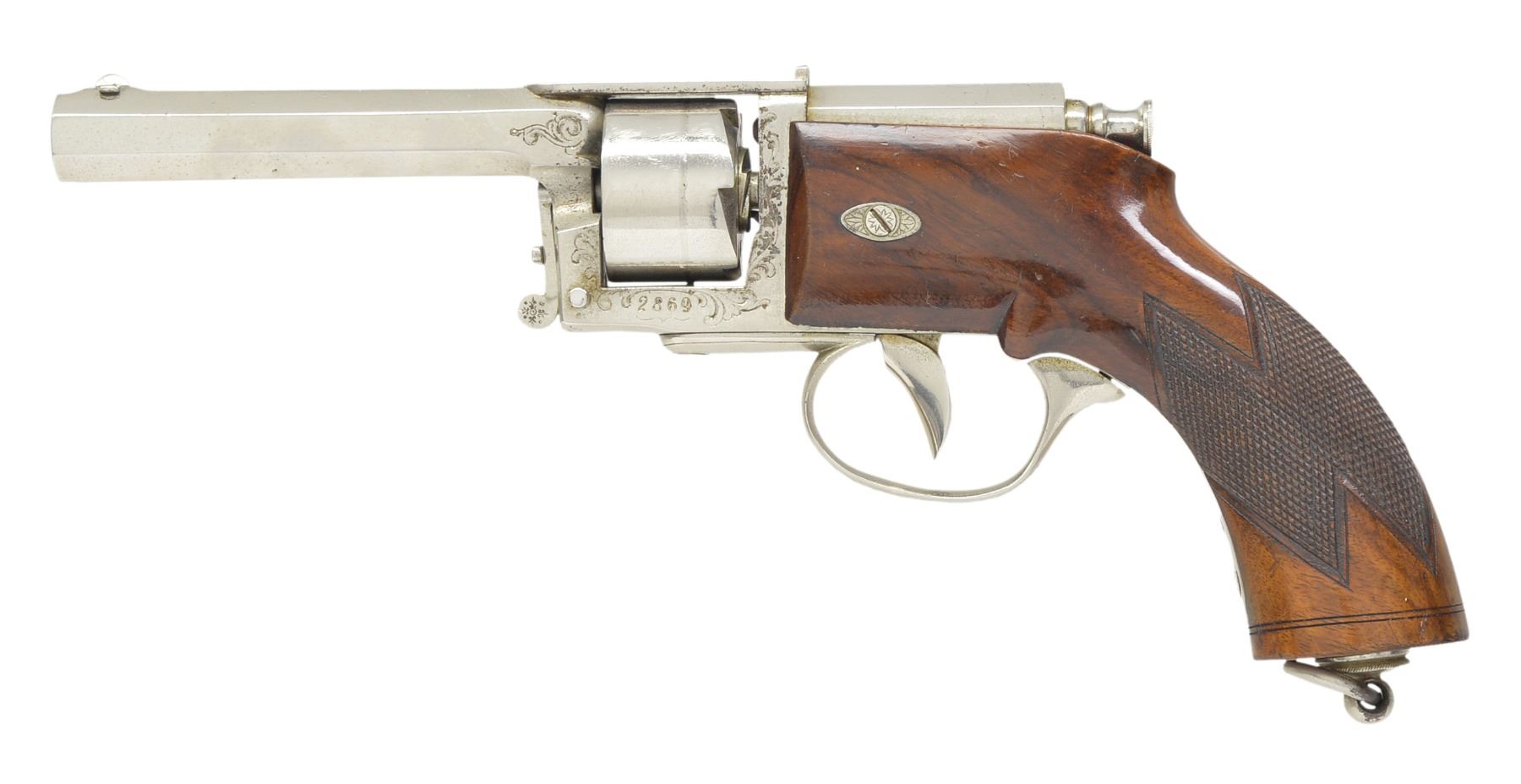 Cal. .39 4 1/2 Cent, Prussian cal. measurement equals .43 cal. for 11.5 gr. of black powder. S# 2869. Bbl. 4 11/16" oct. w/ drift adj. semi circular front sight & fixed V notch rear sight. Patented by GL Kufahl of United Kingdom in 1852. Total production of approx. 11,000 guns. Top strap has "V. DREYSE SOMMARDA" markings confirming mfg. before 1864. 6 Shot cyl. Double Action only. Added full nickel finish w/ engraved scroll highlights on frame & trigger guard. 1 Piece checkered walnut grip w/ lanyard ring at butt. CONDITION: retains over 90% nickel finish showing scratches, cyl. drag line & sm. areas of flaking. Original grip finish shows wear spots & handling marks. Needle is intact. Bore retains strong rifling showing spots of scattered pitting. (01-17071/DS). ANTIQUE. $5,000-7,500.
