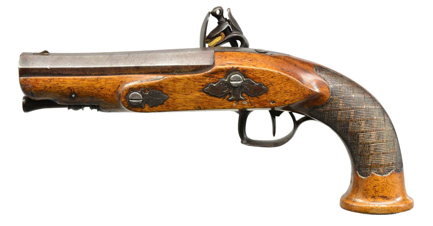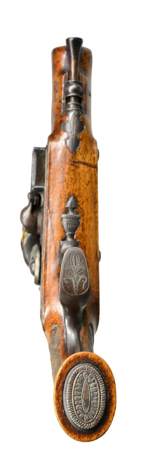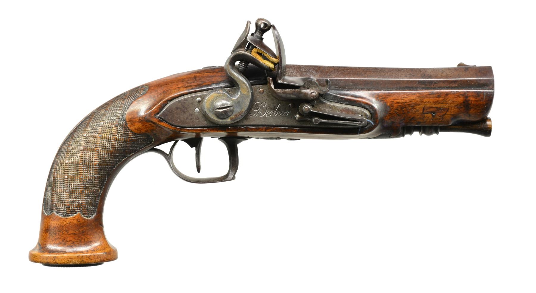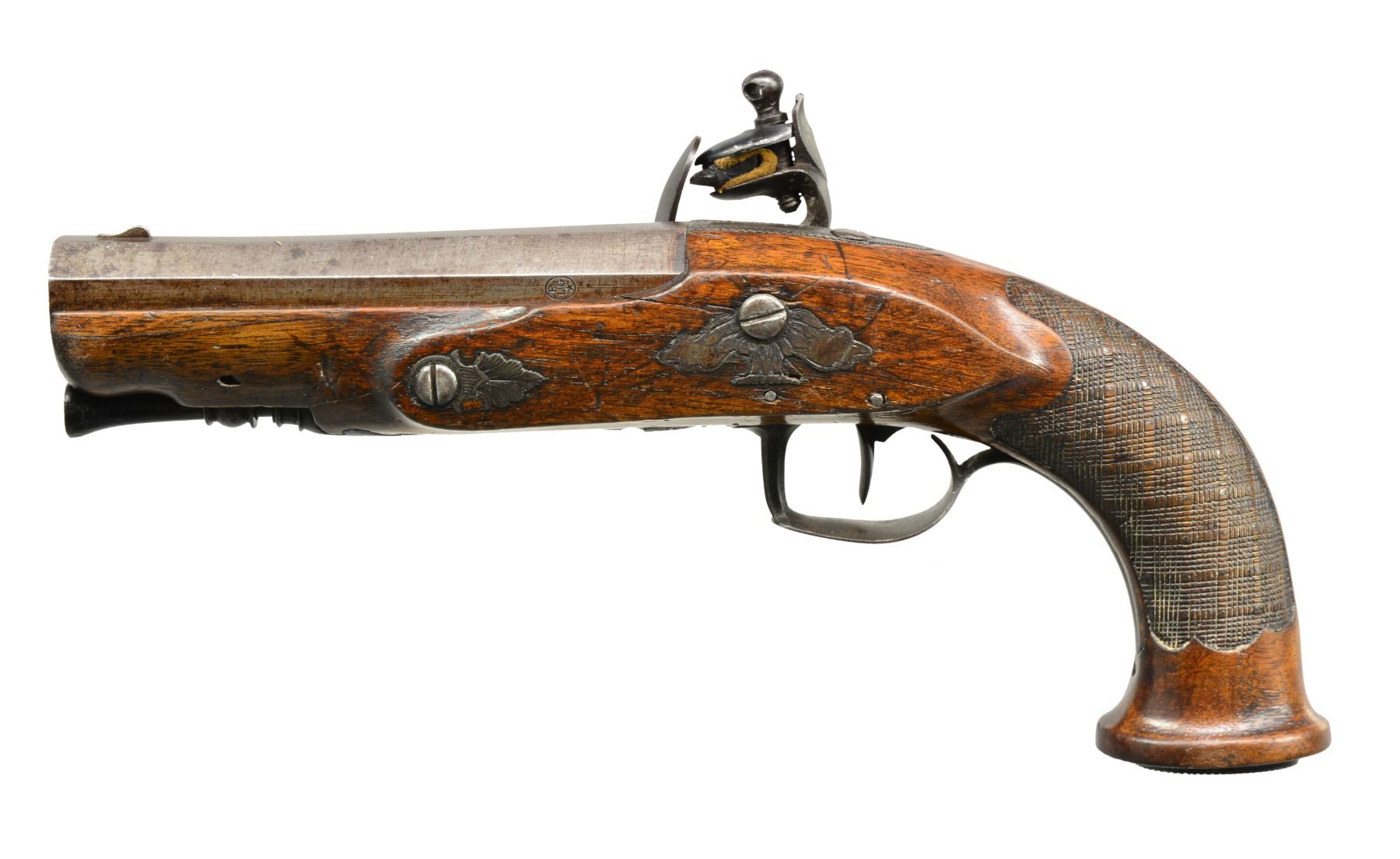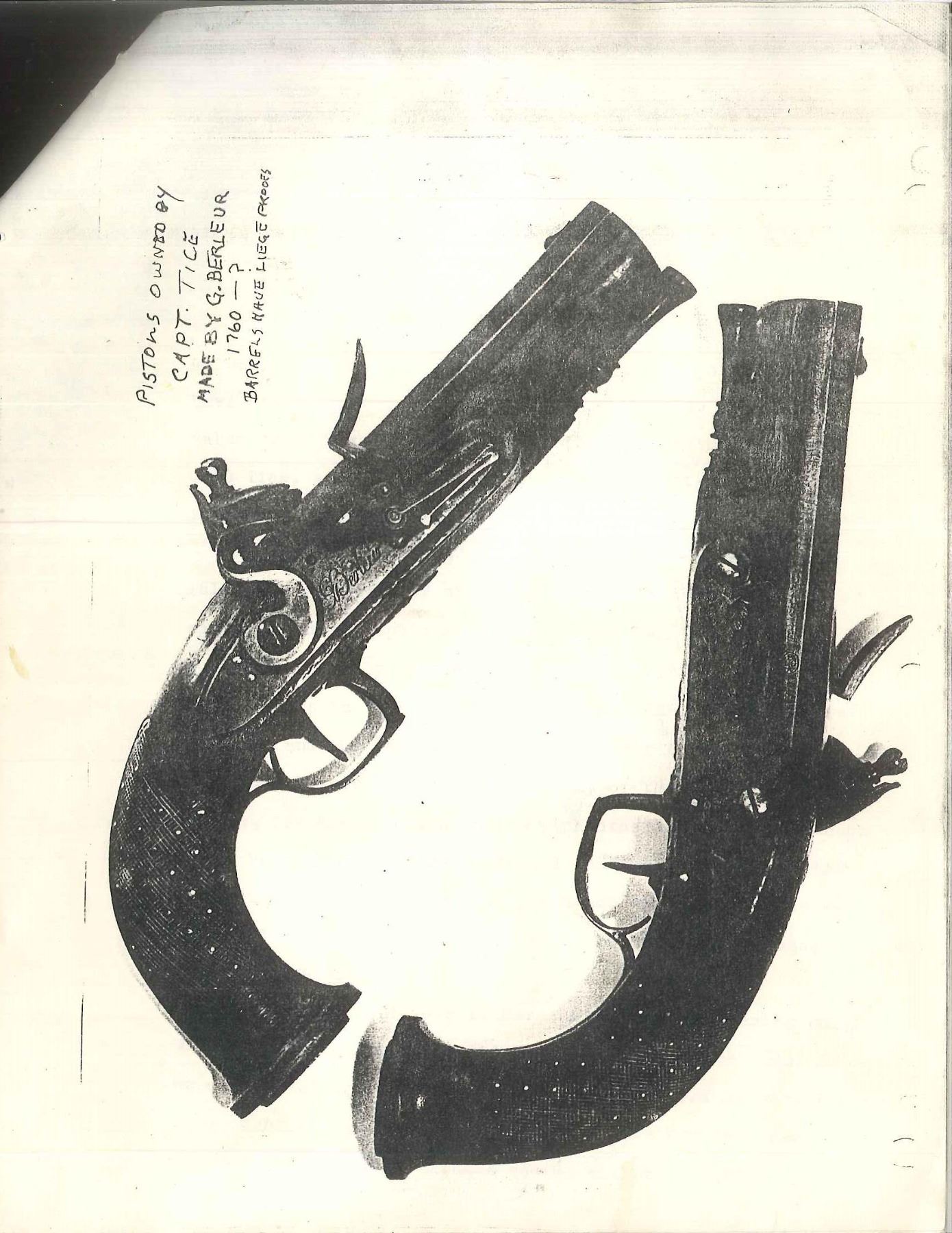 USED BY CAPTAIN JOHN TICE, BRITISH ARMY WITH PROVENANCE. Cal. 65. NSN. 9 3/4" Overall. Bbls. 4 3/4" oct. twist micro groove rifled w/ Liege proofs on left side of breeches & unlined touch holes. Locks signed "Berdeux" under pans. Trigger guards w/ engraved bows, stylized urn finials w/ engraved thimbles en suite. Walnut stocks have textured checkered grips w/ silver pins w/ oval engraved butt caps. Carved ramrods have cupped tips. UNATTACHED ACCESSORIES: several letters, the earliest written in 1925 telling a bit of history of writer’s great grandfather Capt. John Tice & his involvement of battle of Waterloo. CONDITION: very good to fine overall, appears all original & complete. Iron has smooth gray patina, silver pins dark silver patina, wood retains much of their original varnish. Mechanically fine w/ well defined rifled bores. (01-17231/JS). ANTIQUE. $2,500-3,000.