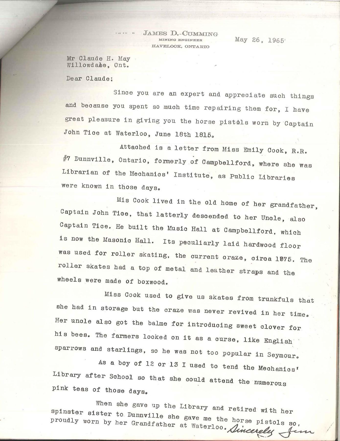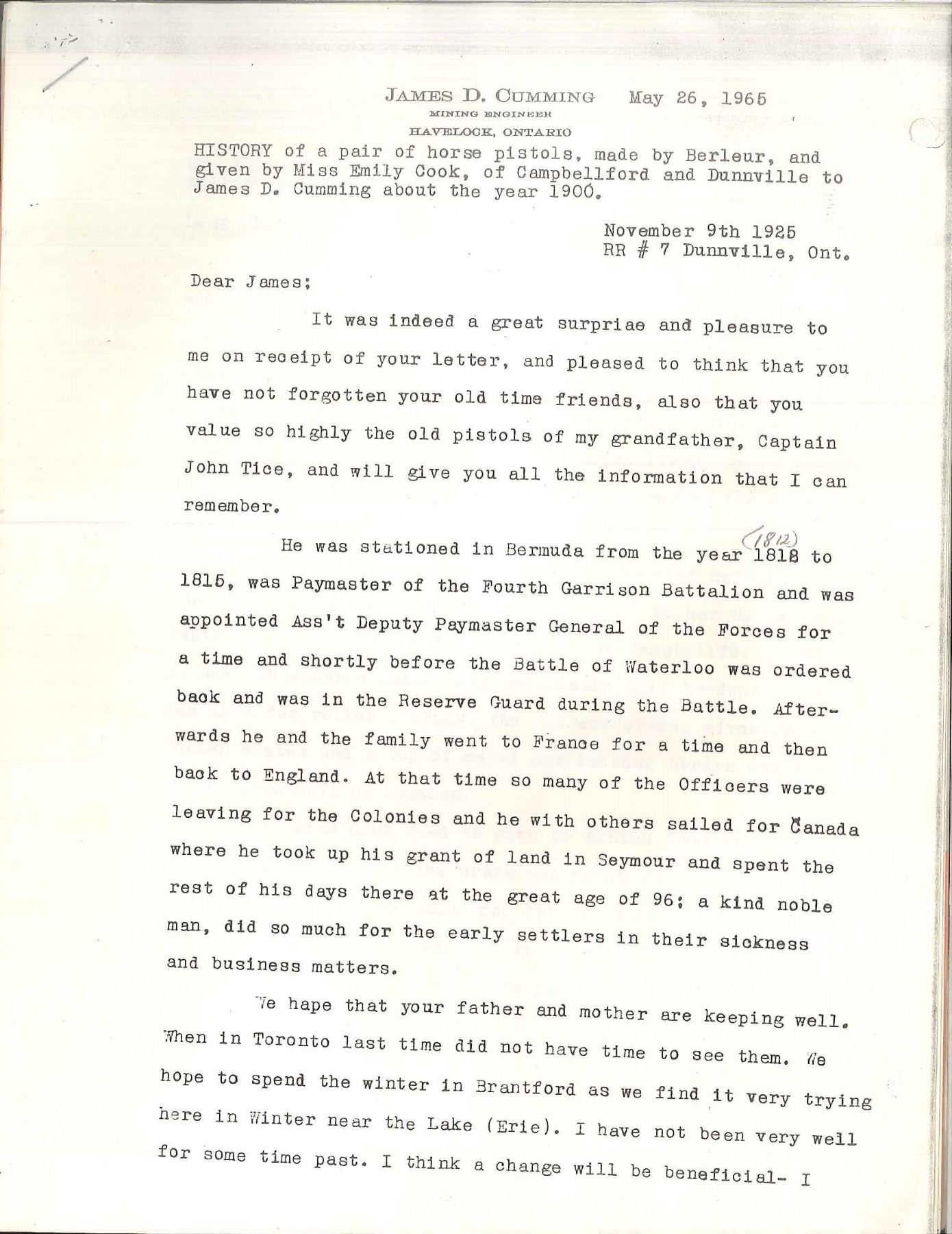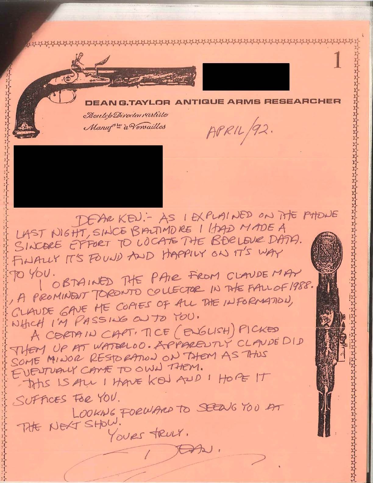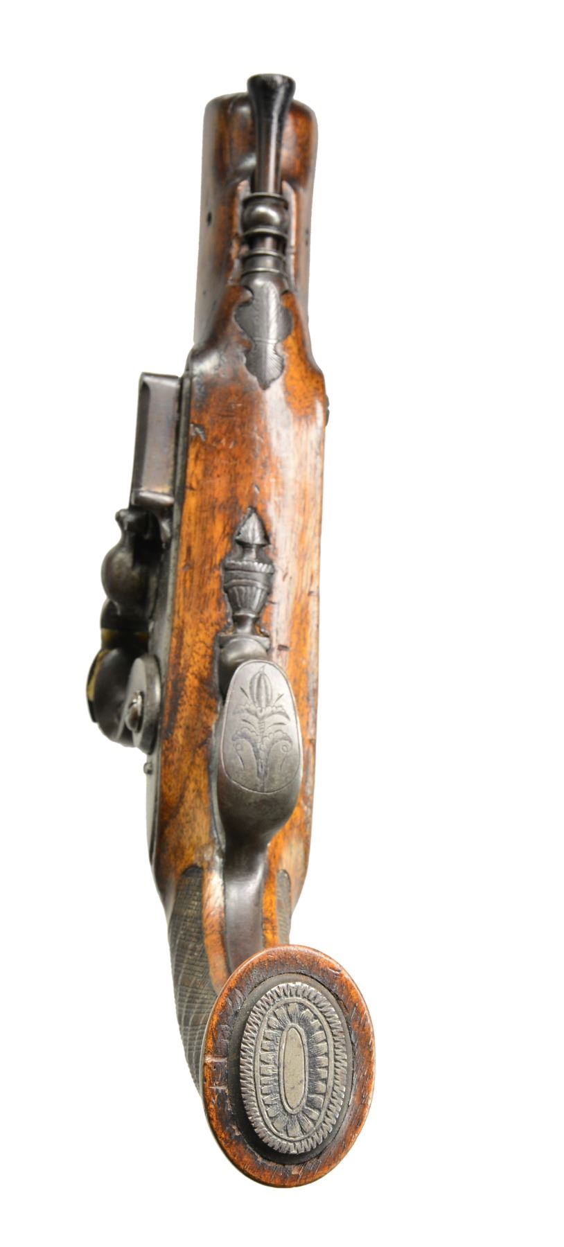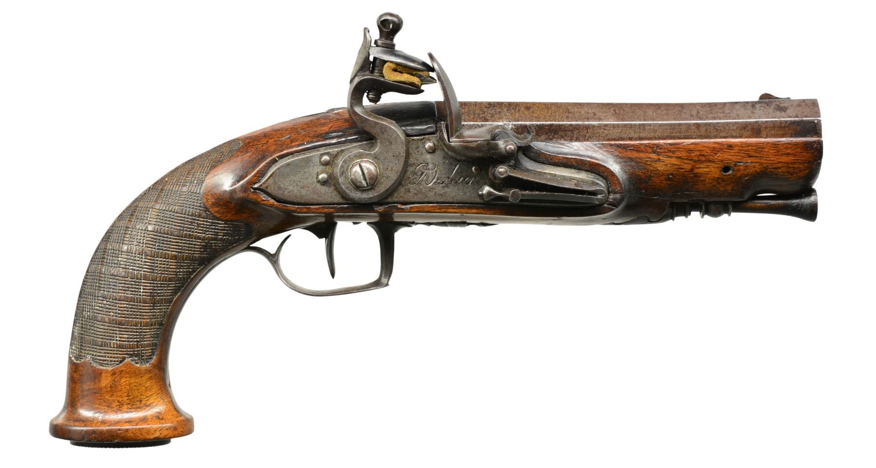 USED BY CAPTAIN JOHN TICE, BRITISH ARMY WITH PROVENANCE. Cal. 65. NSN. 9 3/4" Overall. Bbls. 4 3/4" oct. twist micro groove rifled w/ Liege proofs on left side of breeches & unlined touch holes. Locks signed "Berdeux" under pans. Trigger guards w/ engraved bows, stylized urn finials w/ engraved thimbles en suite. Walnut stocks have textured checkered grips w/ silver pins w/ oval engraved butt caps. Carved ramrods have cupped tips. UNATTACHED ACCESSORIES: several letters, the earliest written in 1925 telling a bit of history of writer’s great grandfather Capt. John Tice & his involvement of battle of Waterloo. CONDITION: very good to fine overall, appears all original & complete. Iron has smooth gray patina, silver pins dark silver patina, wood retains much of their original varnish. Mechanically fine w/ well defined rifled bores. (01-17231/JS). ANTIQUE. $2,500-3,000.