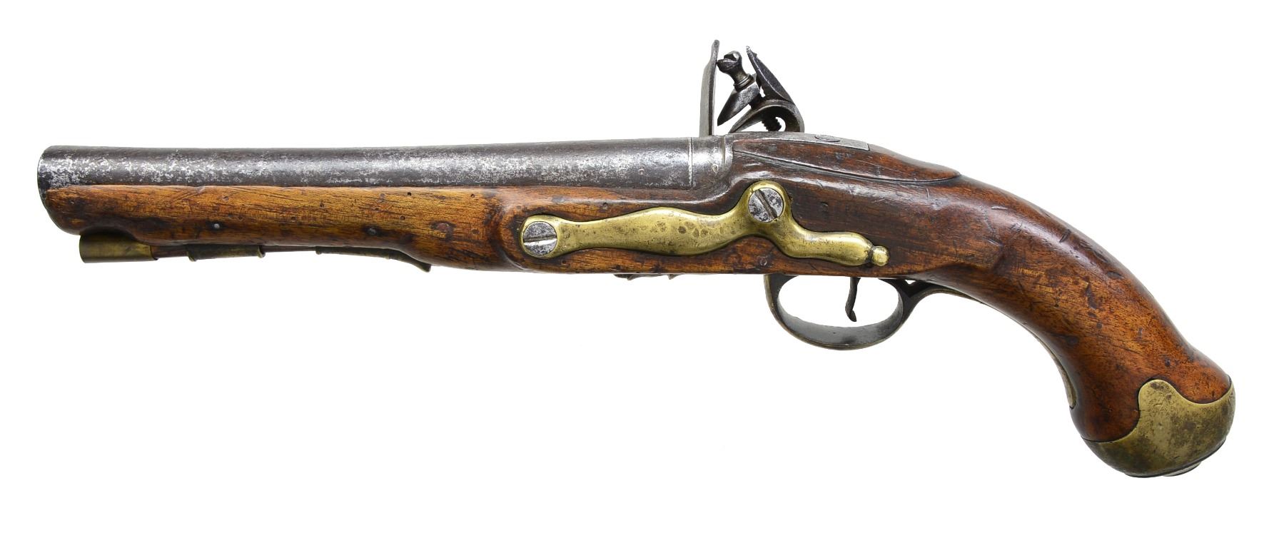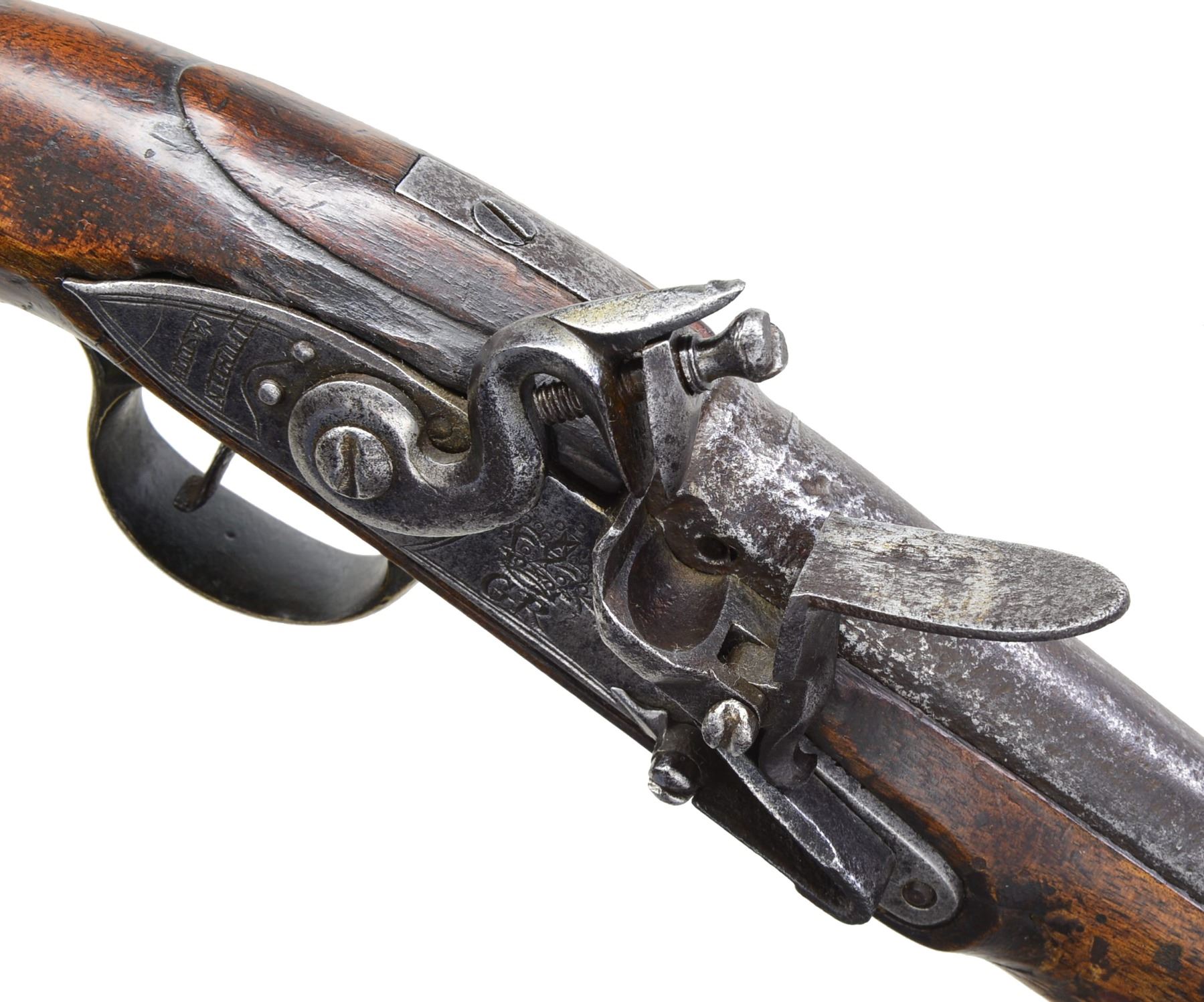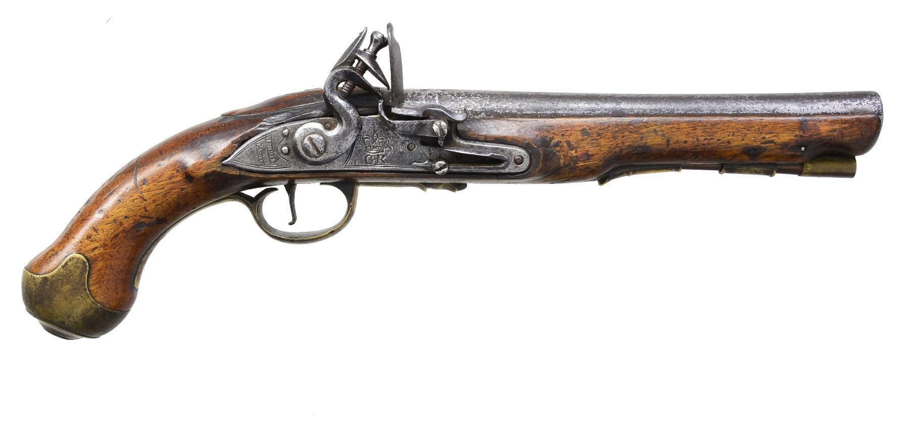 PISTOL. Cal. 65. NSN. 15 3/4" overall. 9 1/8" Slightly swamped rnd. bbl. w/ indiscernible proofs on top of bbl. Lock marked w/ "GR" cipher forward of cock & "DUBLIN CASTLE" at rear on tail. CONDITION: appears complete & original w/ exception of replaced ramrod. Mechanics are fine w/ pitted smooth bore. (01-17248/JS). ANTIQUE. $2,000-3,000.