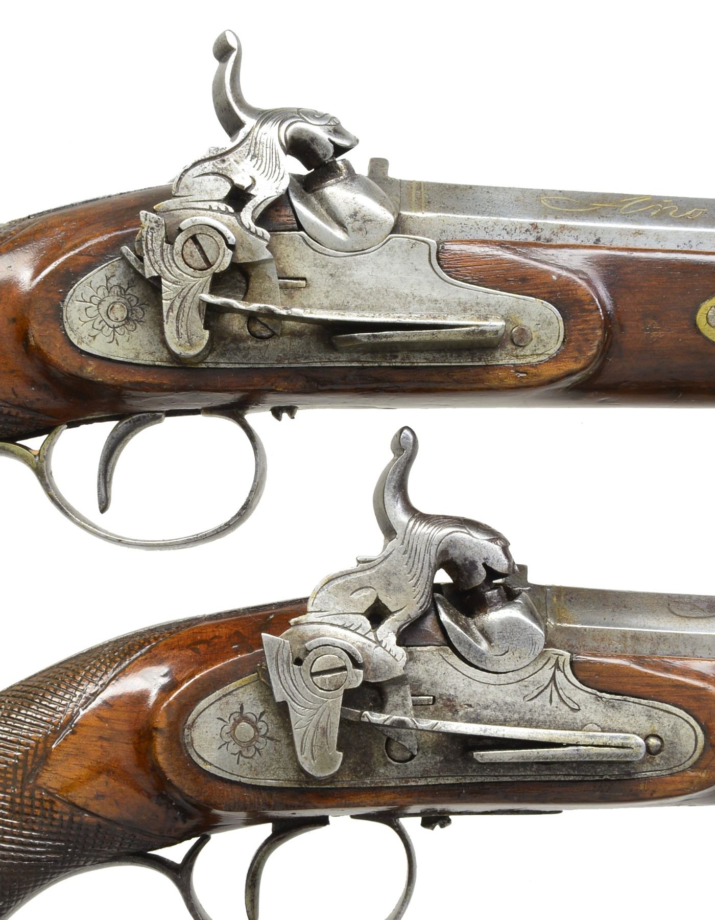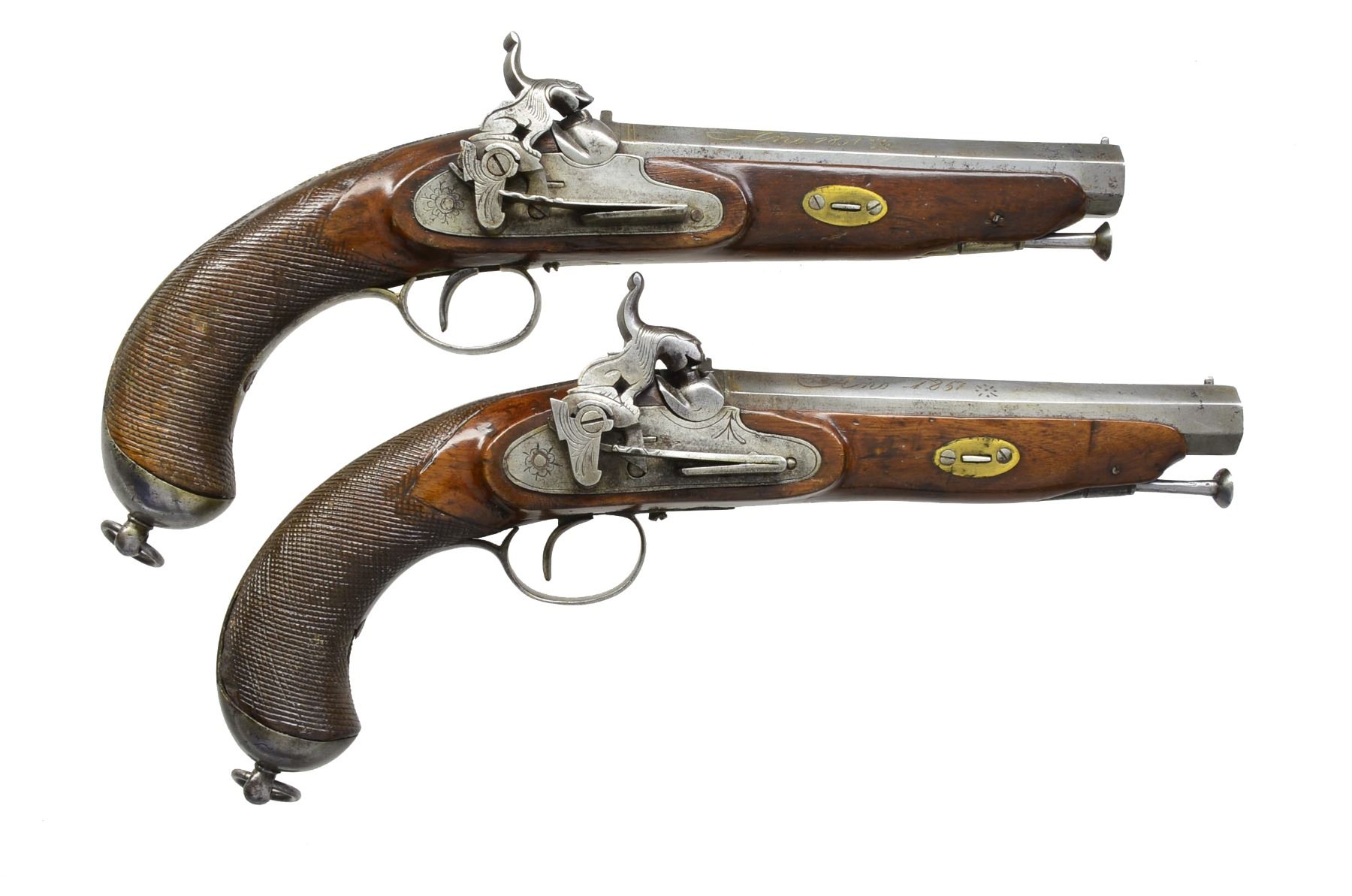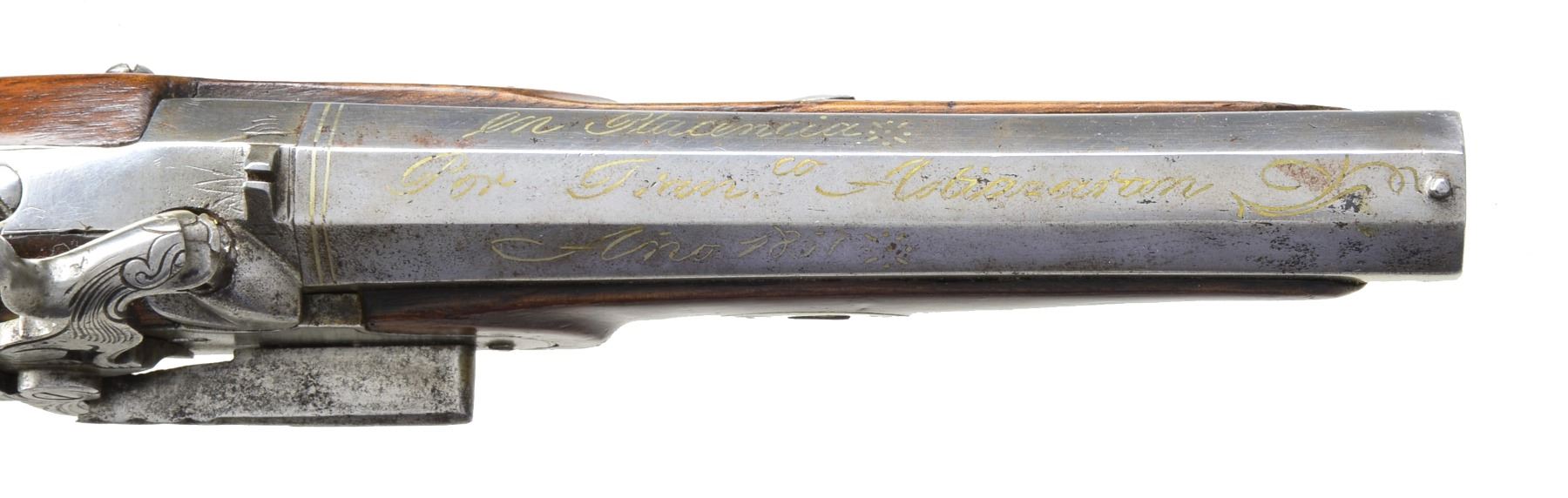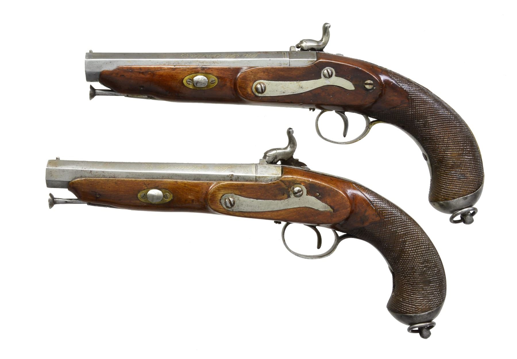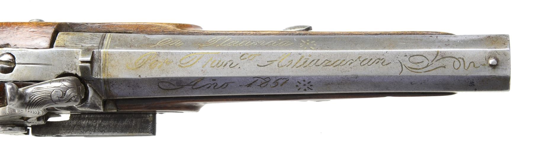 Cal. 69. NSN. 12" Overall. Bbls. 6" oct. w/ inlaid silver presentation on 3 flats "En Plasencia / Por Franco Astiazaran / Ano 1851". Most unusual lock mechanism w/ external springs & full figural hammers in shape of stylized seated lions. Iron mounts lightly engraved, sunbursts on trigger bows & back of butt caps. Checkered stocks have brass keyway escutcheons. CONDITION: good to very good overall. Complete & original. 1 Gun has 1/2" of trigger guard missing at tail. Metal has been cleaned. A coat of varnish has been applied over metal & wood. Mechanics are fine w/ clean smooth bores. (01-17243/JS). ANTIQUE. $2,000-3,000.
