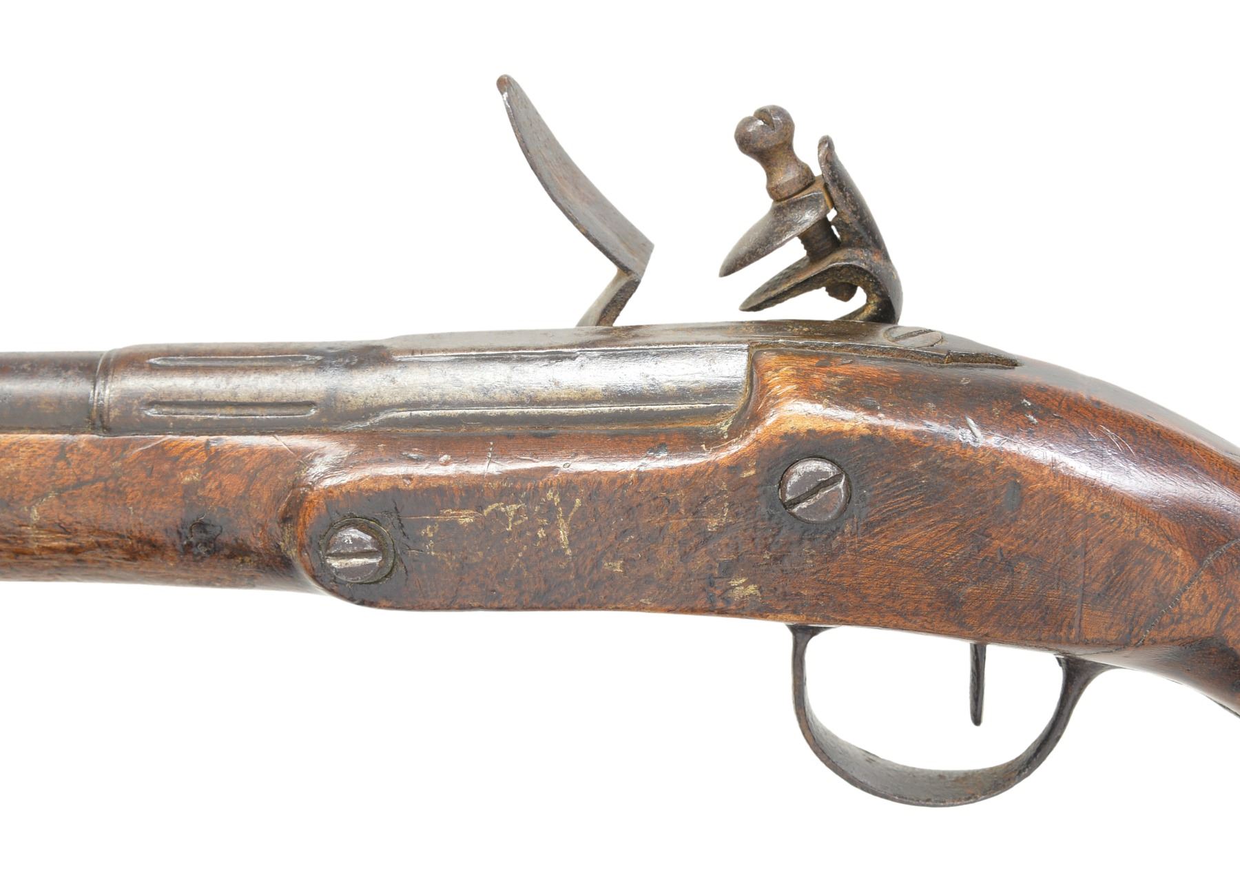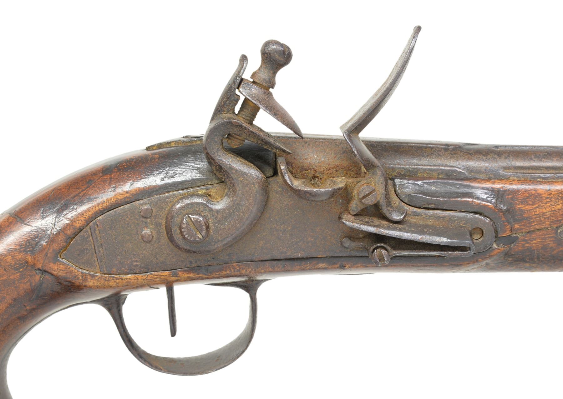 Cal. approx. 58. NSN. Bbl. 14". Original iron, somewhat crude lock showing effective design but unsophisticated workmanship. Iron trigger guard & bbl. thimble. Wood ramrod. Stock appears to be cherry. CONDITION: bbl., lock & trigger guard all have a dark, ancient patina. Lock holds both full & half cock. Stock has a 2 1/4" crack extending from the front of the lock to the bbl. channel. There is a tight crack extending from the trigger guard partially around the wrist. The remainder of the stock has various dents & dings from years of use. Ramrod is missing its tip. Bore is fair. (01-17188/BF). ANTIQUE. $1,200-1,500