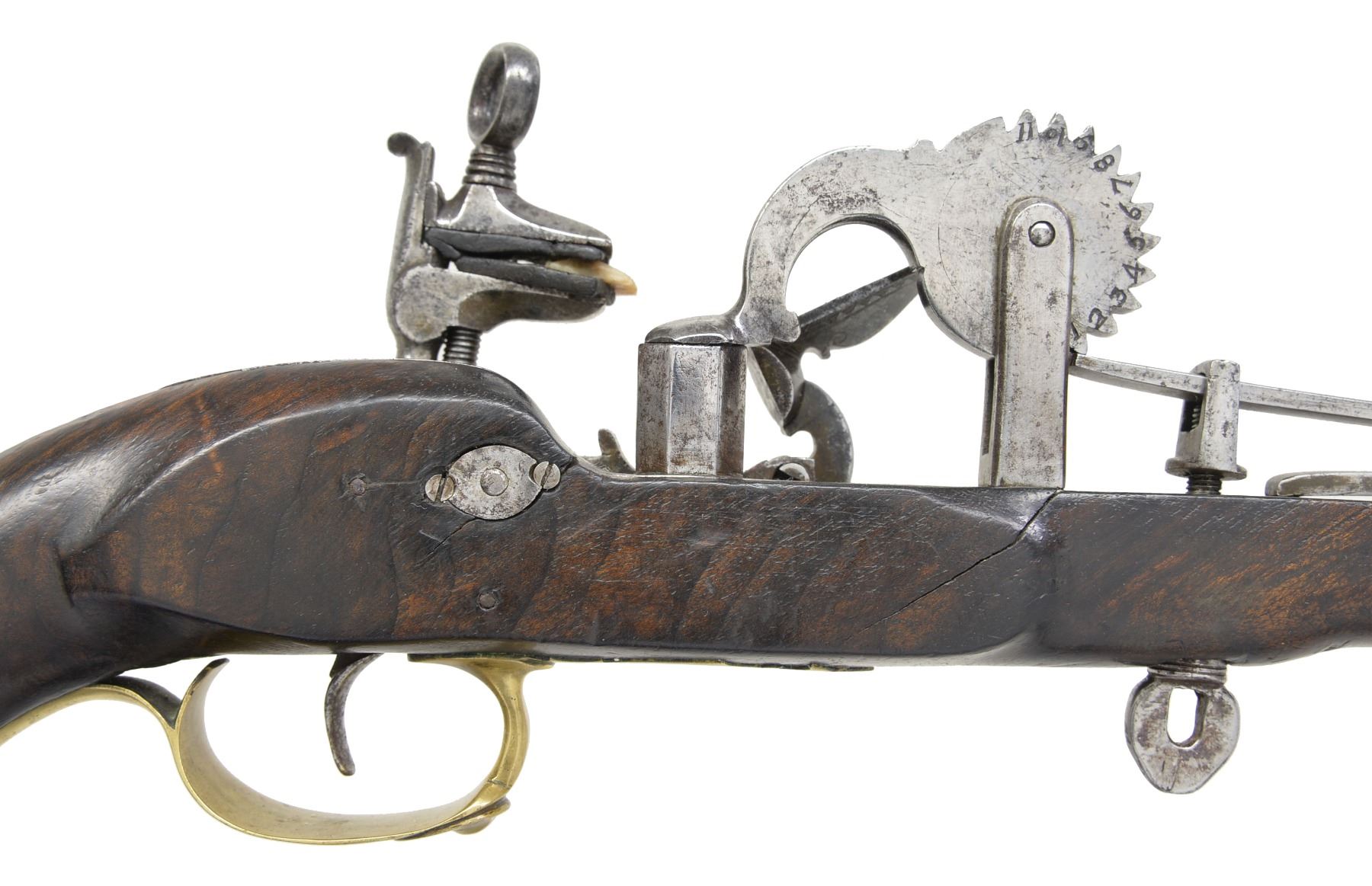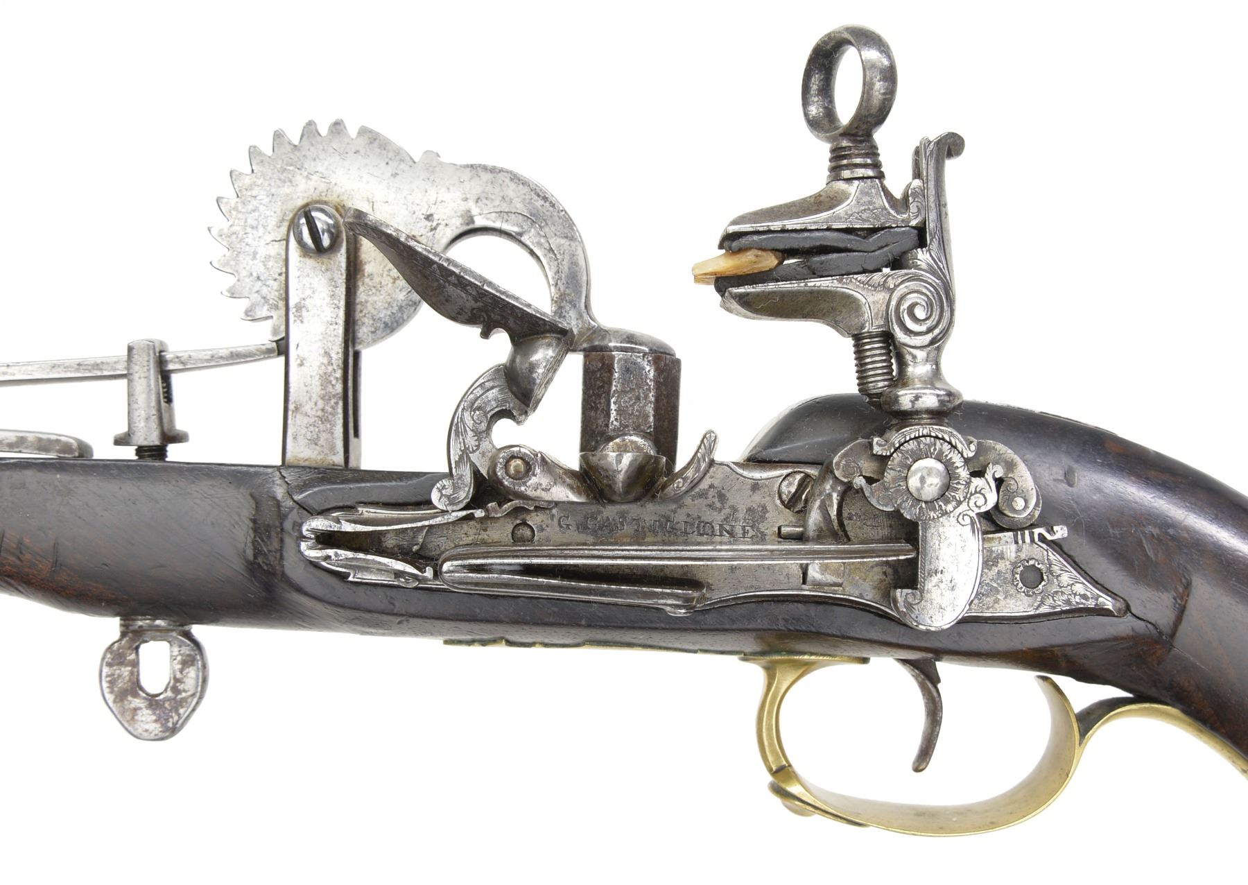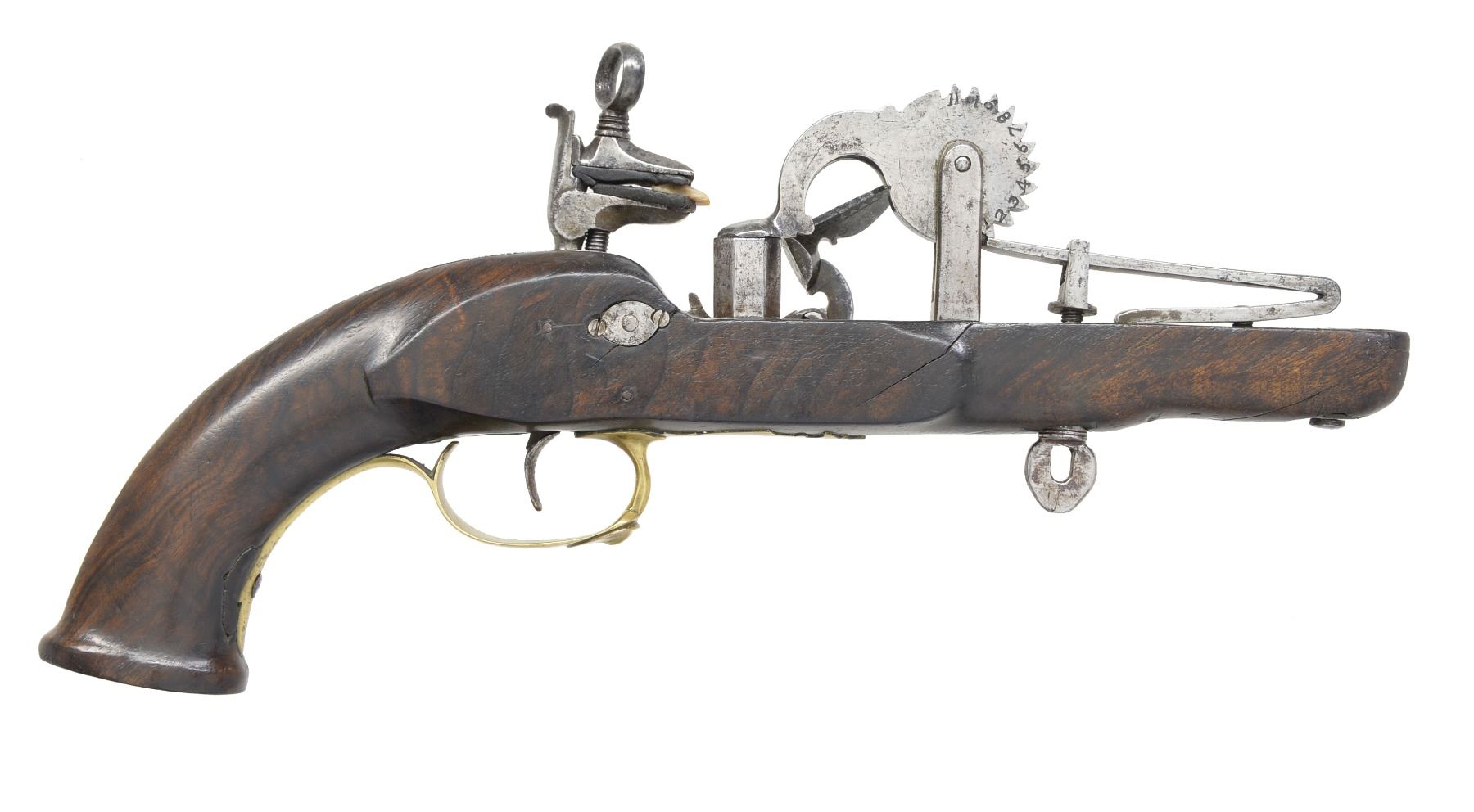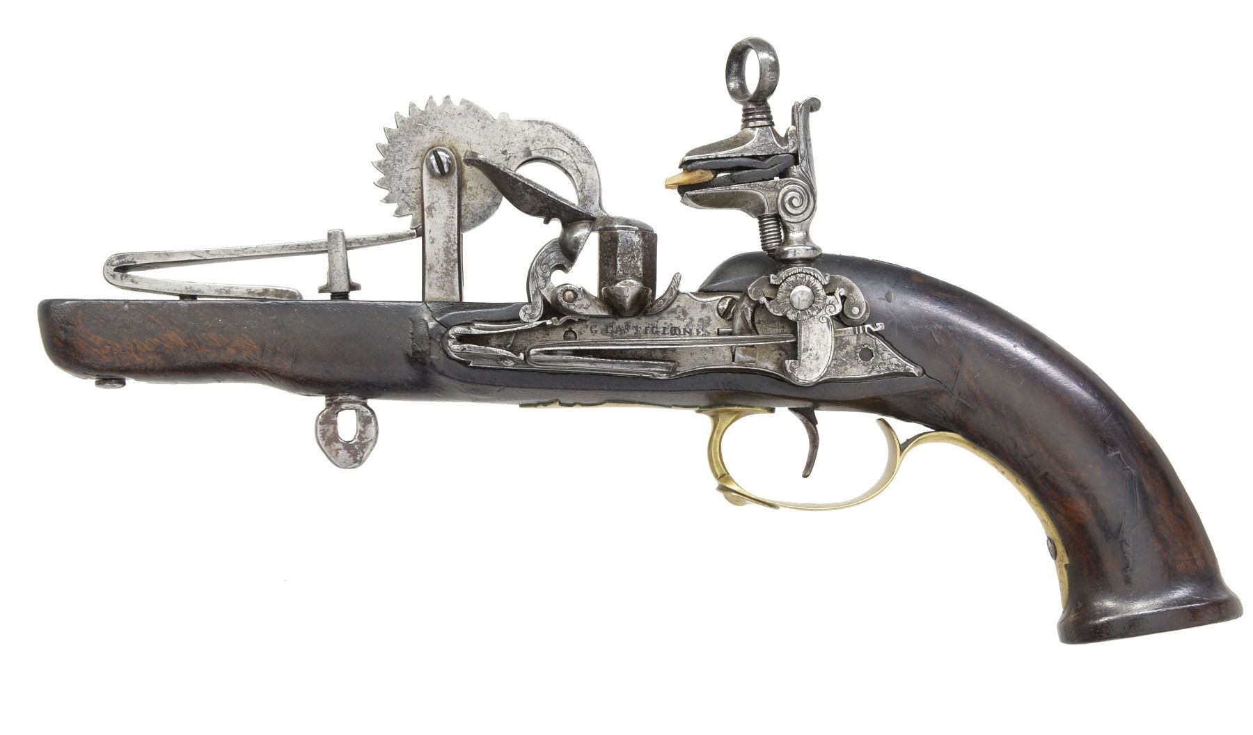 This is a late 18th or early 19th century hand held eprouvette (powder tester). 12 1/2" Overall. The lock mechanism is totally outside w/ beveled & filed frizzen spring & cock spring. Cock is mounted on a roller bearing w/ ornate floral bridal. Frizzen engraved en suite w/ waterproof pan which is attached to oct. powder chamber which is attached to wheel w/ teeth numbered "1" through "11". Lock is centrally signed "G. Castiglione". CONDITION: good to very good overall. Iron is cleaned w/ a gray / bright overall patina. Lock mechanism is functional. Stock is sound w/ hand worn patina having 2 hairline cracks opposite lock & scattered sm. blemishes. (02-13440/JS). NON-GUN. $1,200-1,500.