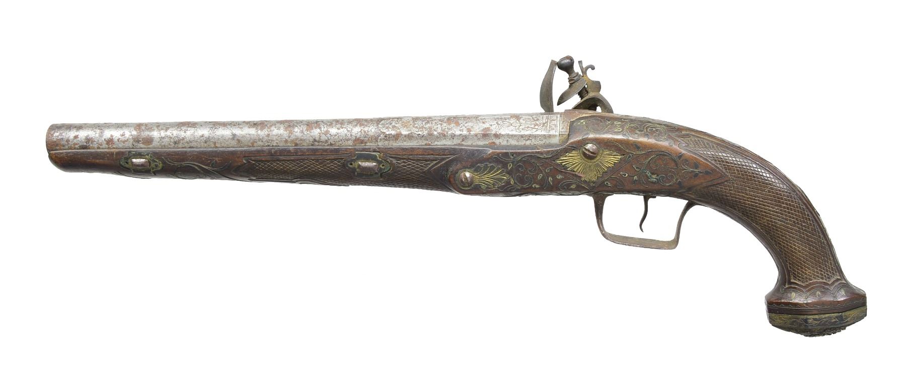Cal. about 62. NSN. Bbl. 10 1/2" rnd. w/ scalloped oct. rear section & smooth bore. Top bbl. flat & lock are marked "London". Bbl., top tang, lock, hammer & iron trigger guard have foliate & patriotic themed hand engraving. Plain trigger. Key fastened walnut stock w/ flared butt. Features include checkered wrist & forearm w/ relief carved borders & extensive vine type foliate wire inlay. Brass fittings include ornate oct. butt cap, engraved sideplate escutcheons & engraved key escutcheons. CONDITION: iron parts have faded to gray showing areas of pitting & surface rust. Stock has dark worn appearance showing handling marks w/ sm. chips behind lock. Rear left key escutcheon is loose & front right key escutcheon is missing. Dark pitted bore. (01-17704/DS). ANTIQUE. $400-600.