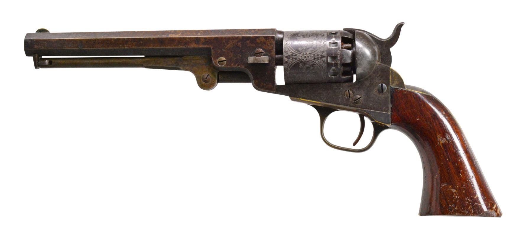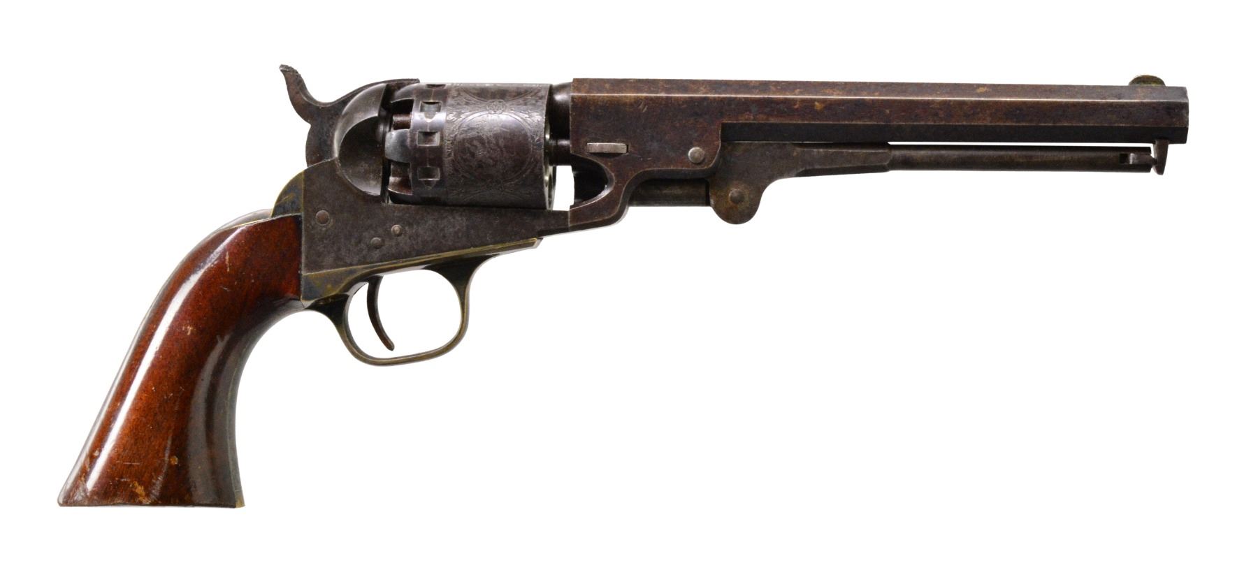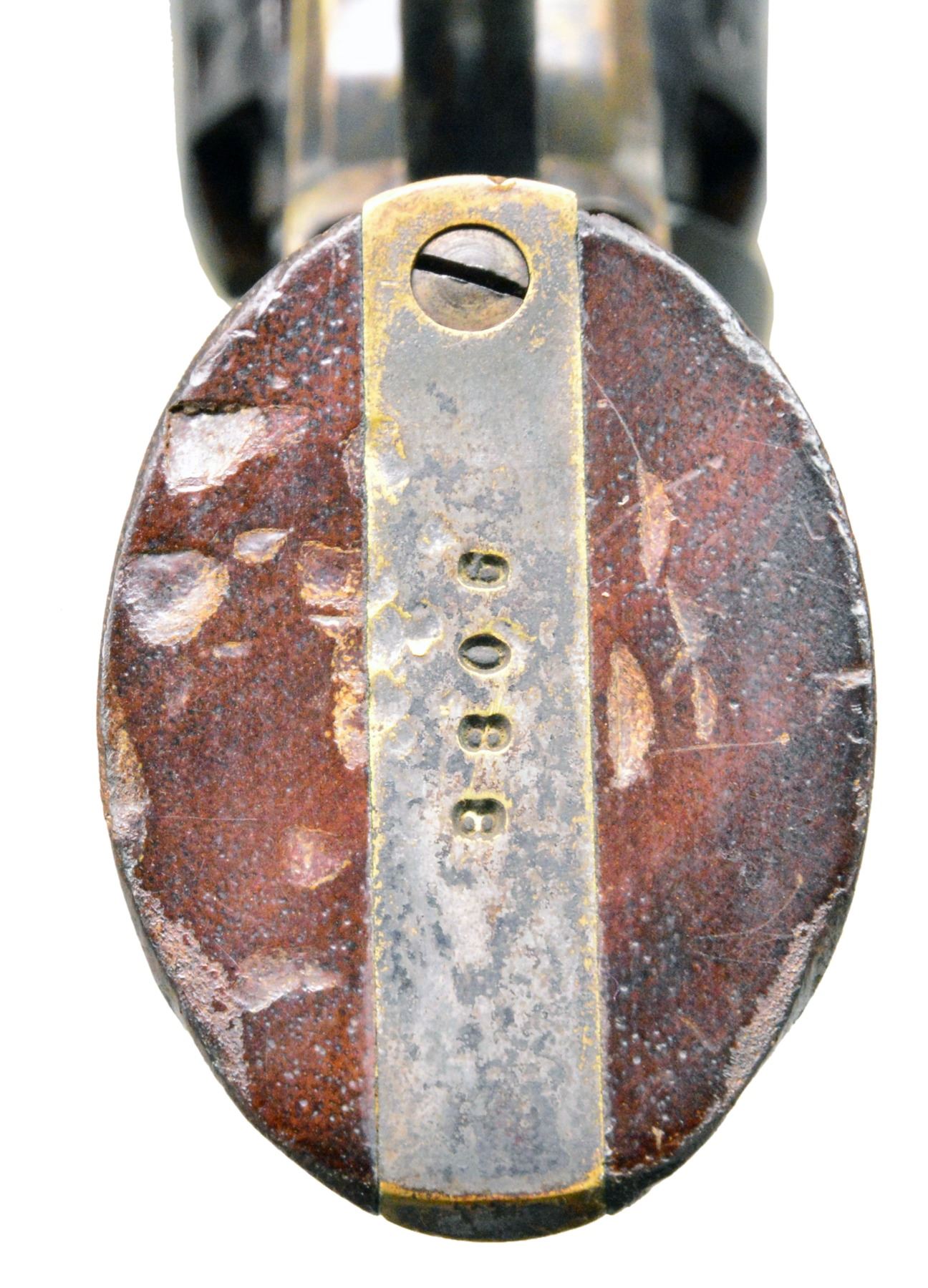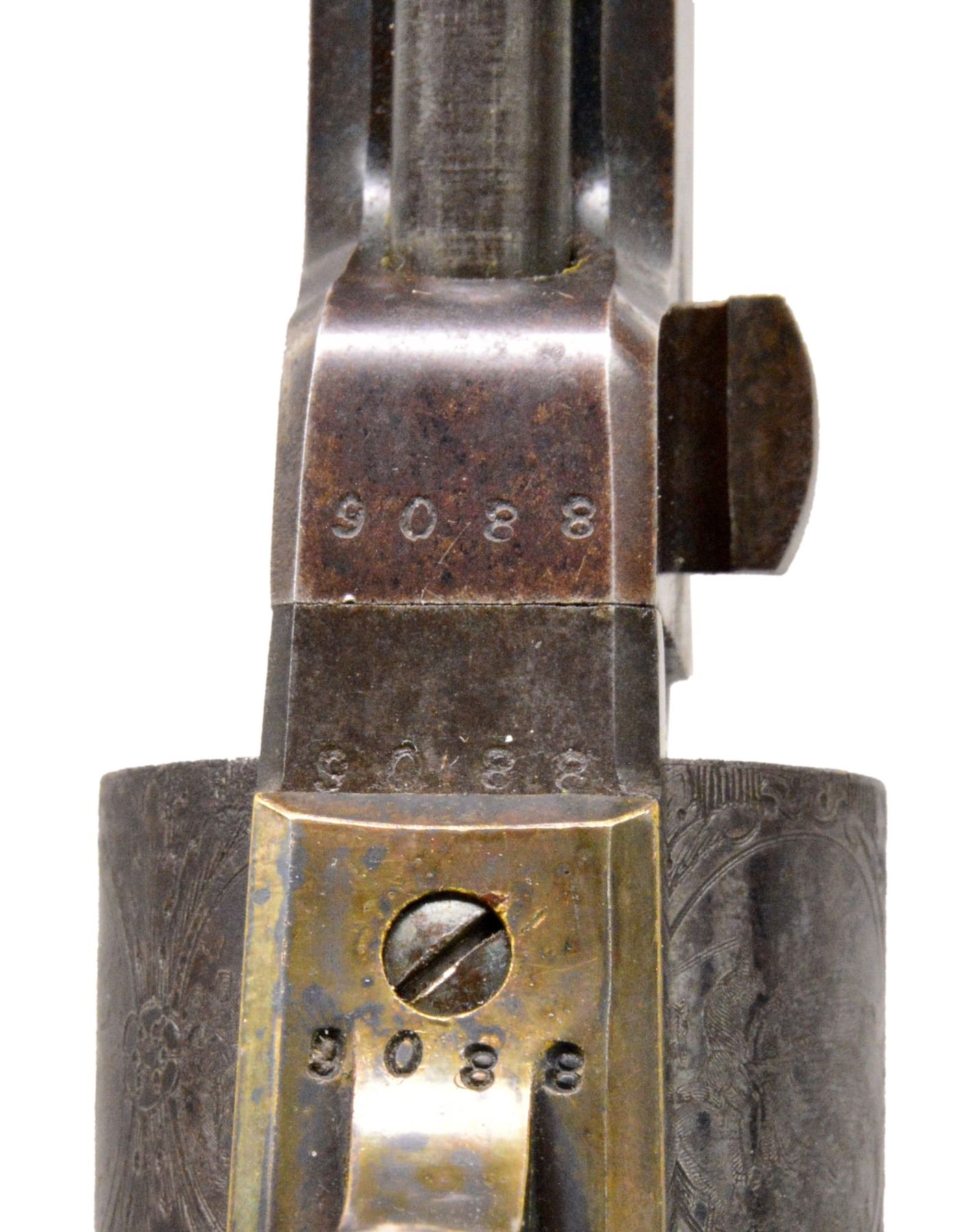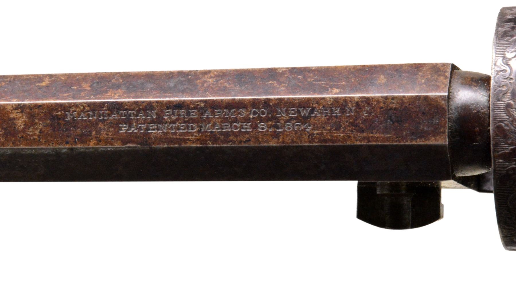 Cal. 36. S# 9088. Bbl. 6 1/2" oct. w/ semi circular front sight. Series V. Bbl. marked "MANHATTAN FIRE ARMS CO. NEWARK N.J. / PATENTED MARCH 9, 1864". 6 Shot rnd. roll engraved cyl. Blue & case colored finish w/ silver finished brass back strap & trigger guard. 1 Piece walnut grips. Bbl., frame, grip straps & wedge have matching S#'s. CONDITION: bbl. & cyl. have dull fading blue blending w/ spots of flaking & surface corrosion. Action & loading lever have faded to dark patina showing spots of surface corrosion. Grip straps retain 70% silver finish having a dark tarnish. Grips have added finish over wear & handling marks w/ series of deep dents at butt. Bore has slightly darkened appearance w/ intact rifling showing scattered spots of light pitting. (01-17008/DS). ANTIQUE. $500-900.