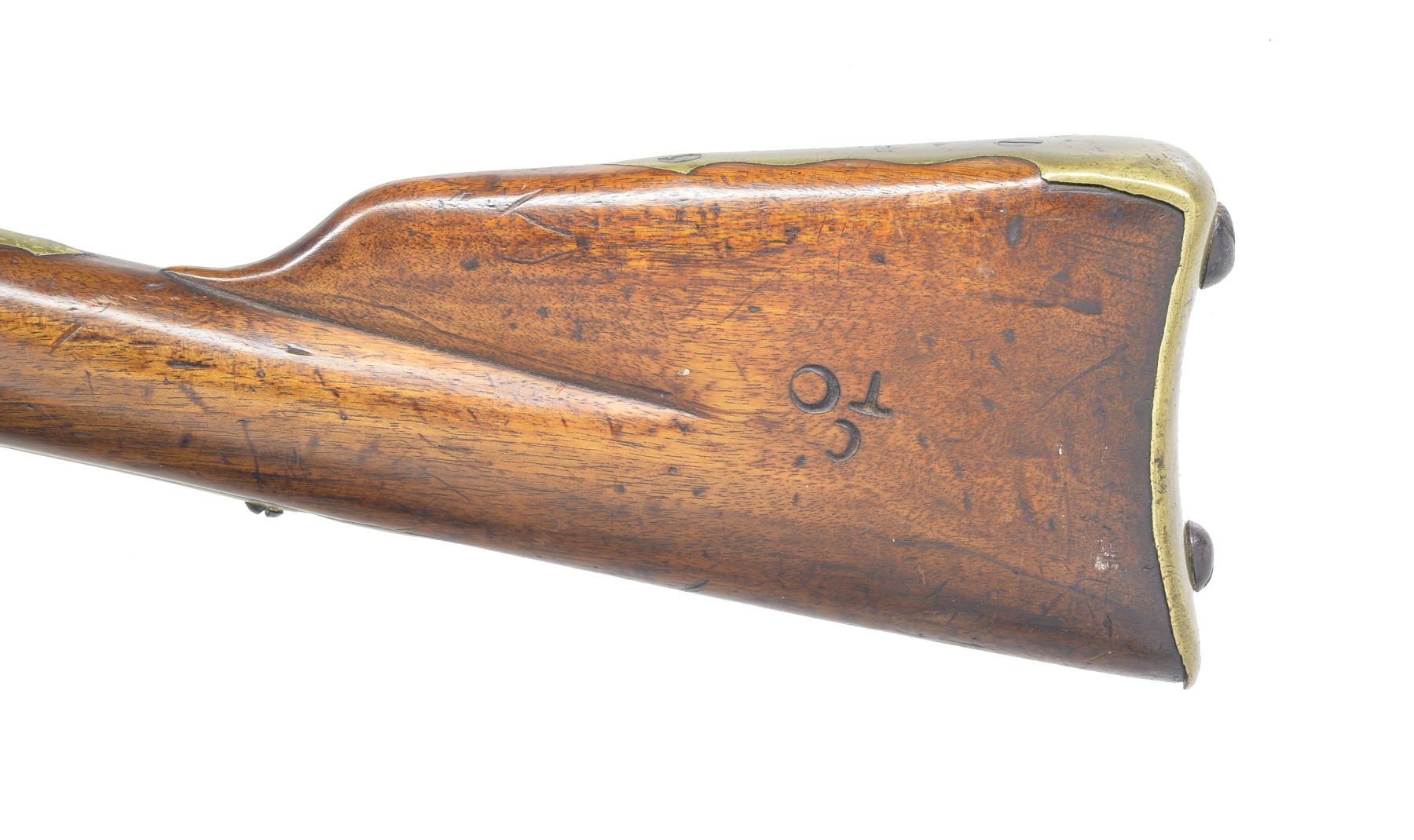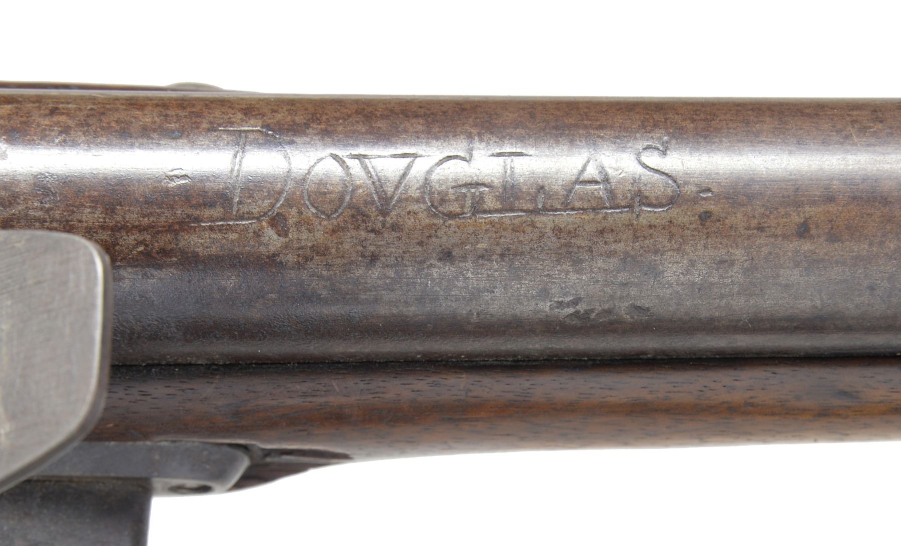 “DOUGLAS” PICTURED IN NEUMAN’S ENCYCLOPEDIA OF THE AMERICAN REVOLUTION. Cal. 75. NSN. American Revolutionary War era Dutch flintlock military musket, 42 1/2” pinned bbl., long brass blade front sight, engraved “DOUGLAS” near breech. Often on Dutch longarms, name on bbl. refers to colonel of regiment & some give opinion as to origin in America. Faceted unmarked lock w/ flat long neck serpentine cock w/ faceted flash pan is unmarked, brass furniture w/ earlier 2 screw buttplate tang & lg. protruding screws on back of buttplate. Stock has moldings around lock, sideplate & bbl. tang, incised line runs length of forestock. This exact gun is pictured as plate 20, page 213 in George Neuman’s 1975 text “Encyclopedia to American Revolution” showing this 2 screw buttplate tang. There are several “Douglass” & “Douglas” marked examples known as American used. Dutch muskets were sold to American colonists prior to & during the revolution. Many identified examples are held by collectors & institutions alike. Indeed, an identified historic Dutch musket of similar configuration but altered w/ bbl. bands sold in October 2019 for $480,000. Markings on this arm are all Dutch in origin as most seen in America. Thumbplate engraved “16 CP”, rear thimble “No. 32”, stock is branded “C / TO”. CONDITION: very good overall, appears original & complete. Markings in wood, brass & iron all discernible. Iron has mottled brown patina w/ light pitting at breech, brass w/ old coat of varnish which has yellowed has medium mustard patina. Rear sling swivel is missing & front sling swivel is loose. Stock is sound & solid w/ hand worn patina. Mechanics functional, smooth clear dark bore. PROVENANCE: Ex-George Neuman collection; Ex-Peter Wainwright collection. (01-17465/JS). ANTIQUE. $4,000-6,000.