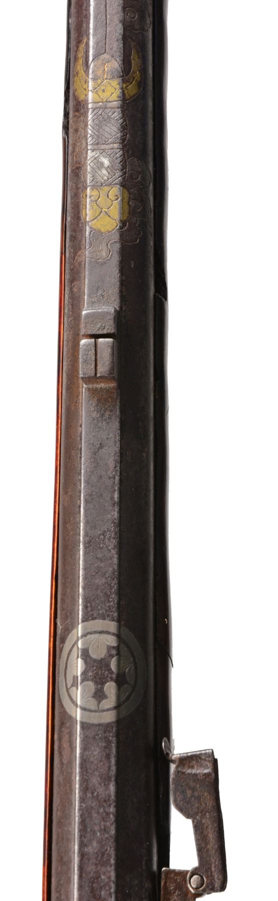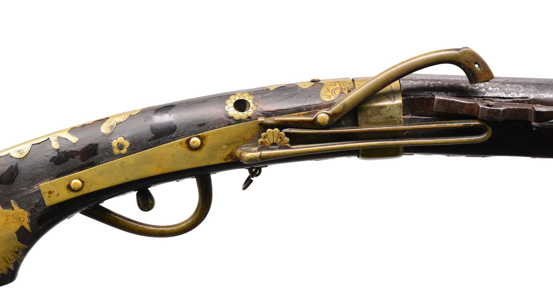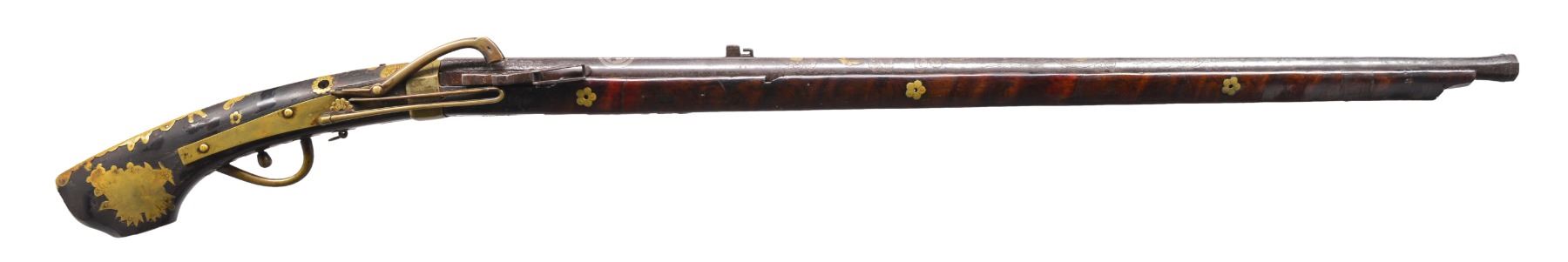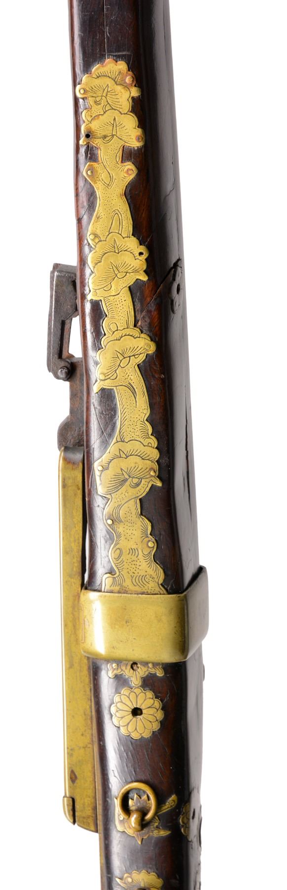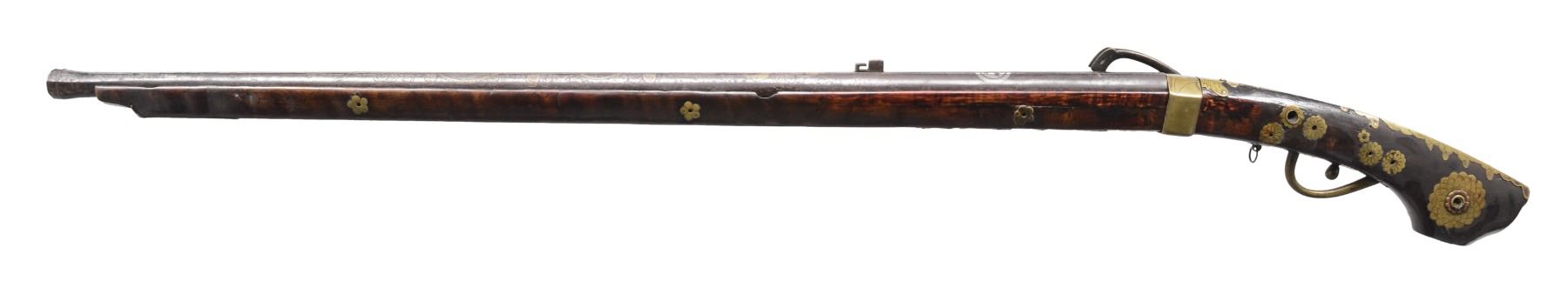 Cal. approx. 50. NSN. This is an honest complete & original example of an ornate Japanese matchlock. 45” Overall. Bbl. 33” tapered oct. w/ flared oct. muzzle. Bbl. is inset w/ silver & copper inlays including a dragon & kanji. The top of the bbl. is fitted w/ block rear sight, missing front sight, fitted w/ flash pan & hinged cover. Brass lock contains long brass hammer & spring. Varnished stock has decorative & functional brass insets including many which are chrysanthemum shaped, brass triggerguard & ball style trigger. CONDITION: good overall, appears complete & original. Hizara & hibuta (flash pan and cover) are loose but attached. Bbl. is plum/gray patina w/ engraved & inset decoration discernible. All stock inlays are intact. There is a 12" x 1/2" inset repair to stock on left side opposite lock. Mechanics are functional, bore is smooth & pitted. (01-17221/JS). ANTIQUE. $1,500-2,000.