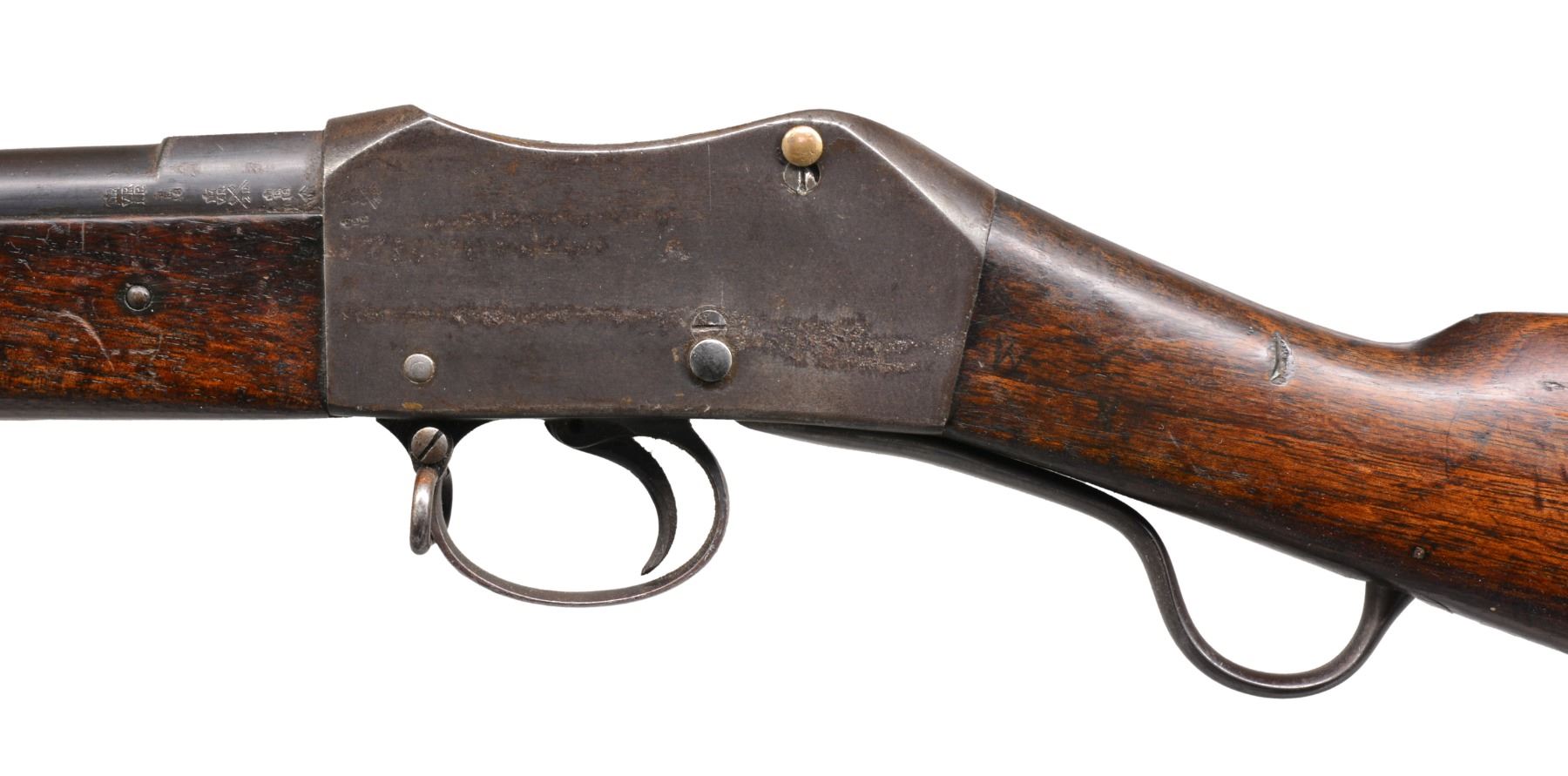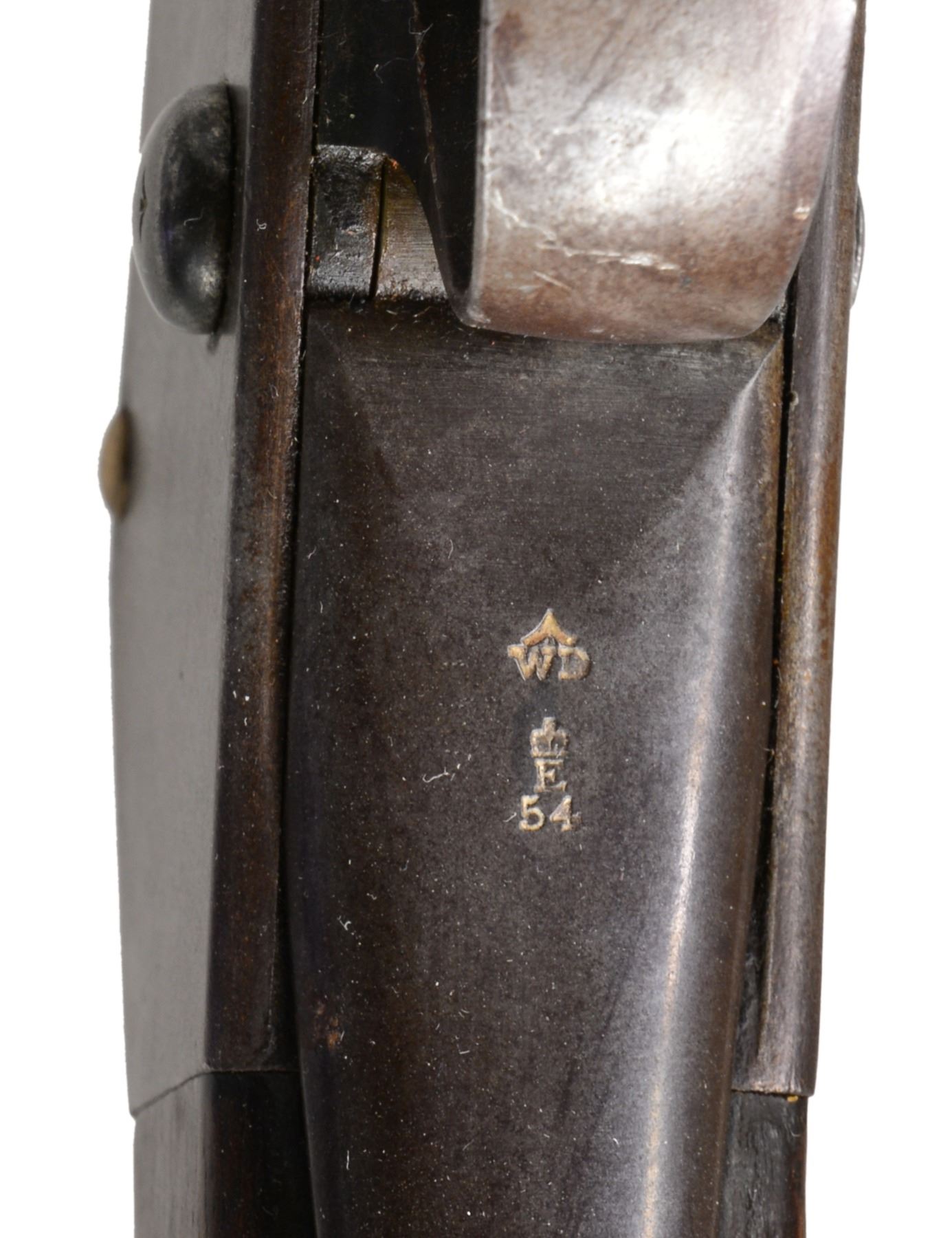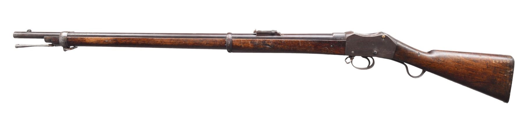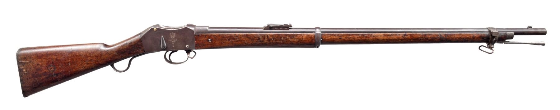 Cal. .450/577. NSN. Bbl. 32 1/2". A scarce example of an MK1 surviving in unconverted condition. Most MK1s were converted, after the introduction of the MK2 modifications, to the initial issuance of Martini Henry rifles. This rifle likely had a long & storied service life including action during the Zulu Wars of 1879. Bbl. features a side lug for bayonet, folding sight & numerous proofs on left side of the bbl. Receiver marked "(crown) / V.R. / ENFIELD / 1873 / (crowned broad arrow) / I.". All iron parts appear complete & bear appropriate ordnance markings. Ramrod is intact. Forestock is complete. Buttstock has a circular ordnance stamp that reads "R (crown) M ENFIELD WD (2 broad arrows)" all above "1". The opposite side of the stock, bears the stamping "IB103" which is likely a regimental/rack number. UNATTACHED ACCESSORIES: documents including information about Martini Henry rifles & a copy of the original purchase receipt for this gun in 1986 from Brian Knapp, noted English arms dealer. CONDITION: bbl. receiver & other iron components show an extraordinarily high percentage of original blued finish. Stock shows numerous dents & dings attesting to its long service life though no major faults can be seen. Bore is fine w/ strong rifling. (01-17217/BF). ANTIQUE. $1,500-2,200.