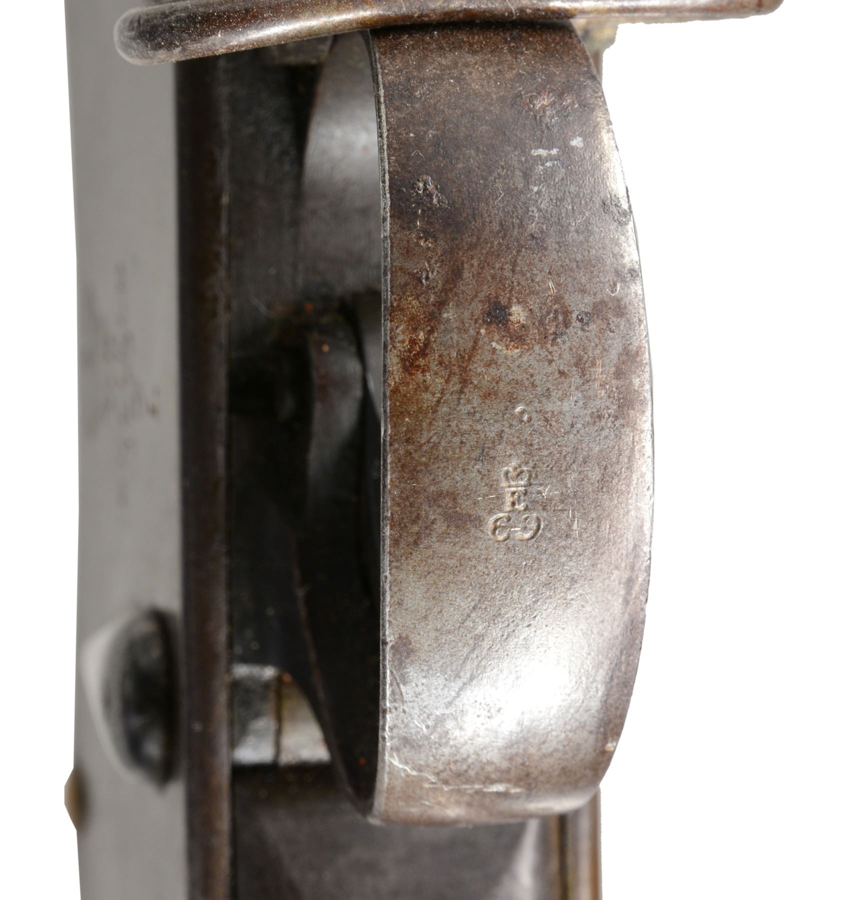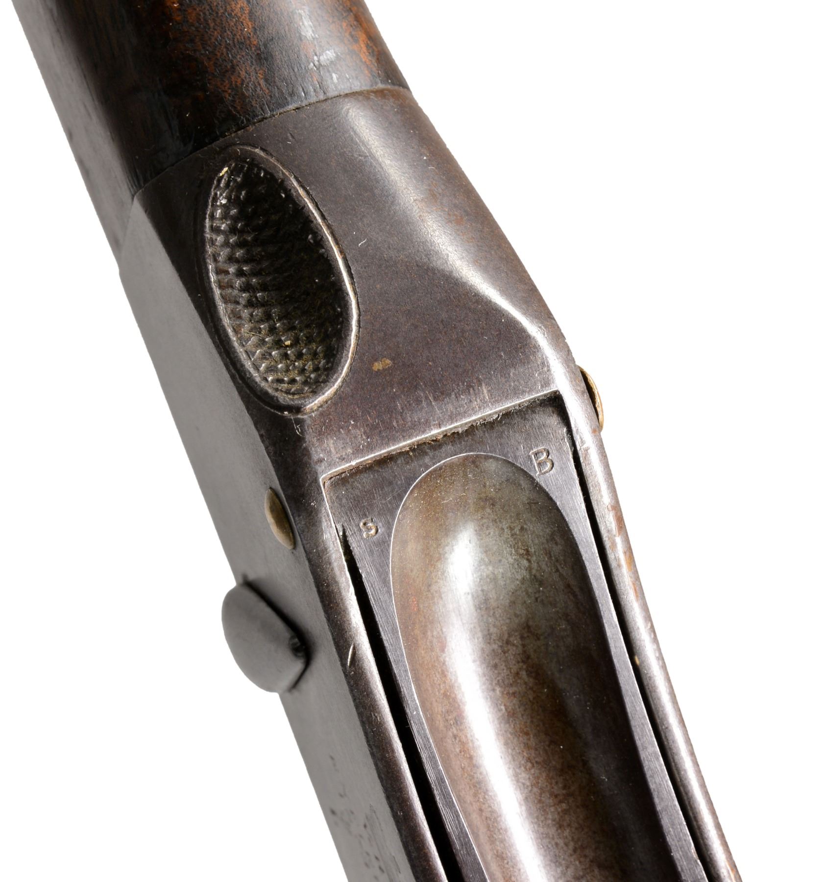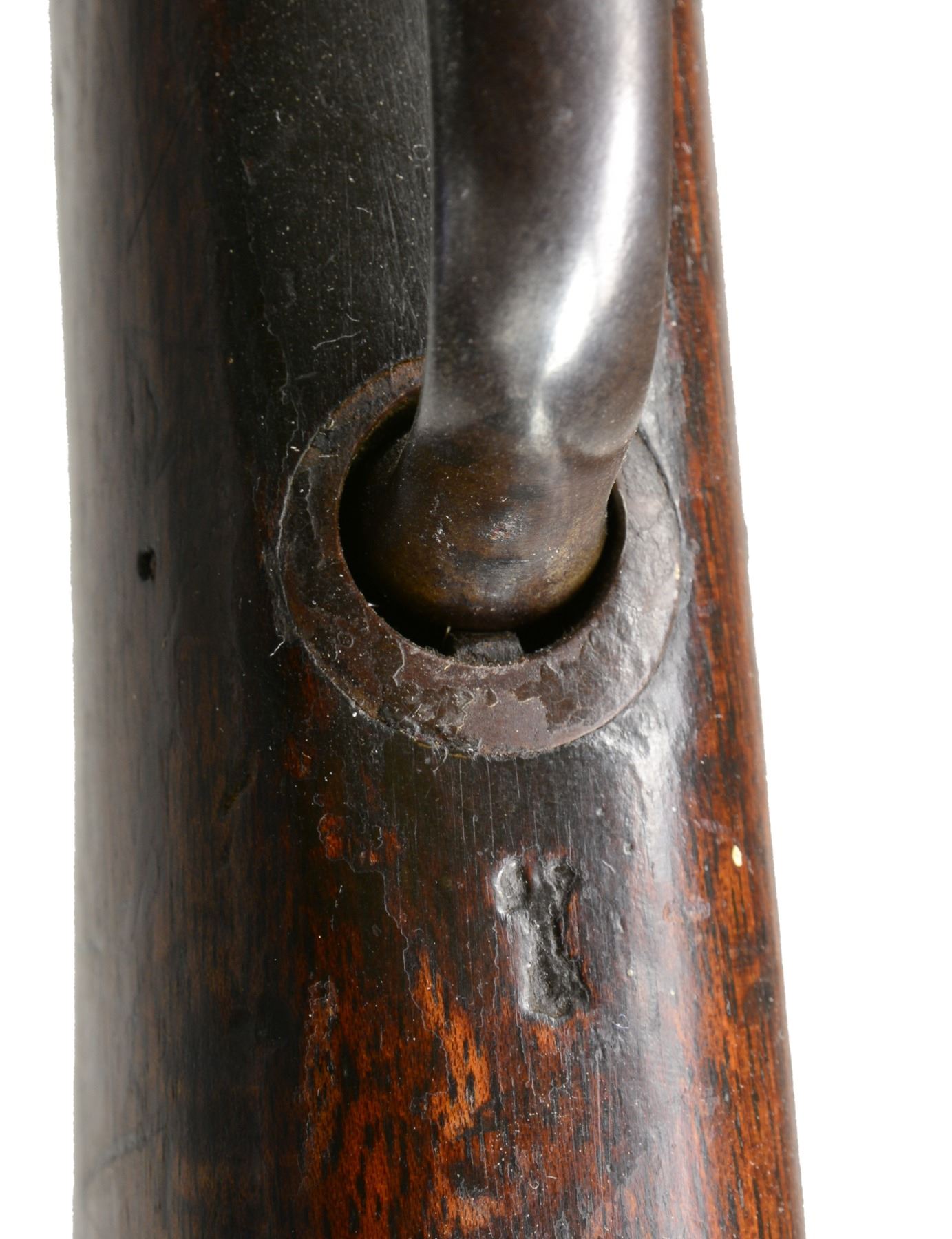 Cal. .450/577. NSN. Bbl. 32 1/2". A scarce example of an MK1 surviving in unconverted condition. Most MK1s were converted, after the introduction of the MK2 modifications, to the initial issuance of Martini Henry rifles. This rifle likely had a long & storied service life including action during the Zulu Wars of 1879. Bbl. features a side lug for bayonet, folding sight & numerous proofs on left side of the bbl. Receiver marked "(crown) / V.R. / ENFIELD / 1873 / (crowned broad arrow) / I.". All iron parts appear complete & bear appropriate ordnance markings. Ramrod is intact. Forestock is complete. Buttstock has a circular ordnance stamp that reads "R (crown) M ENFIELD WD (2 broad arrows)" all above "1". The opposite side of the stock, bears the stamping "IB103" which is likely a regimental/rack number. UNATTACHED ACCESSORIES: documents including information about Martini Henry rifles & a copy of the original purchase receipt for this gun in 1986 from Brian Knapp, noted English arms dealer. CONDITION: bbl. receiver & other iron components show an extraordinarily high percentage of original blued finish. Stock shows numerous dents & dings attesting to its long service life though no major faults can be seen. Bore is fine w/ strong rifling. (01-17217/BF). ANTIQUE. $1,500-2,200.