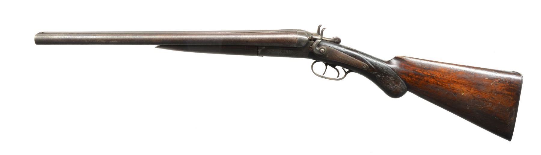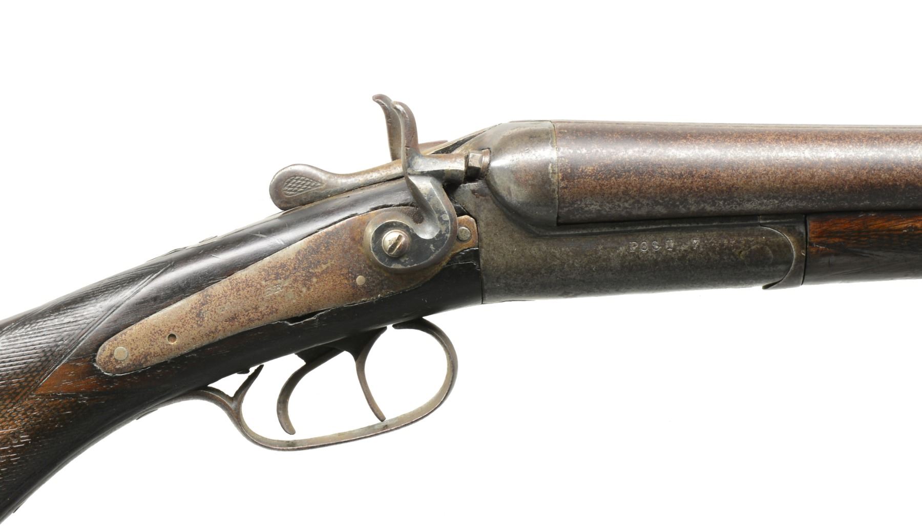 Cal. 10 Ga. NSN. Rabbit eared side by side shotgun w/ 19” bbls. marked on left receiver “MO. STATE PRISON”, opposite side of receiver is marked “Post 7”, the 7 is also found stamped on trigger guard, bbl. & receiver tang. CONDITION: fair to good overall, appears complete & matching, metal is overall mixed gray/brown patina w/ pitting, locks are both marked “T. BARKER”. Stock is sound & well worn especially to checkered pistol grip w/ numerous sm. storage dings & nicks though retaining sm. portions of original varnish. Mechanics functional w/ clear frosted bores. (01-17091/JS). ANTIQUE. $1,000-1,500.