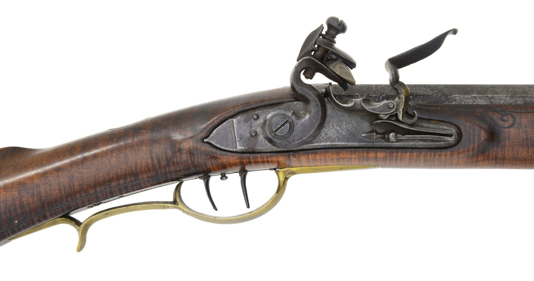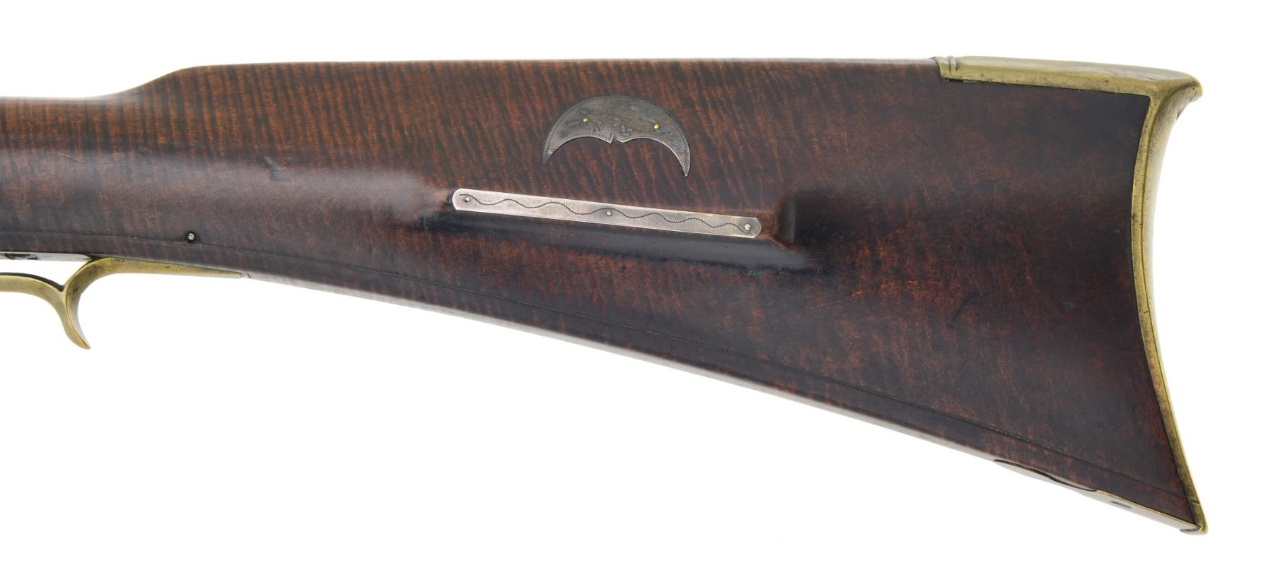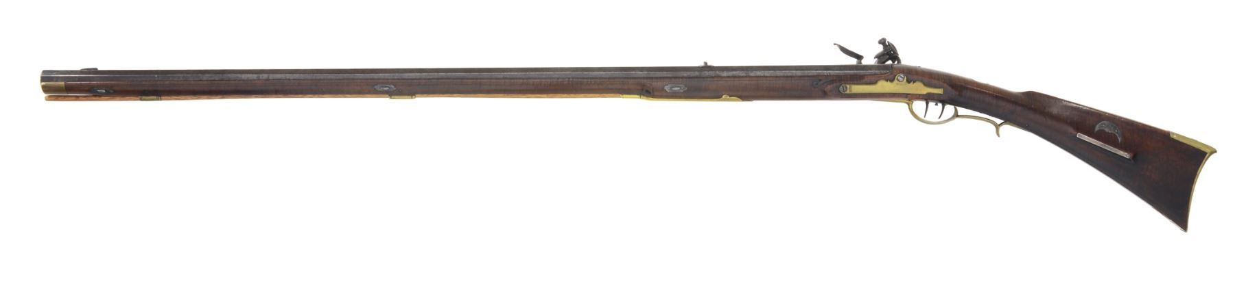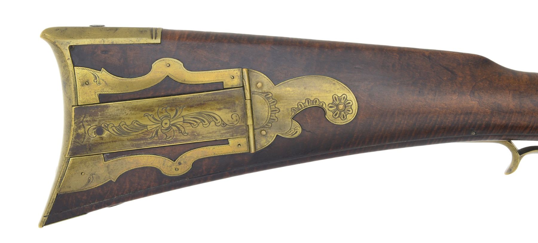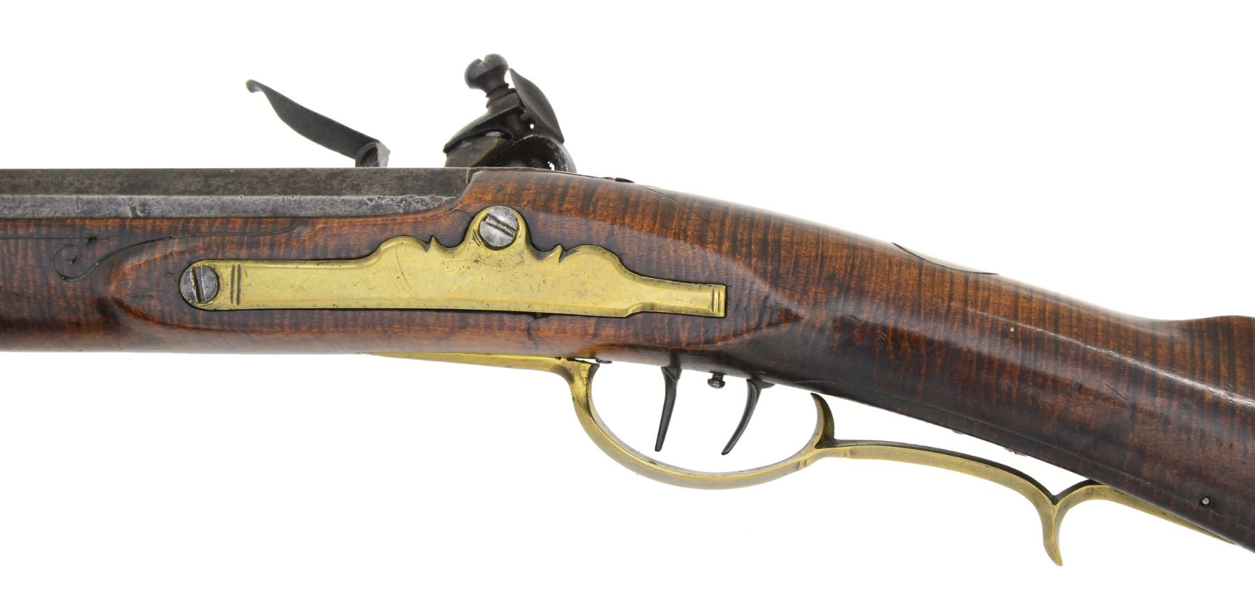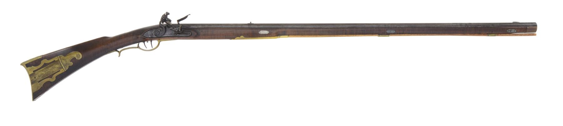 FLINTLOCK RIFLE. Cal. about 44. NSN. Bbl. 39 1/8" of dbl. taper oct. John Shuler was well-known quality rifle maker in Bucks County, PA (active 1800-1829) His distinctive signature "I. S" and engraved flourishes found on top flat of slightly swamped 39 ¼” octagonal barrel, brass blade front sight w/ fixed V notch rear sight. Brass mounted with 6 German silver inlays. Unmarked original flint lock, double set triggers. Full length curly maple stock w/ 3 iron keys with German silver escutcheons, pierced and engraved 4-piece patchbox. Other brass furniture includes crescent buttplate, toeplate, trigger guard, sideplate, thimble w/ engraved extension plate & nose cap. Hardwood ramrod is held by 2 faceted (check and see if faceted or not please) pipes. Vacant German silver oval thumb plate. Incise carving is found along bbl. channel & toeline as well as forward of lock & sideplate. A classic Shuler decorated rifle with no significant problems. UNATTACHED ACCESSORIES: photos & hand written collectors notes. CONDITION: metal has cleaned mottled gray appearance w/ light pitting becoming heaviest in breech area. Refinished stock has well repaired wrist break and presents nicely. Mechanics are functionable, bore is dark retaining strong rifling. PROVENANCE: David Condon, Middleburg, VA about 1997; Steve Hench collection, Lancaster, PA; Estate Collection of George W. Browning. (01-16151). ANTIQUE. $5,000-9,000.