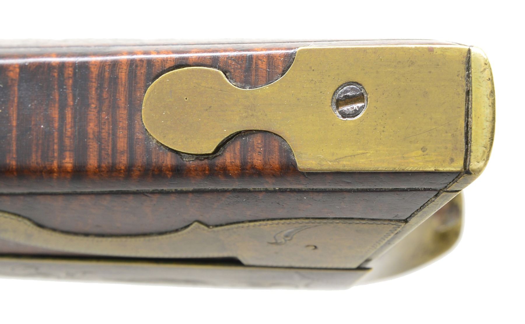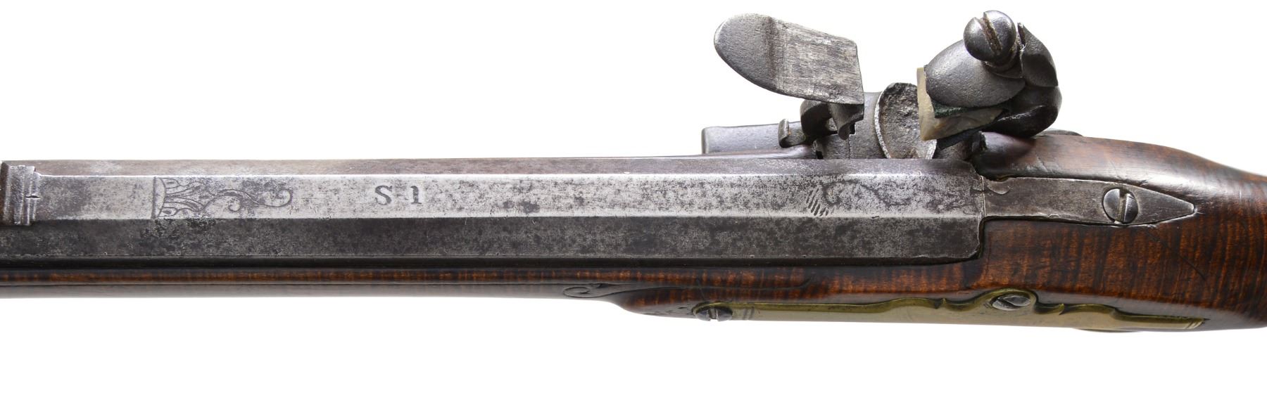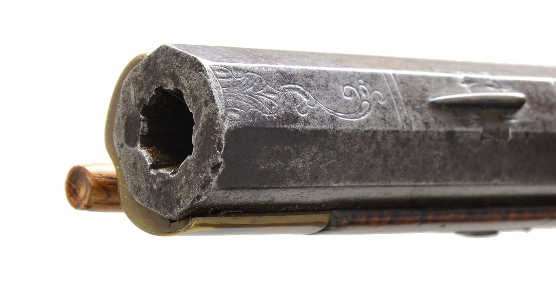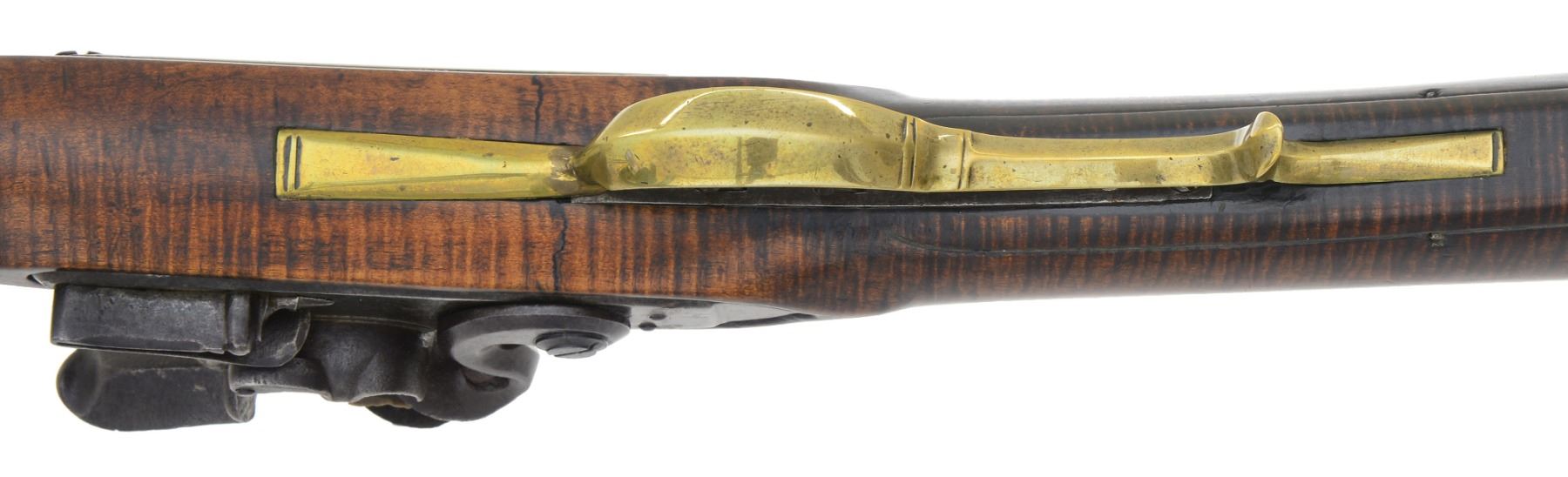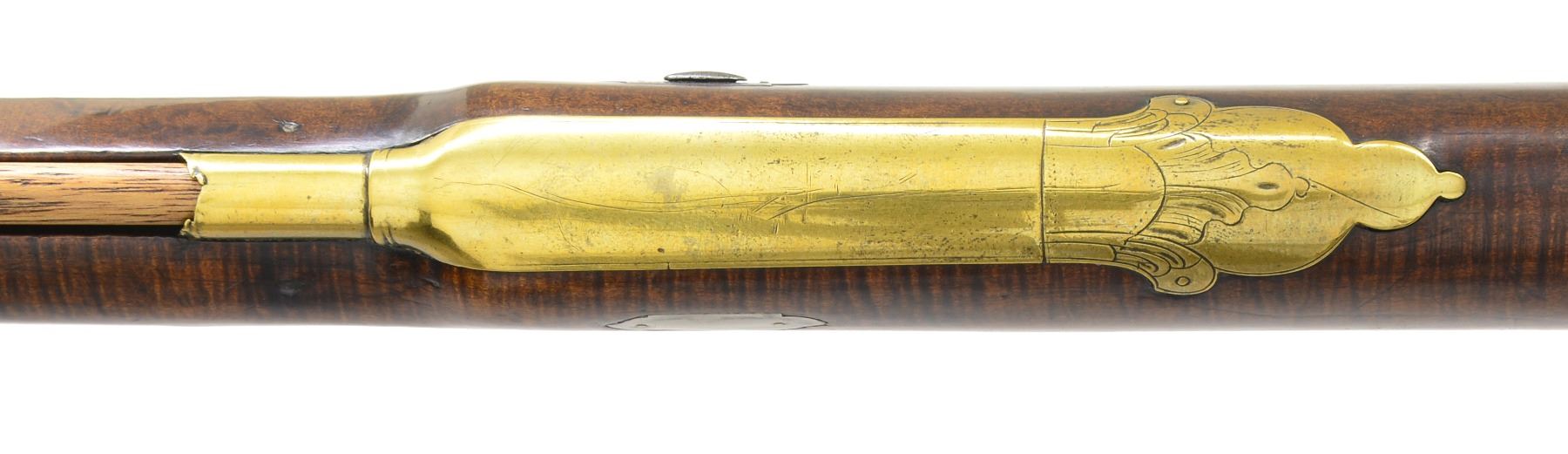 FLINTLOCK RIFLE. Cal. about 44. NSN. Bbl. 39 1/8" of dbl. taper oct. John Shuler was well-known quality rifle maker in Bucks County, PA (active 1800-1829) His distinctive signature "I. S" and engraved flourishes found on top flat of slightly swamped 39 ¼” octagonal barrel, brass blade front sight w/ fixed V notch rear sight. Brass mounted with 6 German silver inlays. Unmarked original flint lock, double set triggers. Full length curly maple stock w/ 3 iron keys with German silver escutcheons, pierced and engraved 4-piece patchbox. Other brass furniture includes crescent buttplate, toeplate, trigger guard, sideplate, thimble w/ engraved extension plate & nose cap. Hardwood ramrod is held by 2 faceted (check and see if faceted or not please) pipes. Vacant German silver oval thumb plate. Incise carving is found along bbl. channel & toeline as well as forward of lock & sideplate. A classic Shuler decorated rifle with no significant problems. UNATTACHED ACCESSORIES: photos & hand written collectors notes. CONDITION: metal has cleaned mottled gray appearance w/ light pitting becoming heaviest in breech area. Refinished stock has well repaired wrist break and presents nicely. Mechanics are functionable, bore is dark retaining strong rifling. PROVENANCE: David Condon, Middleburg, VA about 1997; Steve Hench collection, Lancaster, PA; Estate Collection of George W. Browning. (01-16151). ANTIQUE. $5,000-9,000.