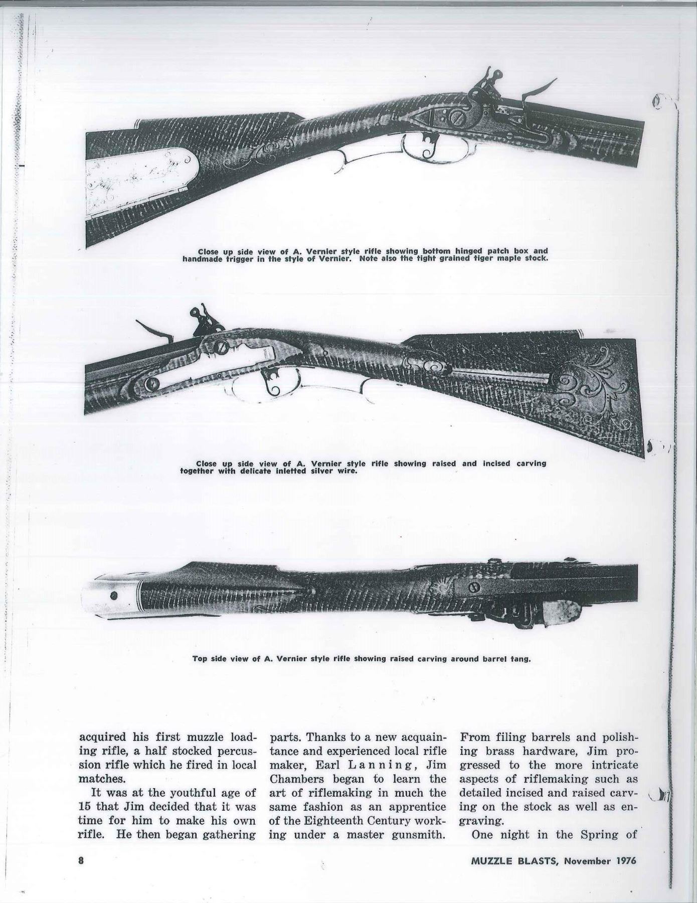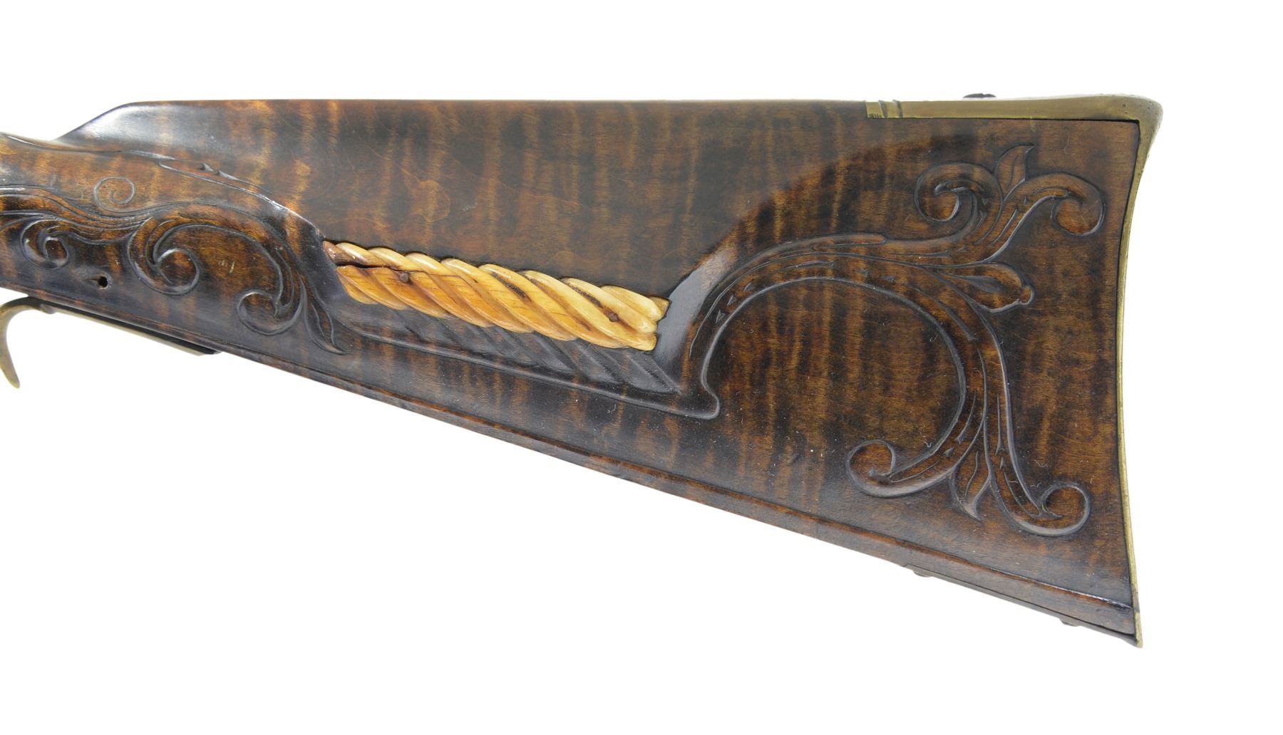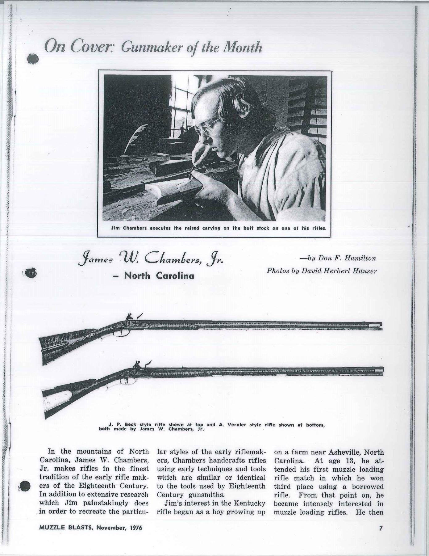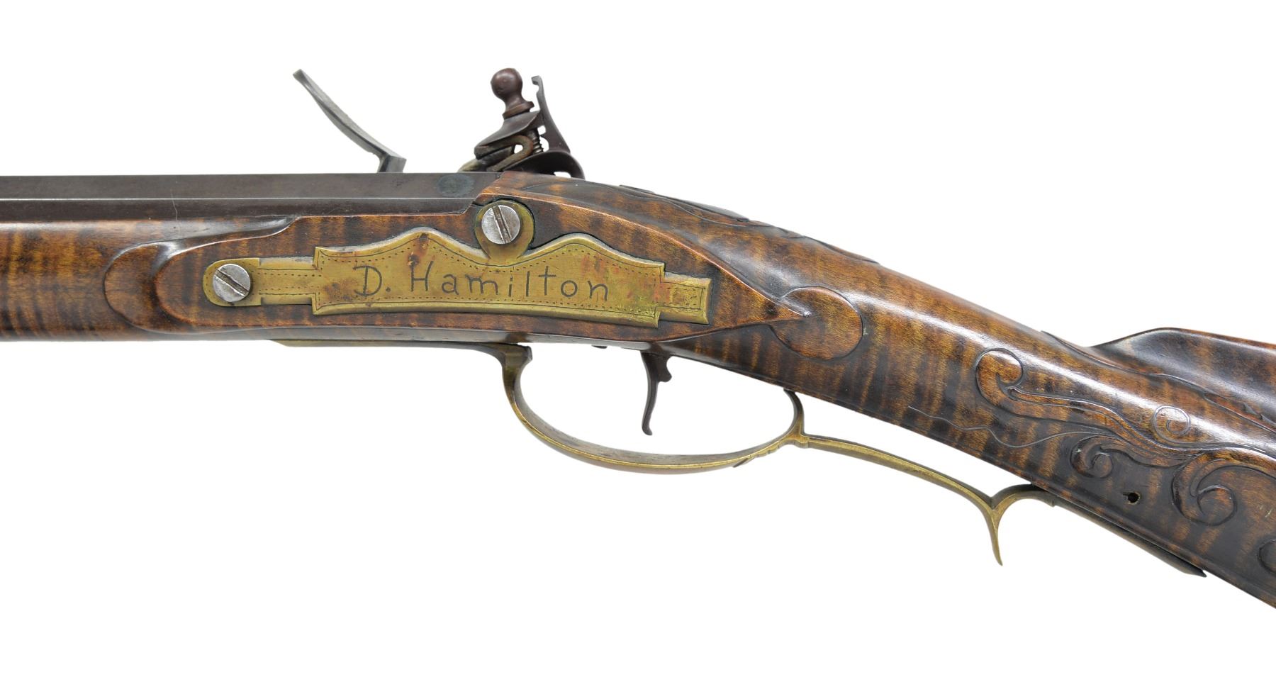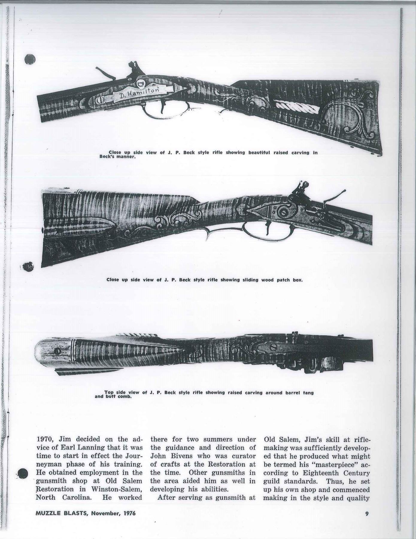 RIFLE IN STYLE OF J P BECK BY JAMES CHAMBERS, CANDLER, NORTH CAROLINA. Cal. 45. NSN. About 60" overall. This exact gun is featured in a 1976 "Muzzle Blasts Magazine"; cover article concerning contemporary master James Chambers. Bbl. 44" oct. to rnd. w/ wedding ring transitions, fixed rear sight & brass blade from sight, lockplate is beveled w/ rebated tail & flat serpentine cock, lined touch hole, brass furniture, striped maple stock w/ relief & incised carving, carved sliding wooden patchbox, inset spiral fluted bone cheek piece edge. Signed “D. Hamilton” on sideplate. UNATTACHED ACCESSORIES: photocopy of November 1976 article of "Muzzle Blasts" magazine featuring this gun. CONDITION: near excellent overall with small crack at the rear lock sideplate, metal smooth plum, wood is matching near excellent condition w/ good sheen & color. Mechanics functional w/ crisp rifled bore. (01-17242/JS). ANTIQUE. $2,000-3,000.