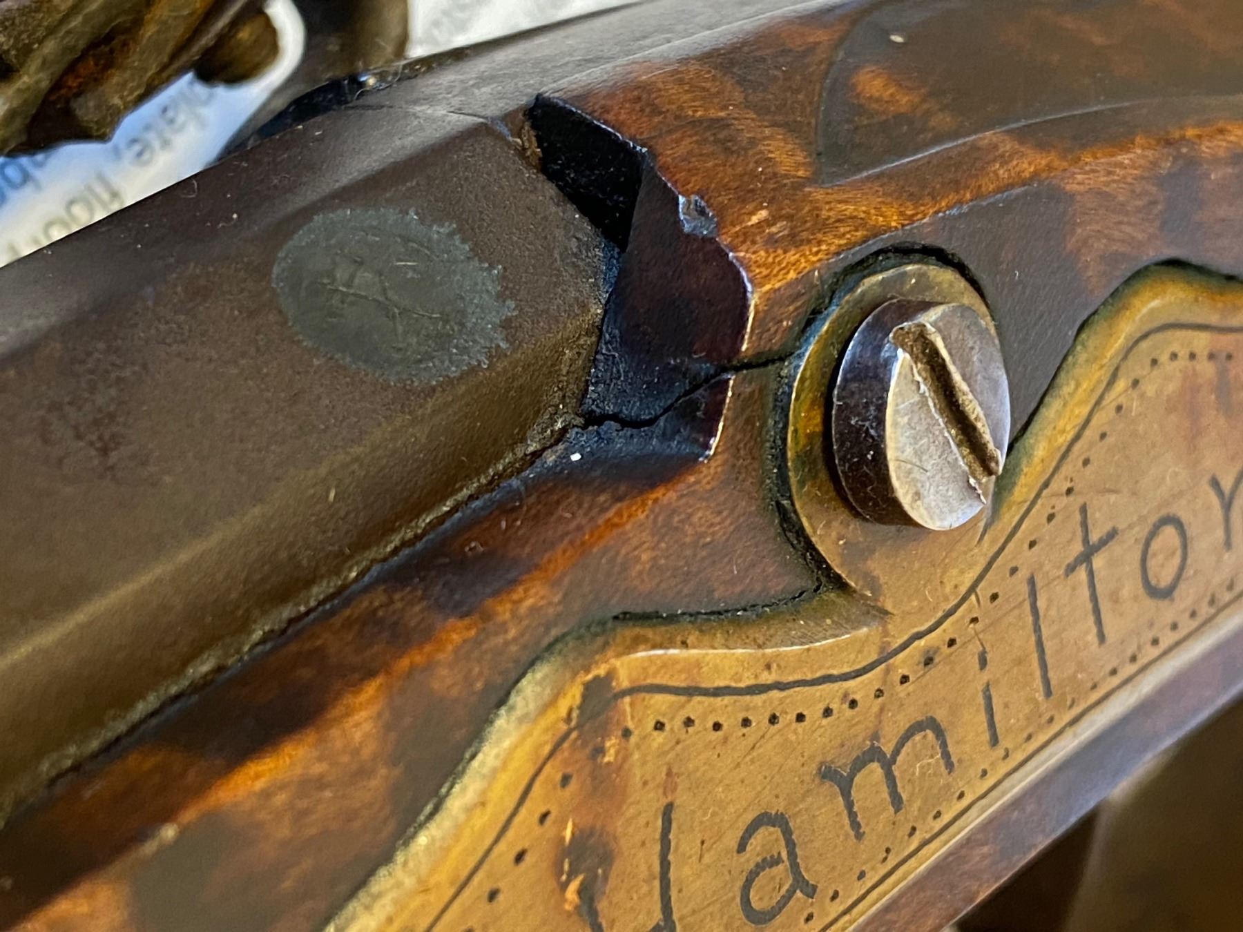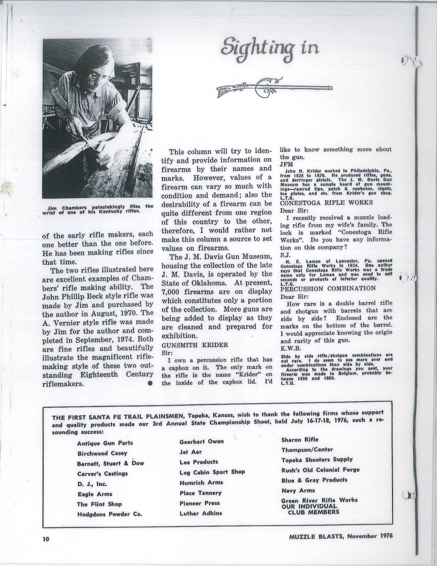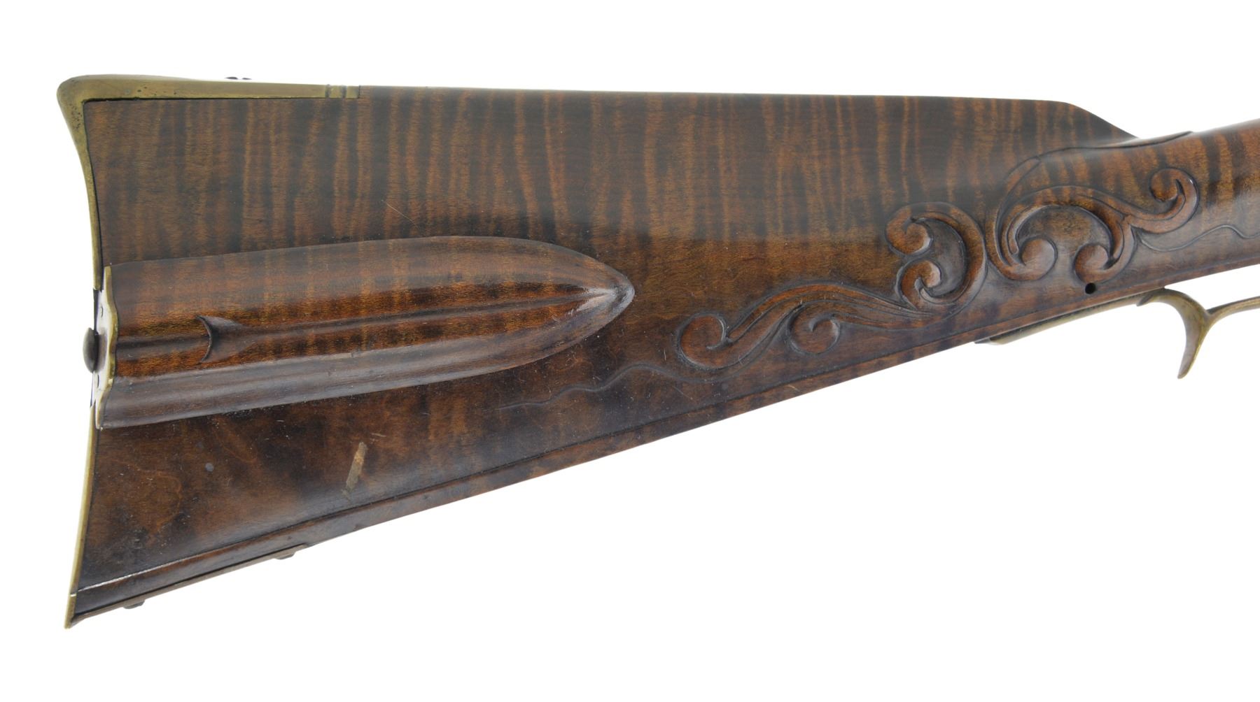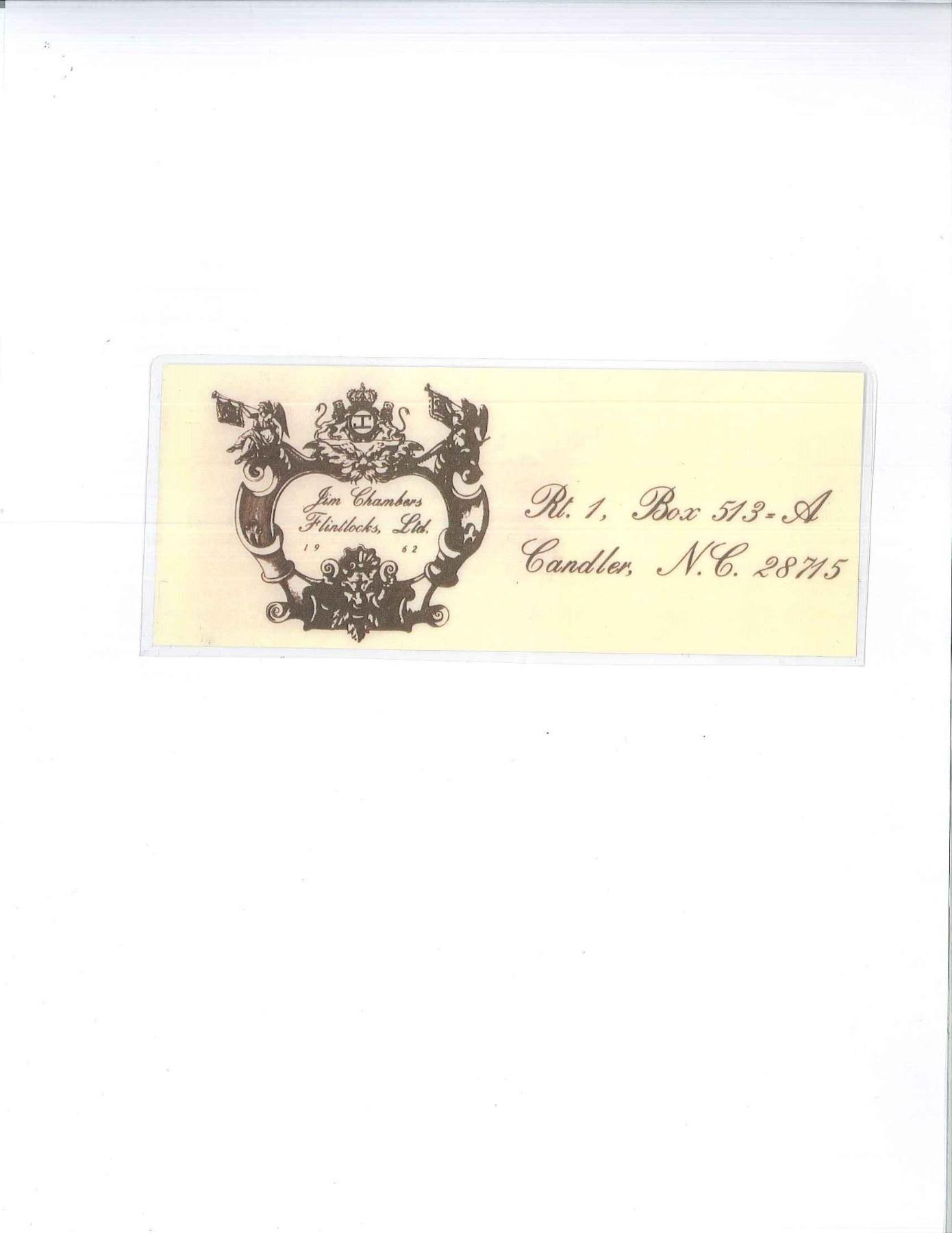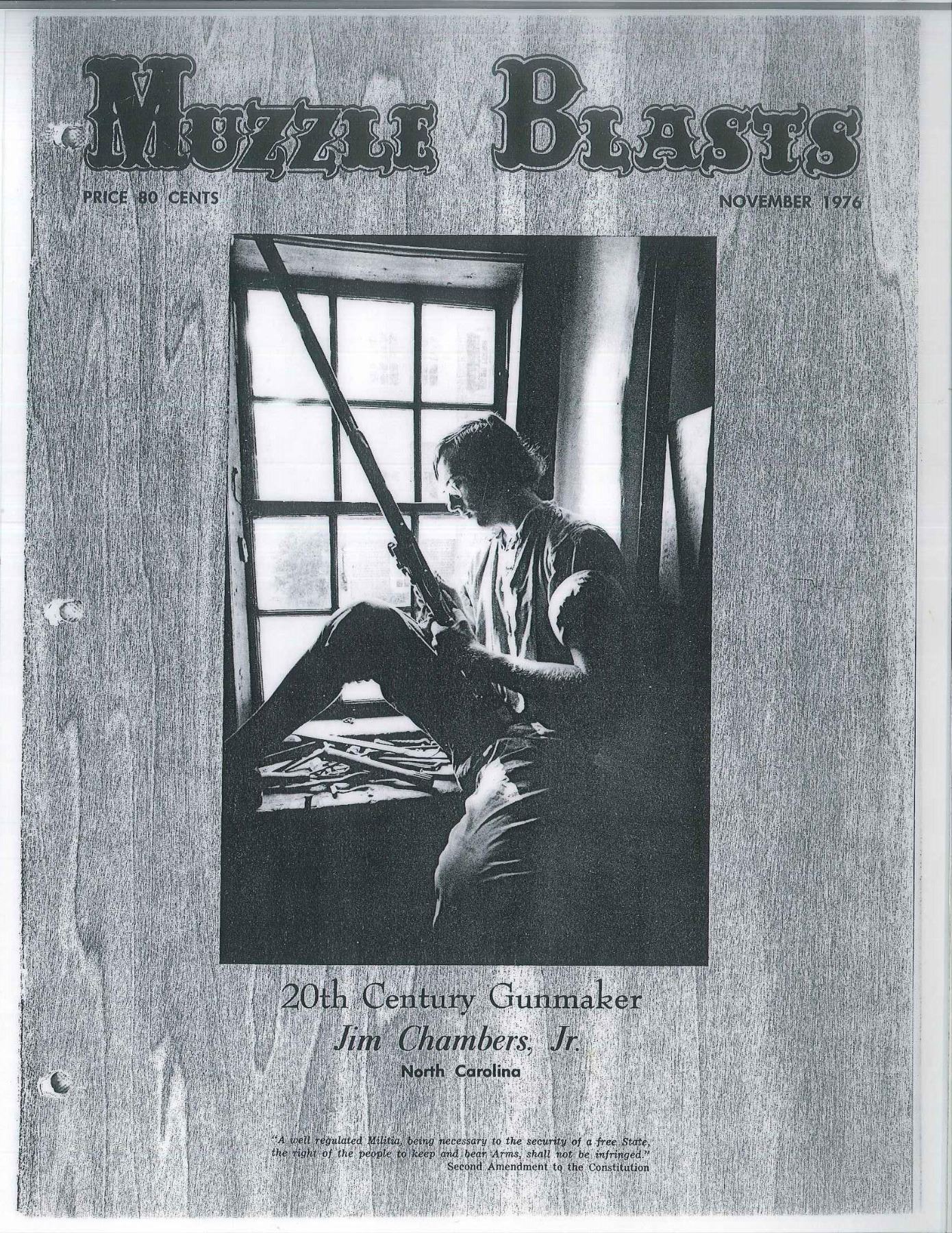 RIFLE IN STYLE OF J P BECK BY JAMES CHAMBERS, CANDLER, NORTH CAROLINA. Cal. 45. NSN. About 60" overall. This exact gun is featured in a 1976 "Muzzle Blasts Magazine"; cover article concerning contemporary master James Chambers. Bbl. 44" oct. to rnd. w/ wedding ring transitions, fixed rear sight & brass blade from sight, lockplate is beveled w/ rebated tail & flat serpentine cock, lined touch hole, brass furniture, striped maple stock w/ relief & incised carving, carved sliding wooden patchbox, inset spiral fluted bone cheek piece edge. Signed “D. Hamilton” on sideplate. UNATTACHED ACCESSORIES: photocopy of November 1976 article of "Muzzle Blasts" magazine featuring this gun. CONDITION: near excellent overall with small crack at the rear lock sideplate, metal smooth plum, wood is matching near excellent condition w/ good sheen & color. Mechanics functional w/ crisp rifled bore. (01-17242/JS). ANTIQUE. $2,000-3,000.