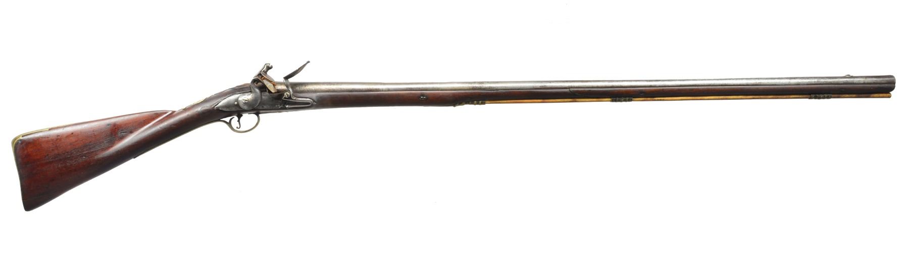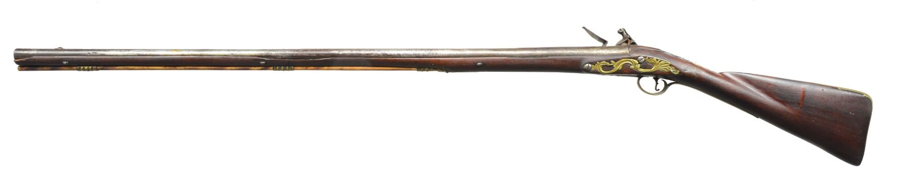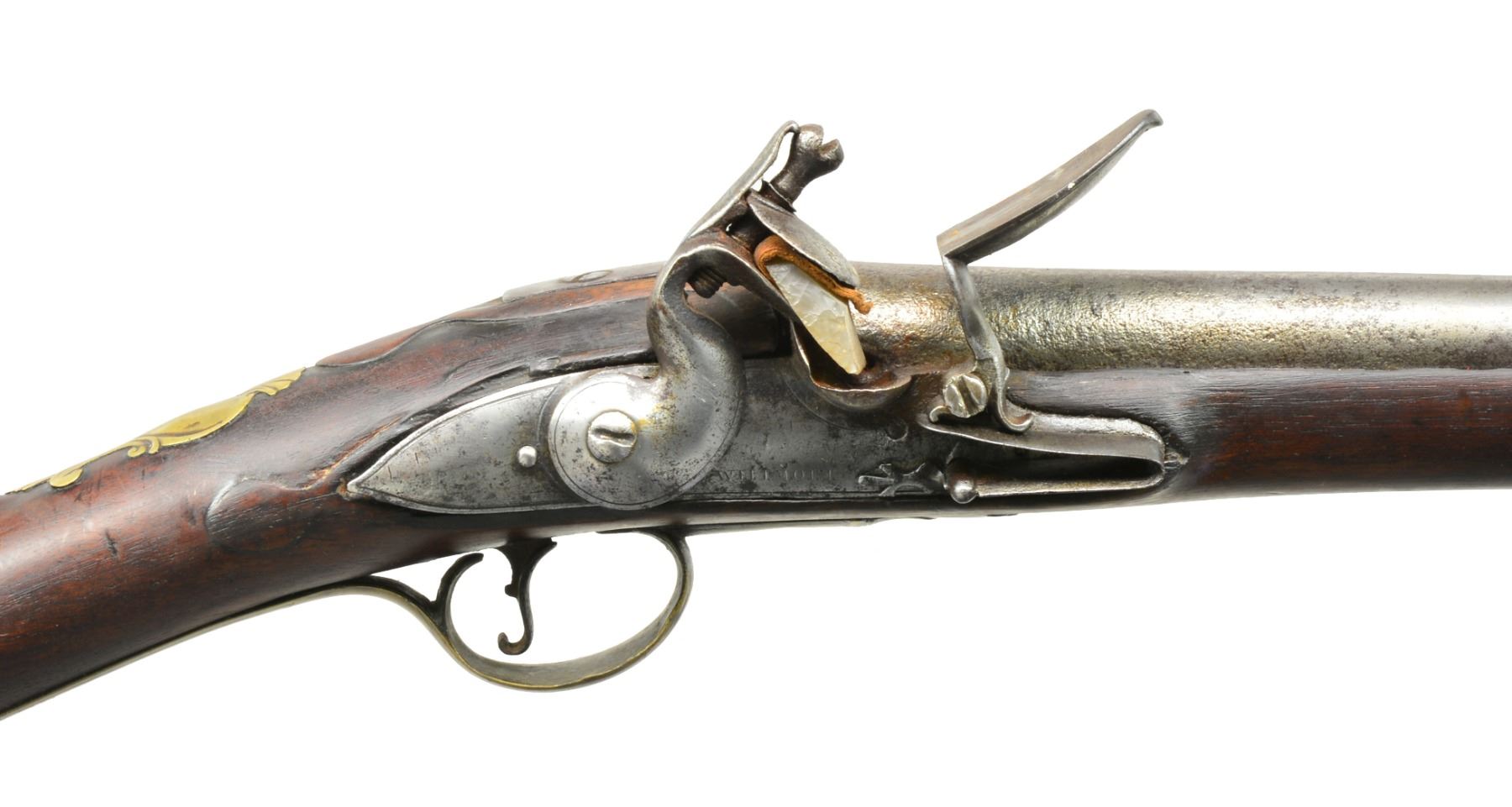Cal. 70 Bore. NSN. Heer lists a James Willmore working in London ca.1740. Characteristics of this fowler date it to approx.1760. Bbl. 38 3/8” tapered rnd. transitions through 2 bands toward breech end to slightly flared muzzle. London P & V proof marks are on breech end. Round bodied slightly arched lock has unbridled friction frizzen, spring w/ nicely filed finial. Lockplate, frizzen & rnd. bodied serpentine cock are line border engraved. “WILLMORE” is at bottom of lockplate. Relatively plain walnut stock has deeply fluted comb & raised carving around lock, tang & sideplate. Stock extends to muzzle & held to bbl. by 3 bolts. Furniture is of gun metal & has classic 1760’s styling w/ relief fleur di lis trigger guard finial, scrolled acanthus sideplate & buttplate w/ broad long top spur. A vacant crest plate, also of gun metal, at top of grip, has shell finial. Furniture is mostly line border engraved w/ some scroll. A new hickory ramrod is held by 2 fancy turned pipes & matching thimble. CONDITION: fair to good. Iron parts cleaned to pewter over considerable pitting. Wood has old oil finish over numerous marks w/ missing slivers of wood along bbl. channel w/ repair at rear pipe, cracks at toe w/ replaced piece. Mechanically good. Lock is not crisp. Bore is dark w/ red rust. (01-17471/MGM96). ANTIQUE. $1,200-1,800.