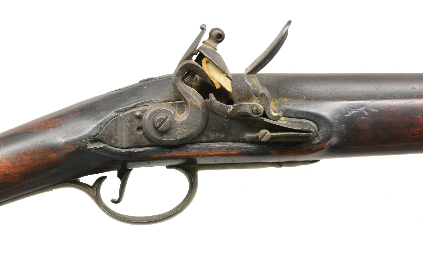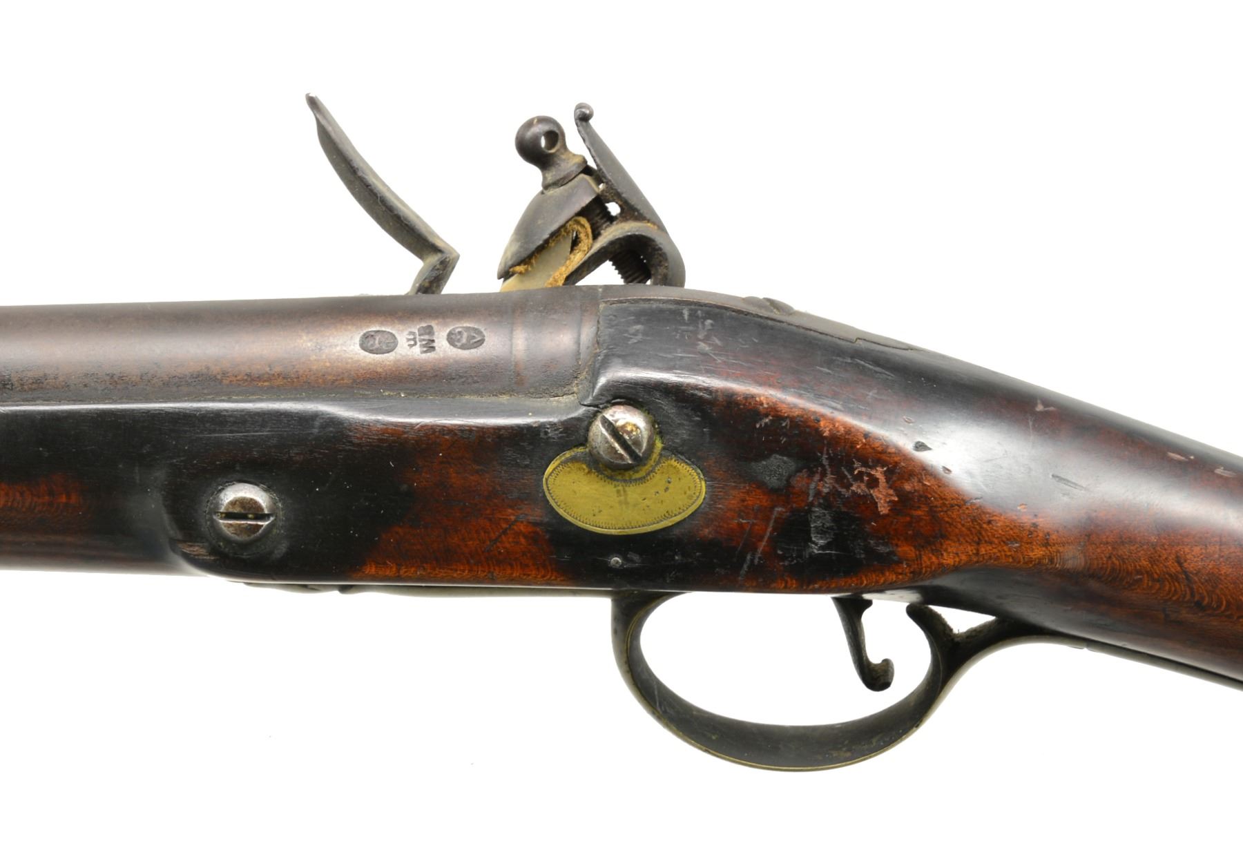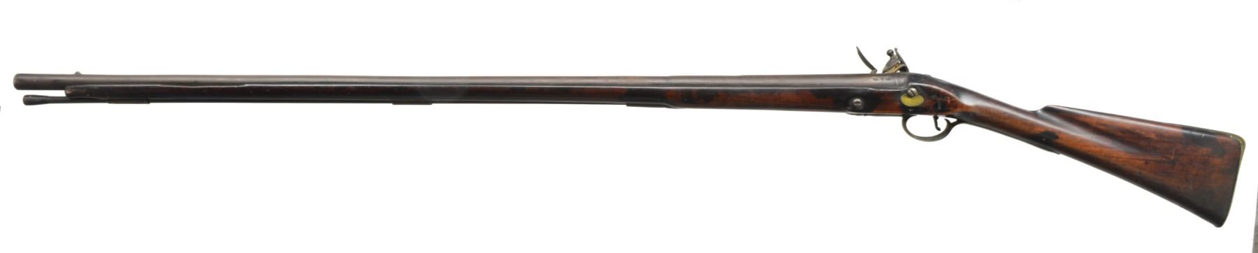 Cal. 72. NSN. Bbl. 45” tapered rnd. appears to be sourced from a British musket. London black powder proofs & initials “WB” are at breech end. Unmarked “trade” lock has bridled friction frizzen on serpentine cock. Stock of what appears to be cherry, has deeply fluted comb & extends to w/in 3” of muzzle. Furniture is of brass, again, most likely sourced from a British musket & lightly engraved. Sideplate which is only under rear lock screw is of ovate New England style. Stock is pinned to bbl. & a horn tipped hickory ramrod is held by 2 beaded brass pipes & thimble. CONDITION: good. Iron parts are a dark brown patina on overall pinprick pitting. Stock is quite attractive w/ considerable hand wear on what is likely a very old oil refinish. Mechanically good. Touchhole is considerably worn. Lock operable but far from crisp. Dark lightly pitted bore. (01-17463/MGM131). ANTIQUE. $700-1,100.