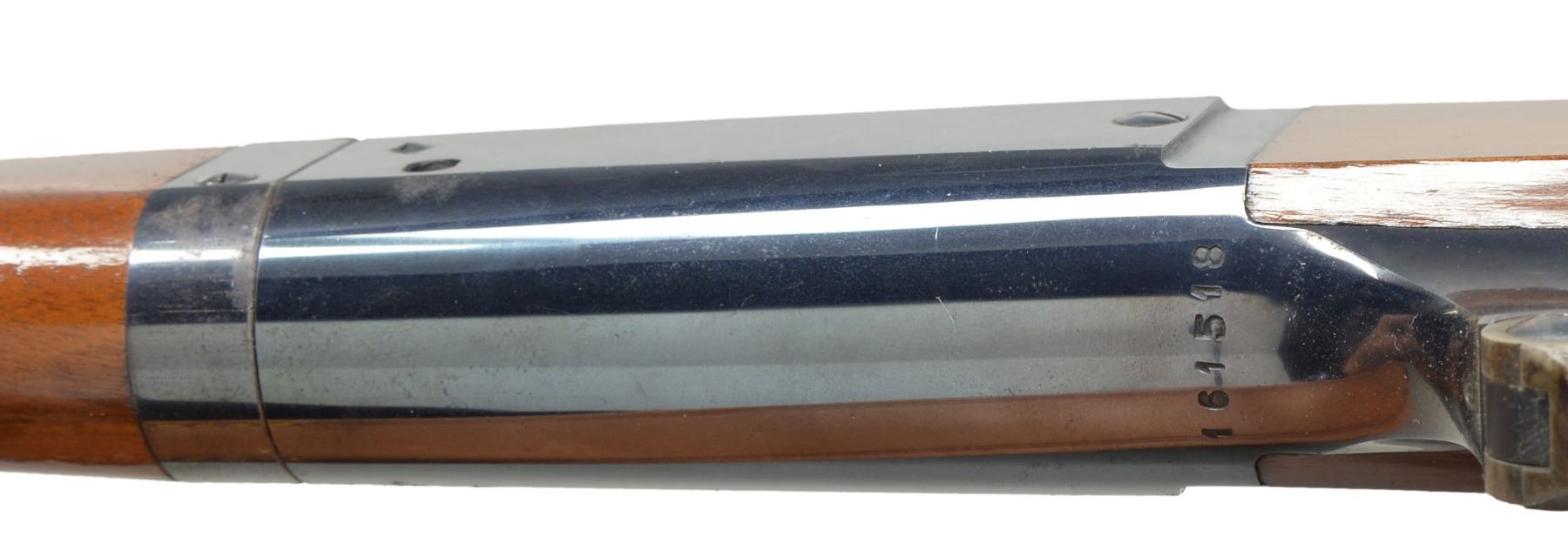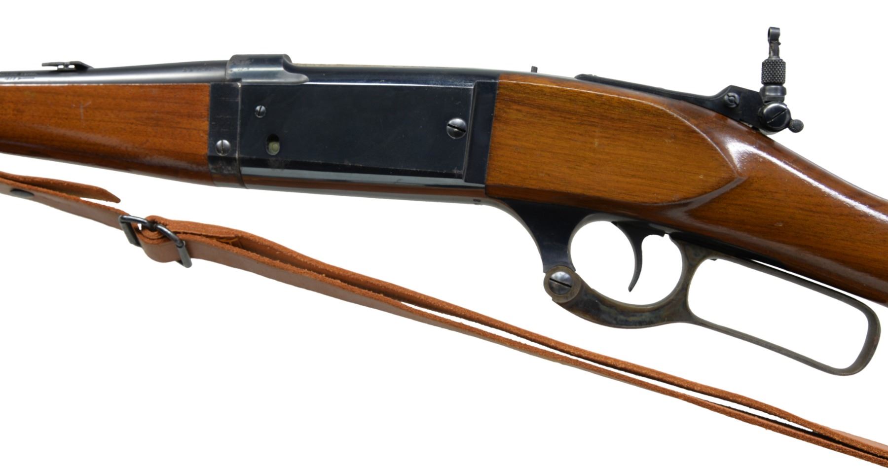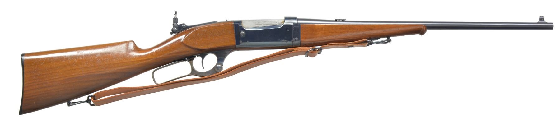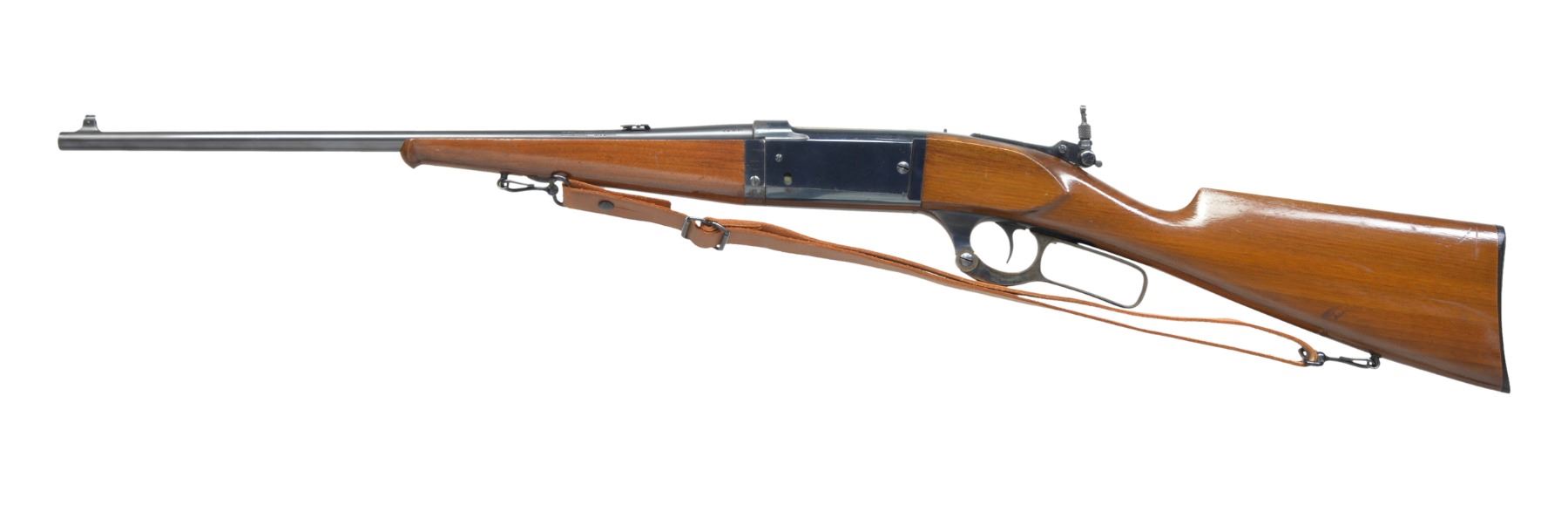 ACTION RIFLE. Cal. 22 High Power. S# 161518. Bbl. 20" lightweight rnd. of takedown style. White bead front sight, Lyman No. 6B folding leaf rear sight & Savage tang sight. Blue finish w/ case colored lever. Action features brass rotary mag. & bent tab safety. Schnabel tipped forearm & straight grip walnut stock w/ checkered hard rubber buttplate. Leather sling on sling eyes hold leather sling on factory style hooks. Mfg. 1914. CONDITION: bbl. & action retain over 95% bright blue showing sm. spots of pitting on action & forearm iron. Lever retains 90% lightly faded case colors showing sm. spots of pitting. Unsanded wood has coat of added finish w/ lg. area of blistering on right side of stock. Bore is bright w/ crisp rifling. (19-5766/DS). CURIO. $1,500-2,000.