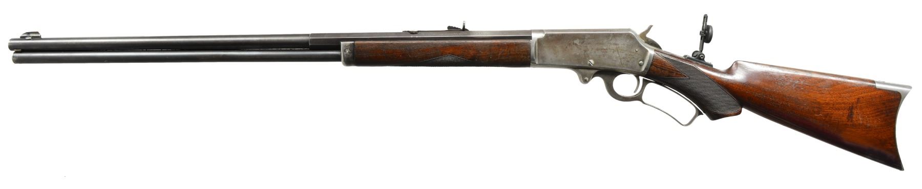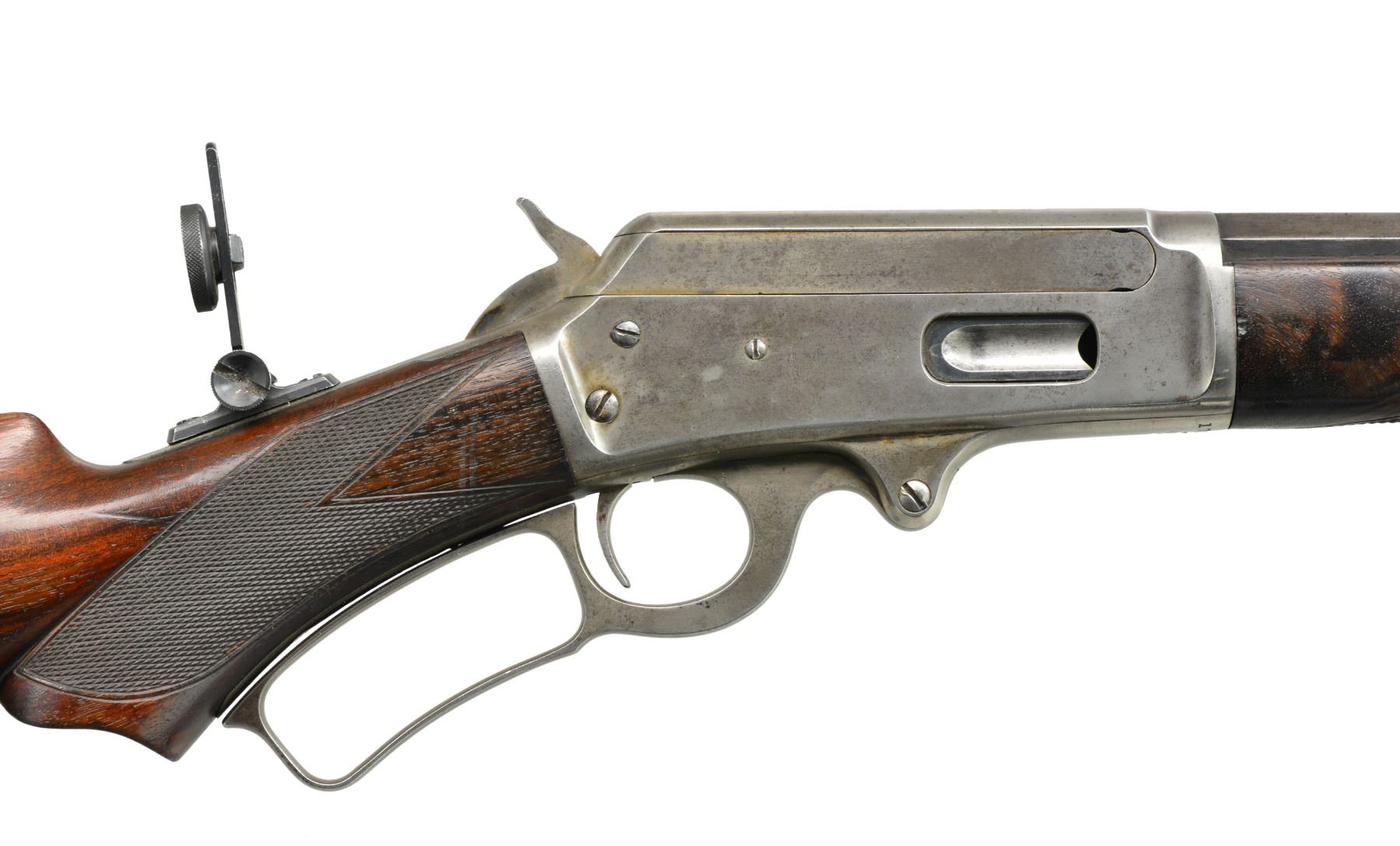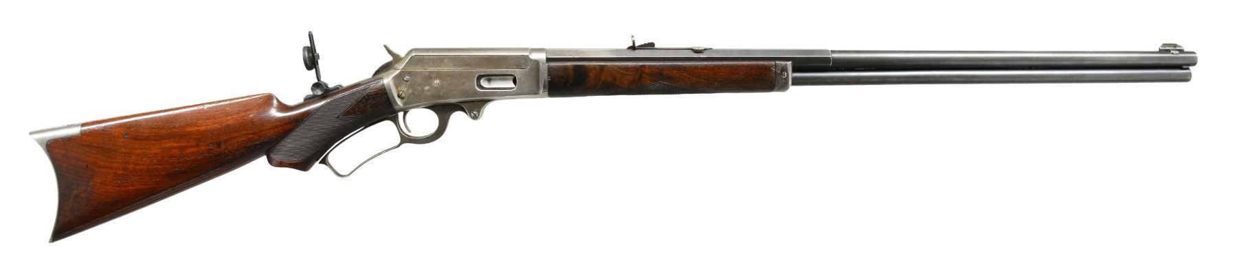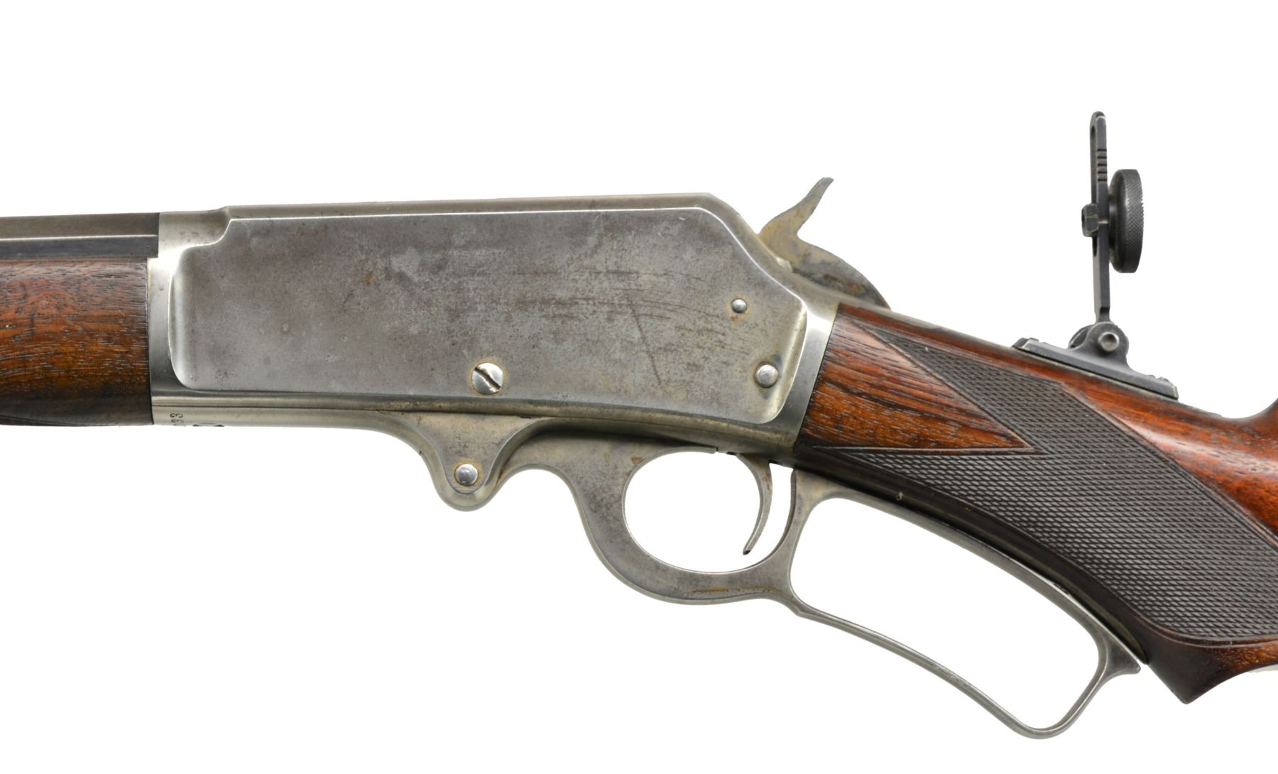 Cal. 30-30. S# 171033. Bbl. 26" oct. to rnd. Marbles Sheard front sight, semi buckhorn sporting rear sight w/ Vernier tang sight. Case colored action. Full length mag. Walnut forearm & S curved pistol grip stock w/ crescent steel buttplate & style A factory checkering. 1898 Mfg. CONDITION: bbl. & mag. tube retain 60% dull faded blue. Action finish has faded to mottled silver gray. Stock finish shows wear w/ scratches, dents & handling marks. Checkering is freshened. Bore has slightly darkened appearance w/ intact rifling. (01-17690/DS). ANTIQUE. $3,000-4,500.