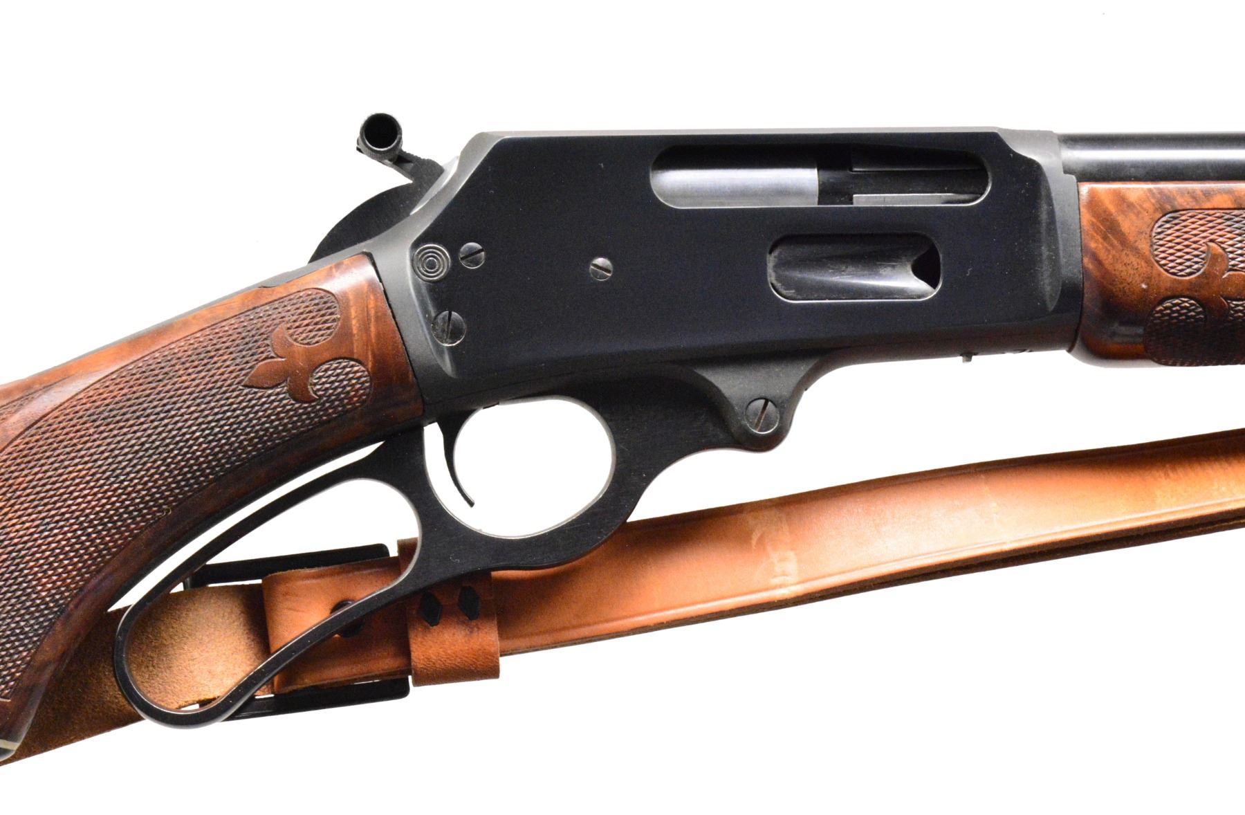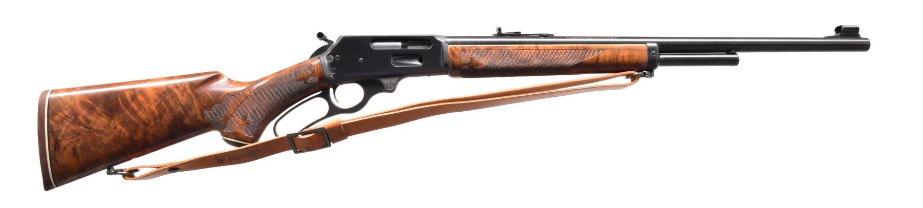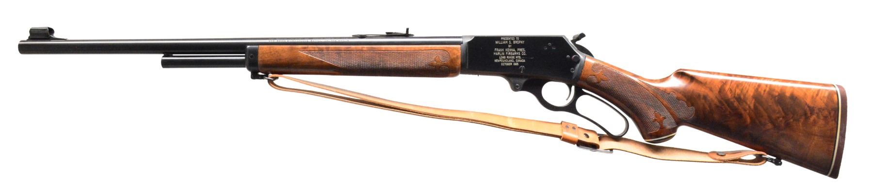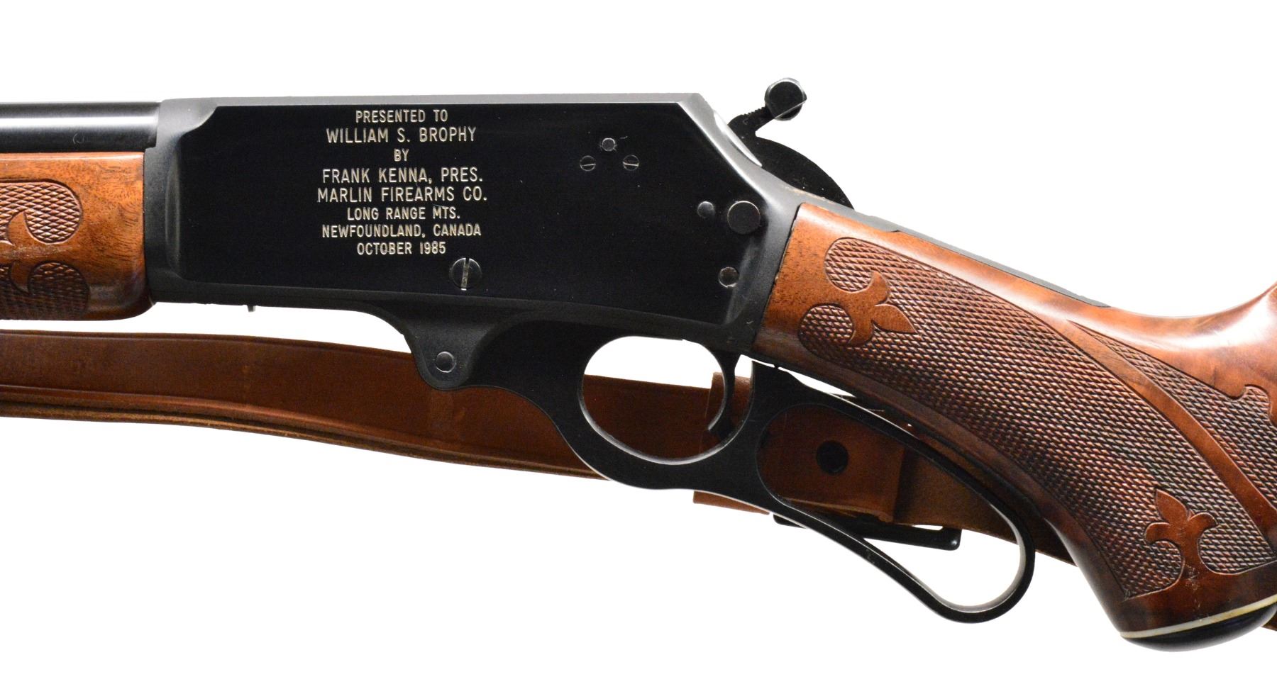 BROPHY BY FRANK KENNA, PRESIDENT OF MARLIN FIREARMS. Cal. 444 Marlin. S# 15037758. Bbl. 22" rnd. w/ Micro-Groove rifling. Ramp mounted hooded bead front sight & elevator adj. sporting rear sight. 2/3 Length mag. Blued action has white filled presentation on left side "PRESENTED TO / WILLIAM S BROPHY / BY / FRANK KENNA, PRES. / MARLIN FIREARMS CO. / LONG RANGE MTS. / NEWFOUNDLAND, CANADA, OCTOBER 1985". Action has crossbolt safety & hammer extension. Semi beavertail forearm & pistol grip stock of presentation grade black walnut w/ segmented fleur-de-lis borderless hand checkering. Stock features hard rubber grip cap w/ white line spacer, Marlin rifle pad & Marlin marked leather sling on QD swivels. UNATTACHED ACCESSORIES: signed letter from Lt. Col. Brophy's daughter regarding this lot. CONDITION: 98% original blue. Stocks have good finish showing sm. marks. Stock shows sm. gaps in fitting between receiver & tangs. Bore is bright w/ sharp rifling. PROVENANCE: From the collection of Lt. Col. William S. Brophy. (19-5587/DS). MODERN. $800-1,200.