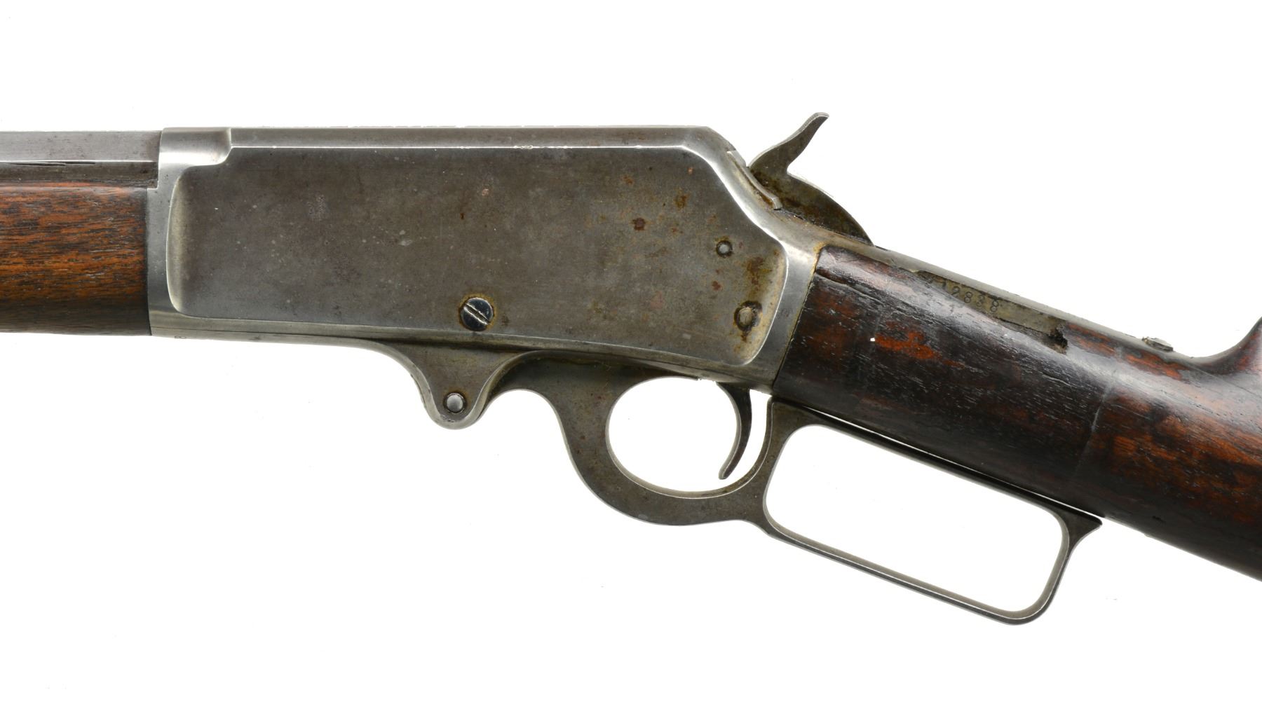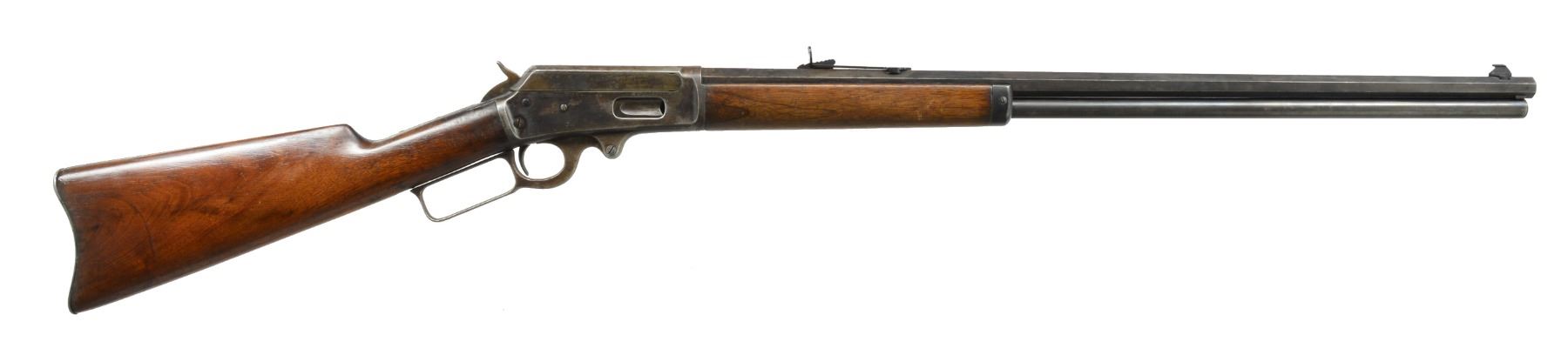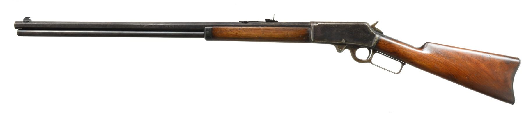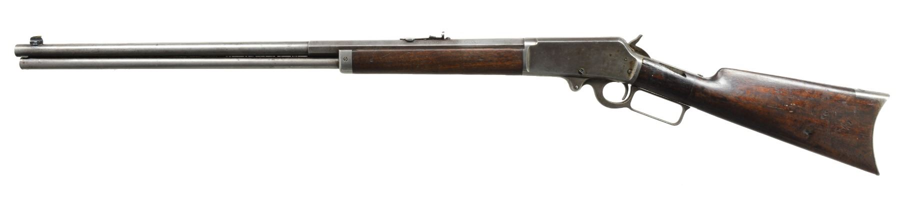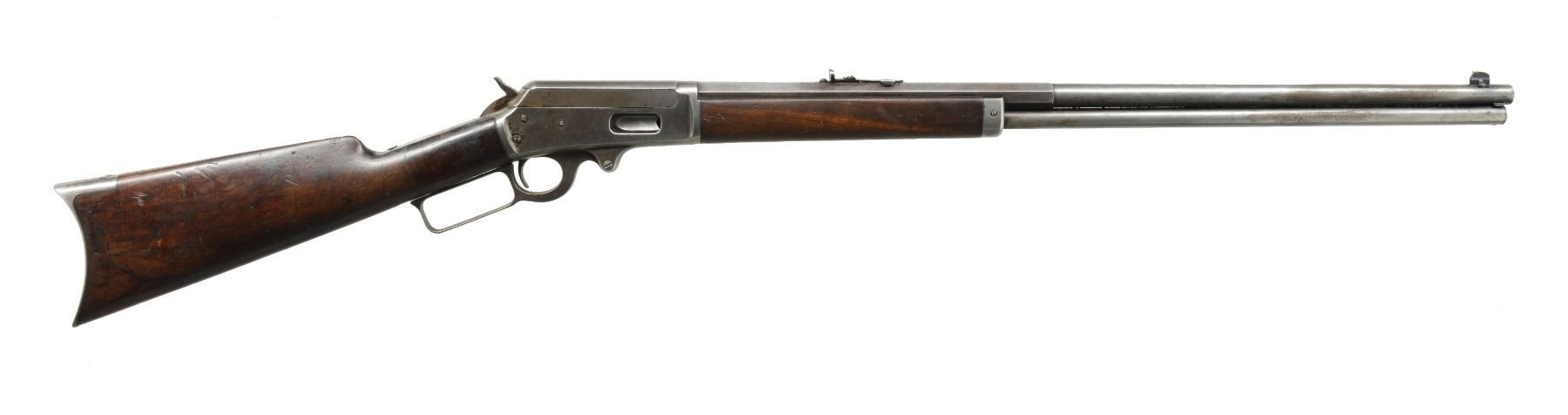 1) Cal. 38-55. S# 426534. Bbl. 26" oct. w/ replacement bead front sight & replacement elevator adj. rear sight. Full length mag. Walnut forearm & straight grip stock w/ crescent steel buttplate. CONDITION: metal shows dull faded finish w/ scattered light pitting & corrosion. Wood has added finish over a worn appearance showing sanding marks, sm. dents & handling marks. Bore is generally bright w/ sound rifling. (20-1117/DS). 2) Cal. 25-36 M. S# 212838. Bbl. 26" oct. to rnd. Marbles replacement bead front sight & sporting rear sight. Full length mag. Walnut forearm & straight grip stock w/ crescent steel buttplate. 1900 Mfg. CONDITION: metal finish is fading to mottled gray showing areas of corrosion & rust. Forearm has dark worn appearance w/ scratches & marks. Dark worn stock is split at head w/ cracks extending from action & tangs. Left side missing lg. chip left of top tang. Dark bore has worn rifling. (20-1125/DS). ALL CURIO. $1,000-1,300.