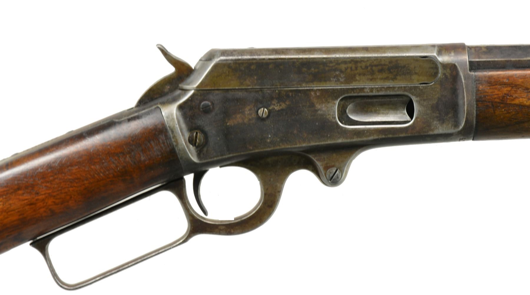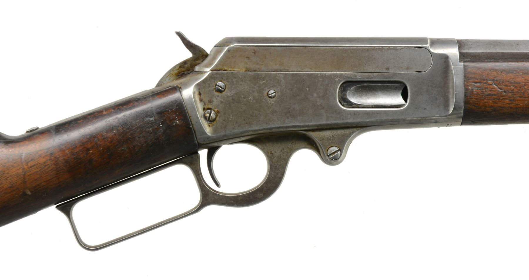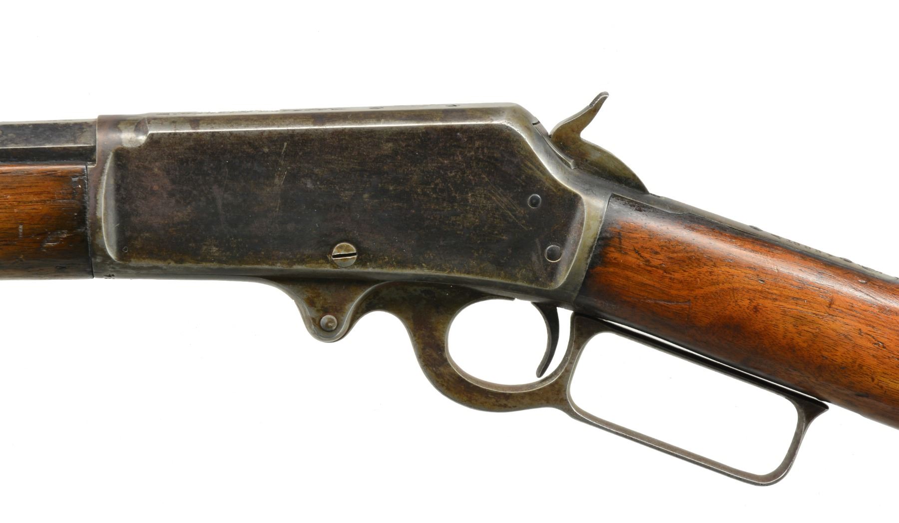 1) Cal. 38-55. S# 426534. Bbl. 26" oct. w/ replacement bead front sight & replacement elevator adj. rear sight. Full length mag. Walnut forearm & straight grip stock w/ crescent steel buttplate. CONDITION: metal shows dull faded finish w/ scattered light pitting & corrosion. Wood has added finish over a worn appearance showing sanding marks, sm. dents & handling marks. Bore is generally bright w/ sound rifling. (20-1117/DS). 2) Cal. 25-36 M. S# 212838. Bbl. 26" oct. to rnd. Marbles replacement bead front sight & sporting rear sight. Full length mag. Walnut forearm & straight grip stock w/ crescent steel buttplate. 1900 Mfg. CONDITION: metal finish is fading to mottled gray showing areas of corrosion & rust. Forearm has dark worn appearance w/ scratches & marks. Dark worn stock is split at head w/ cracks extending from action & tangs. Left side missing lg. chip left of top tang. Dark bore has worn rifling. (20-1125/DS). ALL CURIO. $1,000-1,300.