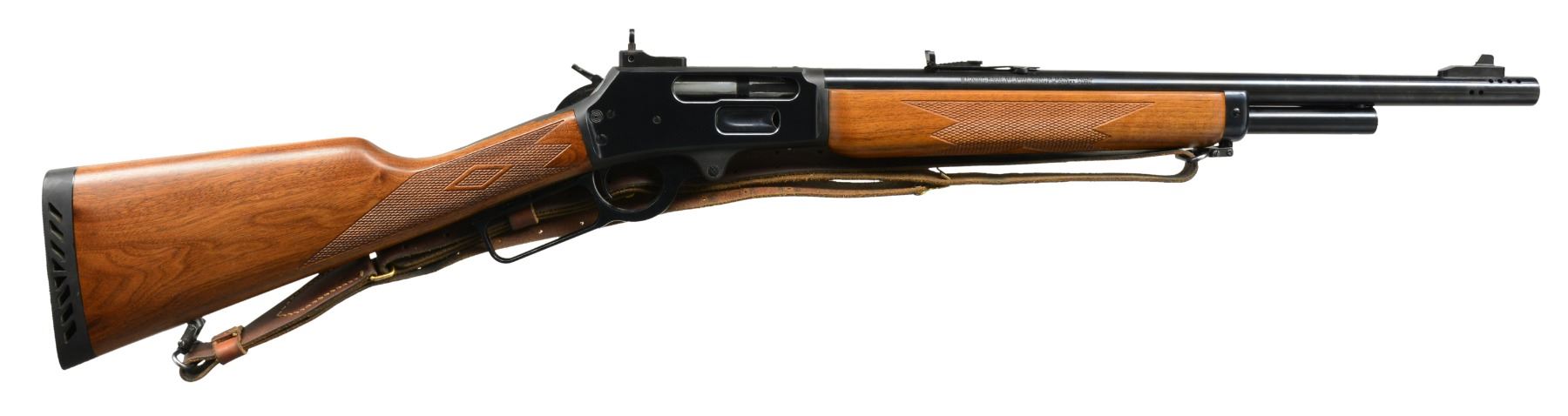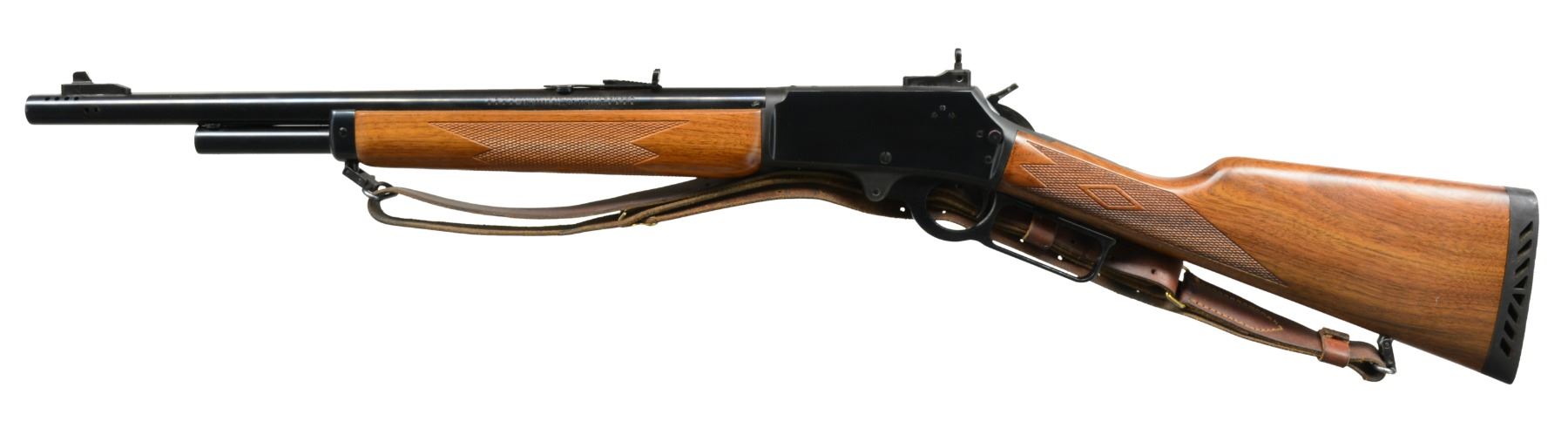 ALL: cal. 45-70. North Haven, CT. Bbl. addresses. 1) MODEL 1895 CB COWBOY. S# 99120914. Bbl. 26" oct. w/ cut rifling. Bead front sight & elevator adj. buckhorn rear sight. Full length mag. Blue finished. Crossbolt safety. Walnut forearm & straight grip stock w/ crescent steel buttplate. CONDITION: over 98% original blue. Stock shows sm. marks. Bright near excellent bore. (20-1203/DS). 2) MODEL 1895G GUIDE RIFLE. S# 01066658A. Bbl. 18 1/2" ported w/ cut rifling. Ramp mounted blade front sight, elevator adj. folding leaf rear sight & ghost ring receiver sight. Blue finish. Crossbolt safety. 3/4 Length mag. Heavy walnut forearm & straight grip stock w/ cut checkering & original black ventilated pad. Brauer Bros. military style leather sling on QD swivels. CONDITION: over 98% blue. Stock shows sm. marks. Bright near excellent bore. (20-1211/DS). ALL MODERN. $1,000-1,500.