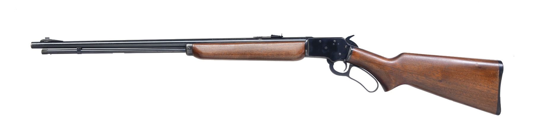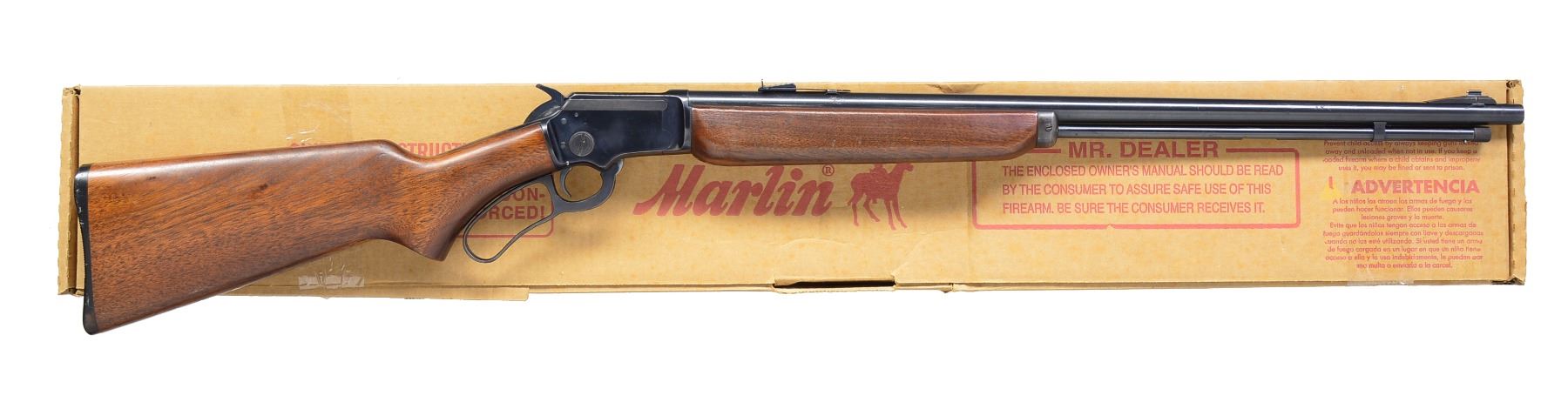 Cal. 22 S, L, LR. S# C741. Bbl. 24” rnd. marked “ THE MARLIN FIREARMS CO – MODEL 93-A / NEW HAVEN CONN U.S.A. 22 S, L, AND LR”. Pre Micro-Groove rifling. Open sporting rear sight. Bead front sight w/ ramp. Receiver drilled & tapped for scope. Drilled & tapped for tang sight. Blued trigger. Pistol grip walnut stock set w/ semi beavertail forend. Black plastic buttplate. Marlin Bullseye on belly of stock. UNATTACHED ACCESSORIES: modern Marlin cardboard shipping box. CONDITION: stock set has light wear w/ scattered sm. scratches & handling marks. Metal has 80% blue w/ light wear scattered scratches & spots of light oxidation. Bbl. has sm. dents on both sides of rear sight due to improper tool. Plug screws are not present in tang. Very good shiny bore. (20-715/RW). CURIO. $500-700.
