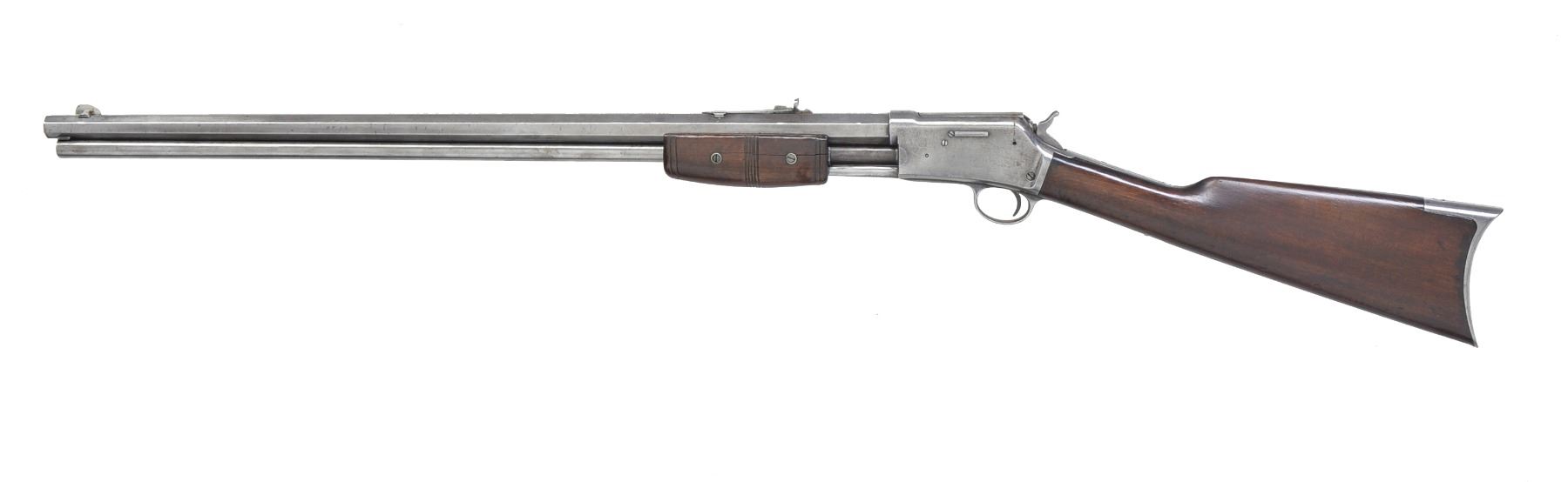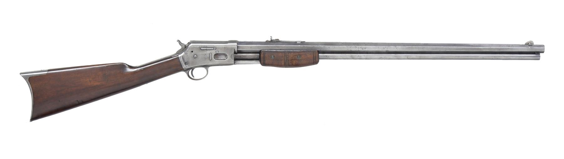 Cal. 32-20. S# 85178. Bbl. 26" oct. German silver blade front sight w/ sporting rear sight having replacement elevator. Full length mag. 2 Piece replacement forearm. Straight grip walnut stock has crescent steel buttplate. 1899 Mfg. CONDITION: metal is polished bright showing scattered areas of pitting. Forearm shows heavy wear w/ cracks down both sides. Sanded & refinished stock shows dents & handling marks w/ chips along both sides of top tang. Bore is dark retaining well defined rifling. (20-1328/DS). CURIO. $800-1,200.