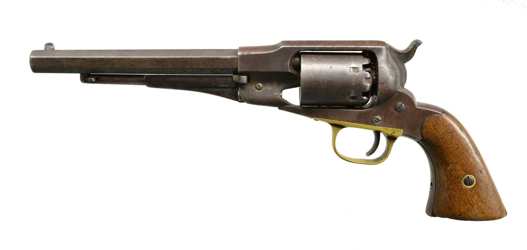 TO COLONEL PRICE OF MISSOURI. Cal. 36. S# 33644. Bbl. 7 3/8” oct. Top flat is marked "PATENTED SEPT. 14, 1858 / E. REMINGTON & SONS, ILION, NEW YORK. U.S.A. / NEW - MODEL". 6 Shot rnd. cyl. Brass trigger guard. 2 Piece walnut grips. Letter "C" mark is found on left side of trigger guard. Total of approx. 28,000 New Model Navy revolvers were produced 1863-1878. A historic Civil War era revolver associated w/ Colonel James A. Price of Weston, Missouri. Colonel Price was born in 1829 in Bedford County, Virginia. His mother was Nancy Lee, a first cousin of Robert E. Lee. In 1840 he came to Missouri w/ his family. According to provenance supplied w/ the revolver, Price studied dentistry & after completing his schooling opened a practice in Weston, MO. In 1852, he married Russella Warner, a great granddaughter of Daniel Boone. At the war's outbreak, then Captain Price recruited & commanded a unit of 18th Missouri Volunteers that was engaged in a number of battles, most significantly Shiloh. Capt. Price was seriously wounded at Shiloh but remained w/ Grant's army through the Battle of Corinth. Following Corinth, Price was suffering badly from his disability caused by wounds. On July 7th, 1862, Price resigned & returned to Weston, MO. After recovering from his injuries, he responded to the call of the Governor & organized 800 men for the State Militia. He was subsequently made colonel of the regiment. The Missouri State Militia was tasked w/ ridding the country of armed bandits & southern raiders. UNATTACHED ACCESSORIES: binder containing substantial quantities of information provided by the consignor related to Col. Price, his Civil War history, family & home. Also includes history of the Remington Navy Model revolver & numerous photos, newspaper articles & pertinent information. CONDITION: metal retains sm. amount of original blue w/ balance fading to a brown patina showing wrench marks on bbl. w/ many tiny dents on receiver. Grips have dents & chips at butt & show moderate overall wear. Good bore w/ a few spots of pitting & strong rifling. (01-17366/DS/BF). ANTIQUE. $2,500-4,000.
