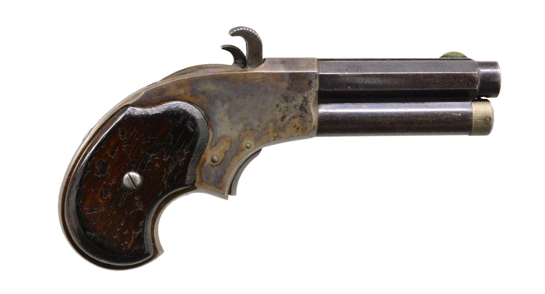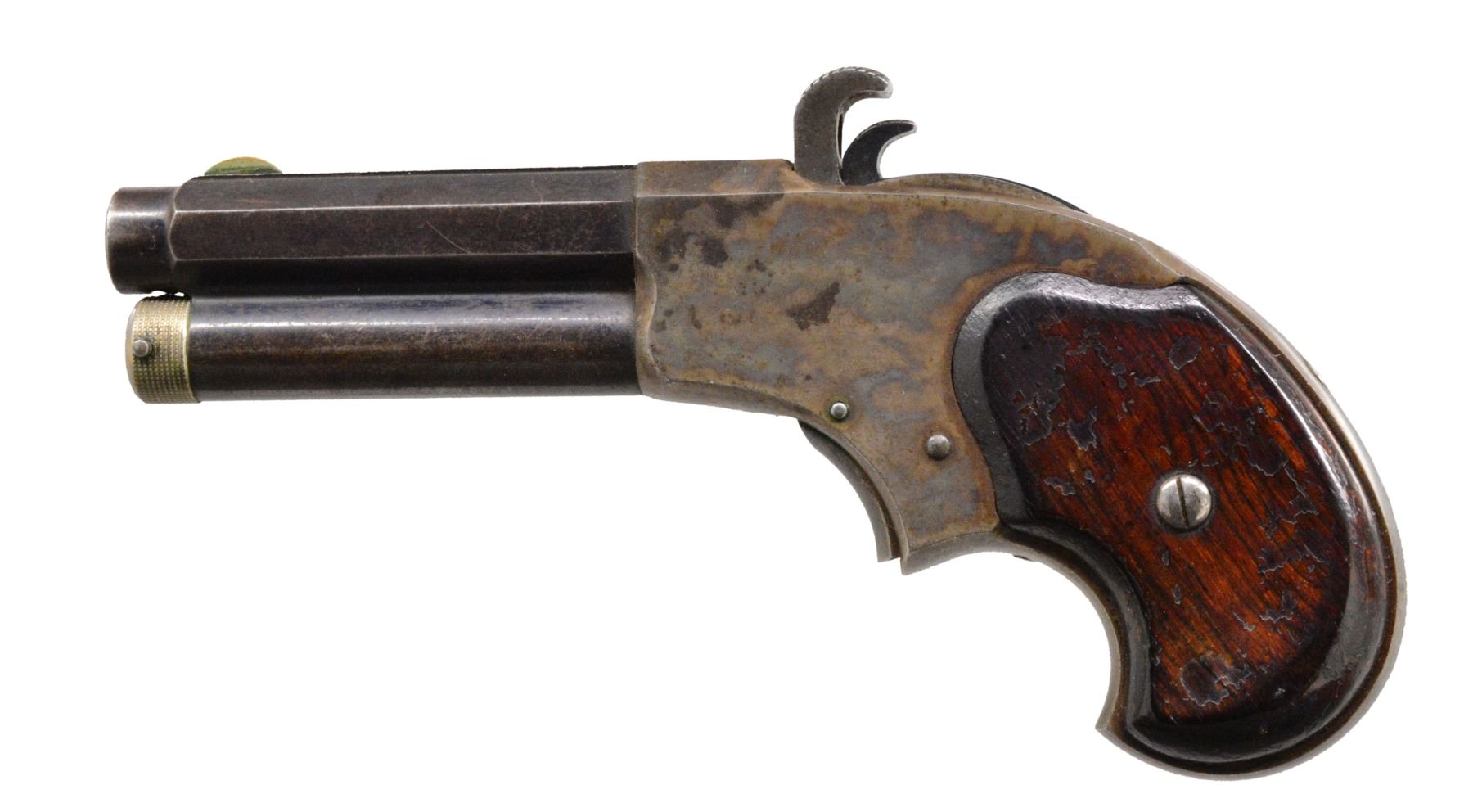 Cal. 32 RF Extra Short. NSN. Bbl. 3 1/8" oct. bbl. w/ integral mag. & semi circular German silver front sight. Case colored action. Spur trigger. Integral breech block & cartridge carrier. 5 Shot mag. loads from front end. 2 Piece rosewood grips. Approx. 15,000 mfg. 1871-1888. CONDITION: bbl. & mag. retain 70% dull fading blue. Action retains 50% light & fading case colors. Grips show wear w/ scattered blistered & peeling finish. Bore retains sound rifling showing some very light pitting. (01-16872/DS). ANTIQUE. $1,000-1,500.
