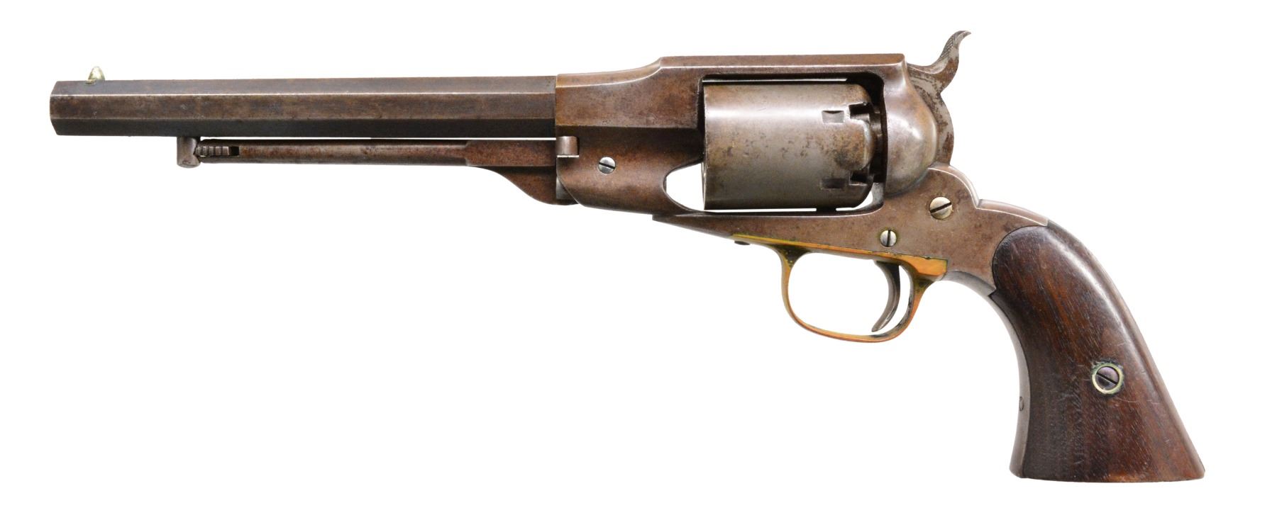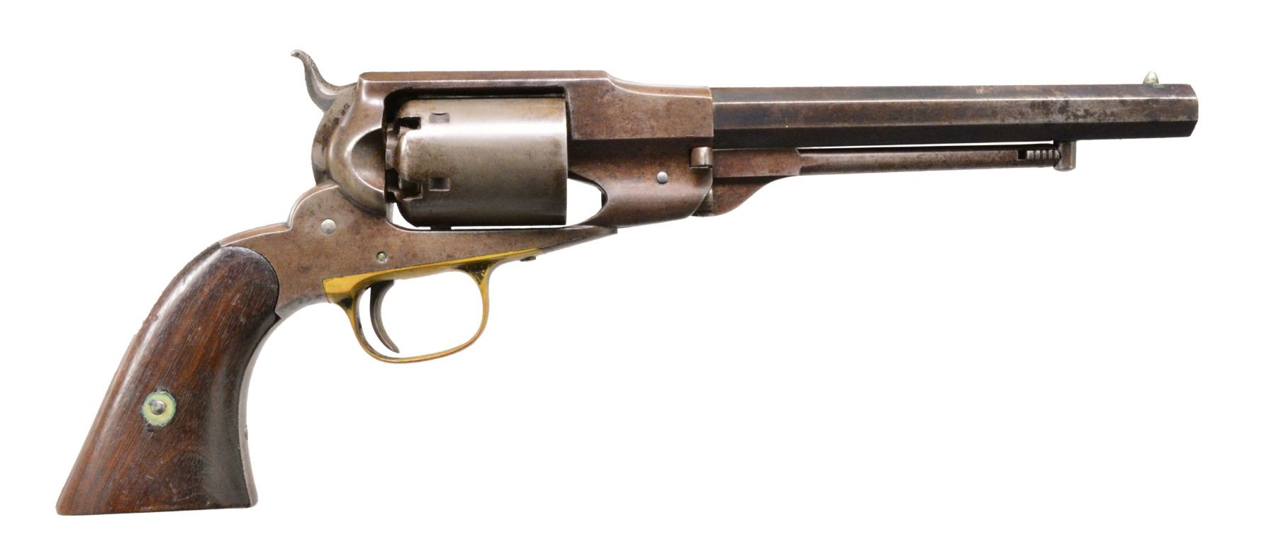 Cal. 36. S# 3878. Bbl. 7 1/2" oct. w/ cone style front sight. Rnd. 6 shot cyl. Blue finish w/ brass trigger guard. 2 Piece walnut grips. Estimated quantity 14,500 mfg. 1861-1862. CONDITION: metal finish is faded to mottled gray brown showing scattered spots of light pitting. Grips have dark worn appearance showing handling marks w/ sm. dents at butt. Bore has dull frosted appearance over worn rifling w/ a partial ring from debris damage approx. 2" from muzzle. (01-16867/DS). ANTIQUE. $800-1,200.
