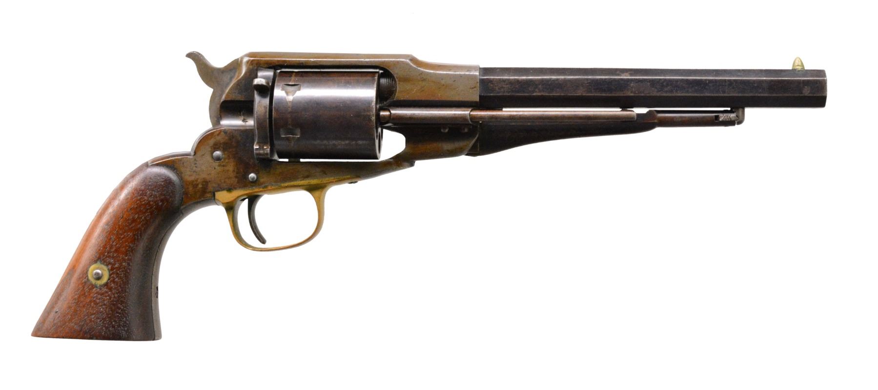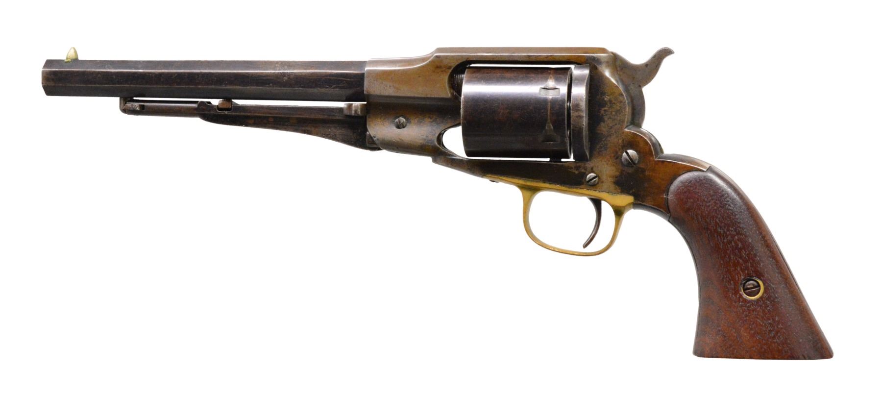 REVOLVER. Cal. 38 CF. S# 20715. Bbl. 7 3/8" oct. w/ cone style front sight. Breech end of top flat marked w/ Navy anchor. 6 Shot rnd. cyl. Remington contract conversion w/ ejector rod & loading gate. Blue finish w/ brass trigger guard. 2 Piece walnut grips. Conversion no "370" is found on bottom bbl flat & under left grip. CONDITION: metal has faded gray brown appearance showing scattered spots of pitting. Refinished grips show wear & handling marks w/ numerous sm. dents at butt. Bore retains largely intact rifling w/ lightly visible ring near mid point. (01-16870/DS). ANTIQUE. $800-1,200.