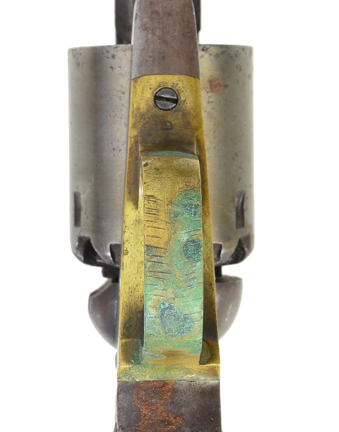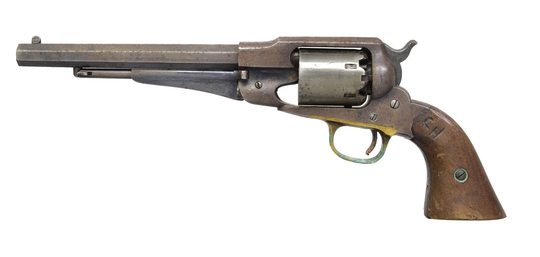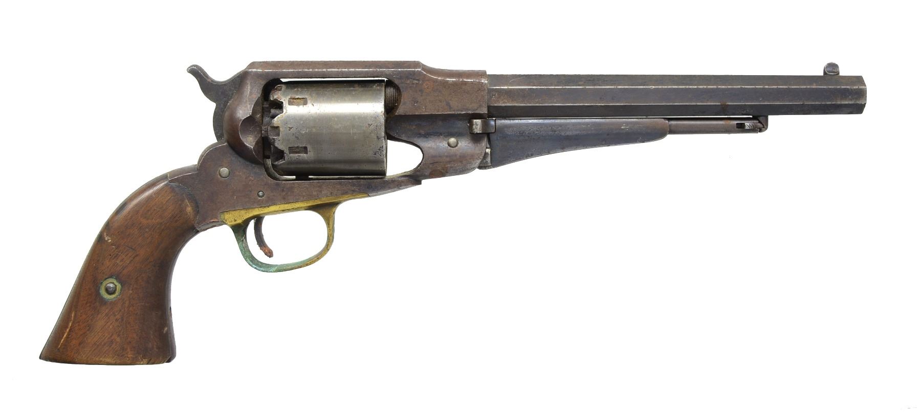 Cal. 44. S# 102785. This was the 2nd most popular Civil War sidearm purchased by the U.S. Government. Standard configuration w/ 8" oct. bbl. w/ 3 line address. 2 Piece wood grips w/ well discerned "OWA" cartouche (O.W. Ainsworth). CONDITION: good to very good overall. Bbl. & loading assembly retain 20-30% blued finish w/ balance plum patina. Cyl. is unserialized & overall bright gray patina. Grips well fit w/ well defined cartouche & scattered cosmetic blemishes. Mechanics fine, good bore. PROVENANCE: Estate Collection of Dan Poppen. (01-17323/JS). ANTIQUE. $800-1,200.