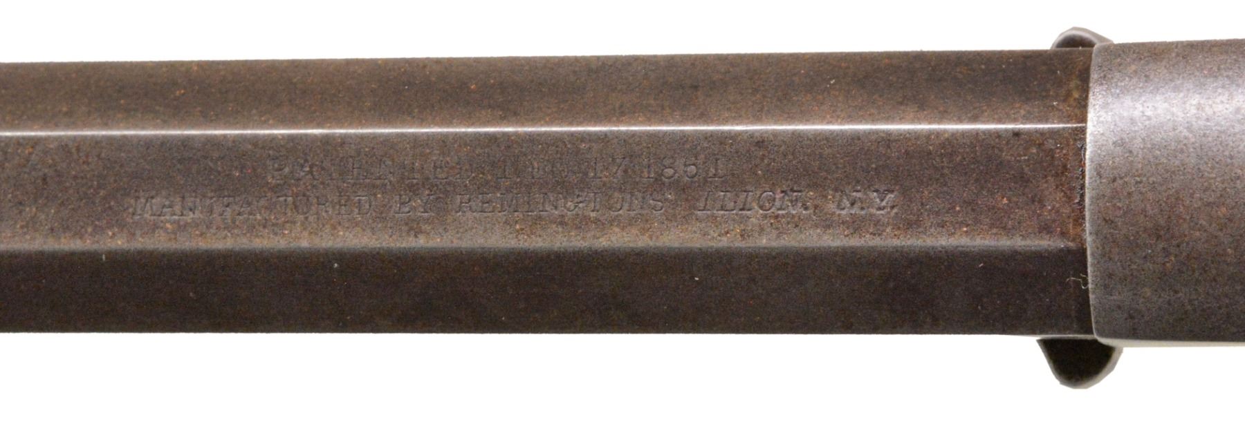 Cal. 44. S# 5296. Bbl. 8" oct. w/ cone style front sight. Blue finish w/ brass trigger guard. 2 Piece walnut grips. Bbl., frame, cyl. & trigger guard have "P" or "R" inspection marks. CONDITION: metal has faded brown appearance showing very light pitting. Refinished grips show heavy wear w/ dents & chips at butt. Bore has lightly frosted appearance retaining sound rifling. (01-16865/DS). ANTIQUE. $700-1,100.