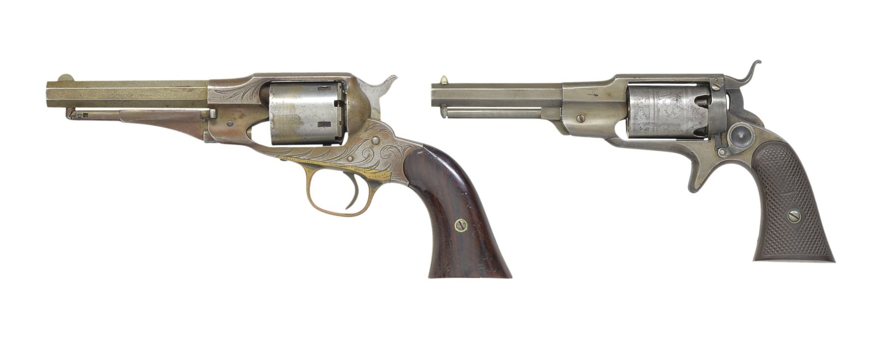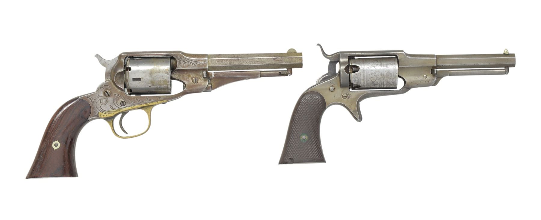 1) REMINGTON-BEALS 3RD MODEL POCKET. Cal. 31. S# 491. Bbl. 4" oct. w/ cone type front sight. 5 Shot rnd. cyl. w/ etched ornamentation. Spur trigger. 2 Piece checkered hard rubber square butt grips. CONDITION: cleaned metal has gray appearance from touch up finish showing spots of pitting & sm. dents. Grips show moderate wear w/ a chip at bottom of right panel. Lightly pitted bore retains intact rifling. (01-16878/DS). 2) REMINGTON NEW MODEL POLICE CARTRIDGE CONVERSION. Cal. 38 RF. S# 6928 (under left grip). Bbl. 4 1/2" oct. w/ blade front sight. 5 Shot rnd. cyl. Brass trigger guard. Sides of frame & trigger guard have open foliate pattern hand engraving. 2 Piece rosewood grips. Conversion no "922" is found on bottom bbl. flat. CONDITION: metal finish is fading to mottled gray brown. Trigger guard retains 50% silver finish. Grips show wear w/ numerous scratches & marks. Bore is dark w/ worn rifling & light pitting. (01-16881/DS). BOTH ANTIQUE. $750-1,250.