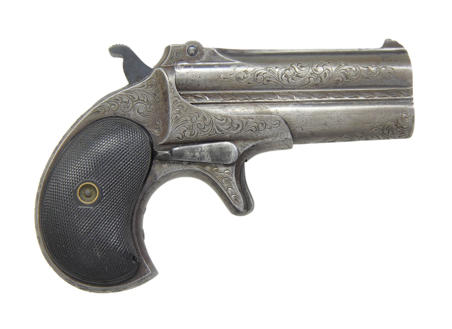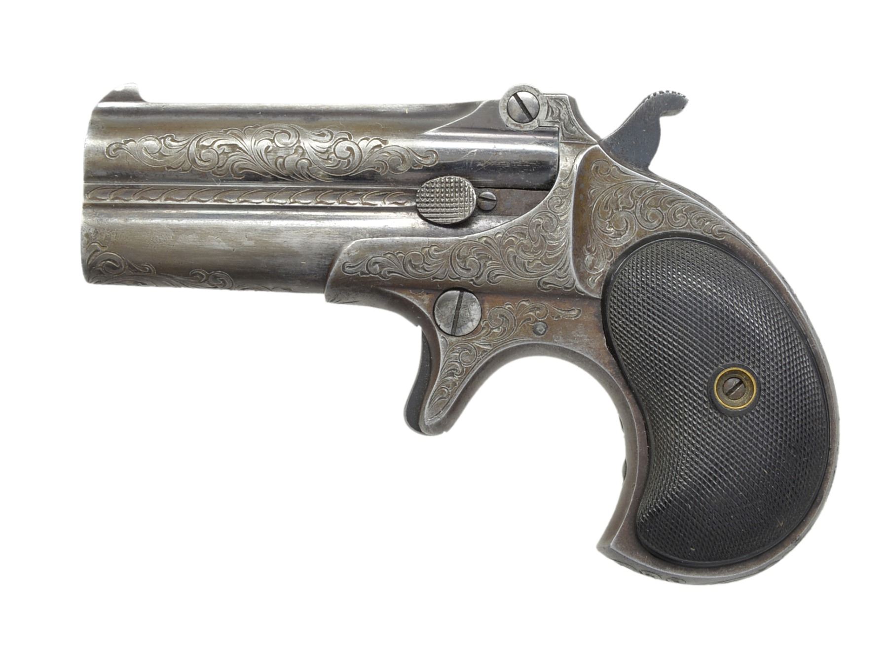 Cal. 41 RF. S# 593. Bbls. 3" rnd. w/ top flat marked "REMINGTON ARMS CO., ILION. N.Y.". Bbls., sides & back of frame have generous coverage of vine type scroll hand engraving that extends to web at top of frame & starburst bottom of frame forward of trigger guard. Backstrap is engraved w/ initials "PEA". 2 Piece checkered hard rubber grips. CONDITION: sm. amounts of blue in protected areas, balance showing a pleasing patina w/ sm. spots of pitting along right side of bbls. Left hinge shows a barely visible crack starting at bottom rear portion. Grips have moderately worn checkering. Bores are generally bright w/ strong rifling. (19-5669/DS). CURIO. $600-900.