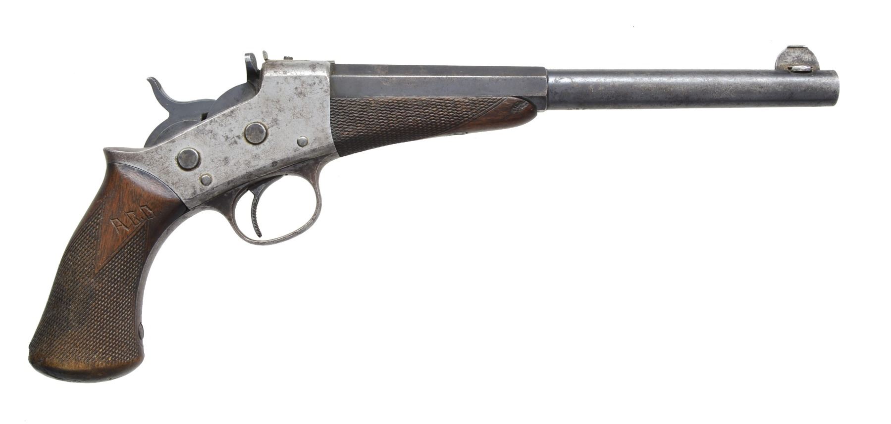 Cal. 44-40. S# 2225. Bbl. 10” half rnd., half oct. w/ tall blade front sight & frame dovetailed rear having V notch. Mfg. 1892-1898; 116 units. Original chamberings were 3 rimfires & 32 S& W centerfire. Underside of bbl. forward of forend marked “44.W”. Flat under forend numbered 3544 & marked "LR"near receiver. Channel of finely checkered forend numbered 08. Left side of trigger guard tang marked 2229 near receiver; frame tang near top numbered 2229. Midpoint of frame tang marked 2225; appears 2225 is S# of frame & 2229's are matching component assembly numbers. Bbl. is an obvious replacement. 44-40 fits rear of chamber but chamber is noticeably long & straight measuring approx. 2.030” total which accepts many cartridges to include 44 Mag., 44 Spl., 44 Russian & likely 44-40 extra long; almost long enough to accept 444 Marlin. Left side of frame has appropriate markings plus “S” military proof above & to left of falling block pivot along w/ “P” near front edge of frame at midpoint. Checkered grip has knife carved “A.B.O.” on right side & deep circular depression at midpoint on left w/ additional thumb relief at top rear. CONDITION: fair overall w/ cleaned pitting throughout. Better appearing rolling block & hammer; good appearing forend w/ sm. chip at right front. Fair modified grip w/ impact marks on butt, chip at rear of base & wear at bottom edges. Very good mechanical functioning. Poor to fair bore worn w/ pitting. (20-648/NW). CURIO. $600-1,000.