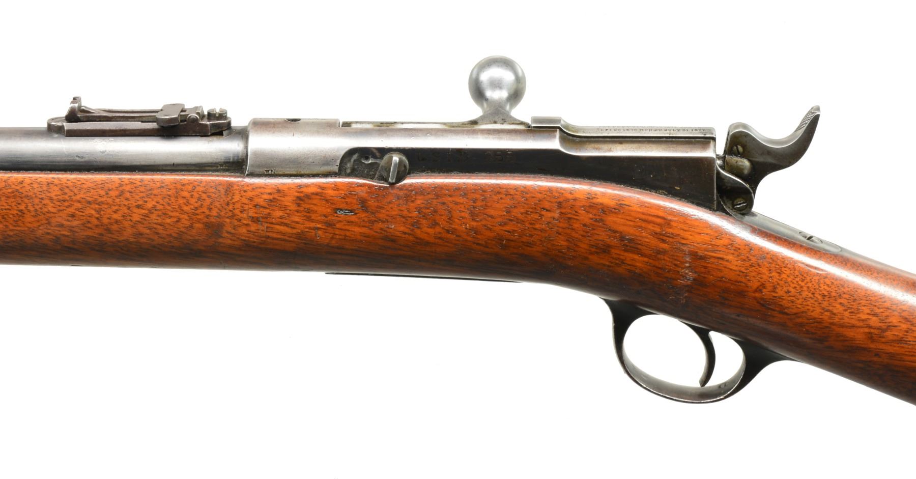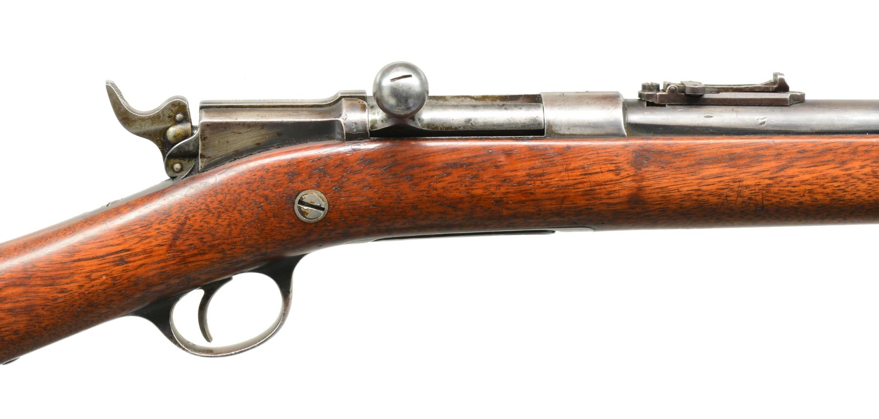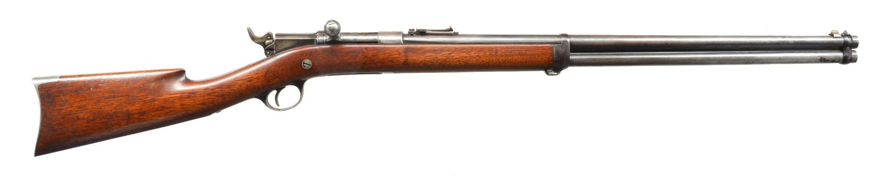 FRONTIER MODEL MADE FOR ARMING INDIAN POLICE 1880-1881. Cal. 45-70. NSN. Bbl. 24” rnd. has carbine type front band w/ dovetailed through sight. Ladder type rear sight graduated to 1000 yds. Full length mag. tube is under bbl. Bolt action w/ manually cocking hammer has Remington markings on top of bolt. Right side of action stamped “U. S. I. D. 355”. Top of receiver ring stamped w/ an arrow at front of gas escape port & ”P” “W. W. K” (inspectors mark at rear). Both bbl. shank & left side of action stamped “HN”. There are no markings on steel trigger guard or cartridge lifter. Distinctively shaped stock of American walnut unmarked & fitted w/ crescent steel buttplate. Comb is also uniquely shaped. There are no inspectors marks present. CONDITION: very good. Metal parts retain about 40-50% of their original blue w/ evidence of some cleaning. Stock possibly sourced from a sporting rifle but has obviously been on this rifle for a very long time, retains most of what appears to be its original finish w/ lifted open grain & appropriate hand wear. It appears that a sling loop has been removed from toeline w/ 2 holes plugged. Bbl. has 2 extra dovetails, one at rear, under replaced rear sight, which does not match this rifle condition wise, but appears to be the right type. A steel bead front sight is in extra dovetail at front. Bore is very good, shiny w/ strong rifling throughout w/ scattered pitting throughout. Fewer than 500 of these interesting Western rifles were produced. (01-17485/MGM122). ANTIQUE. $2,500-3,500.