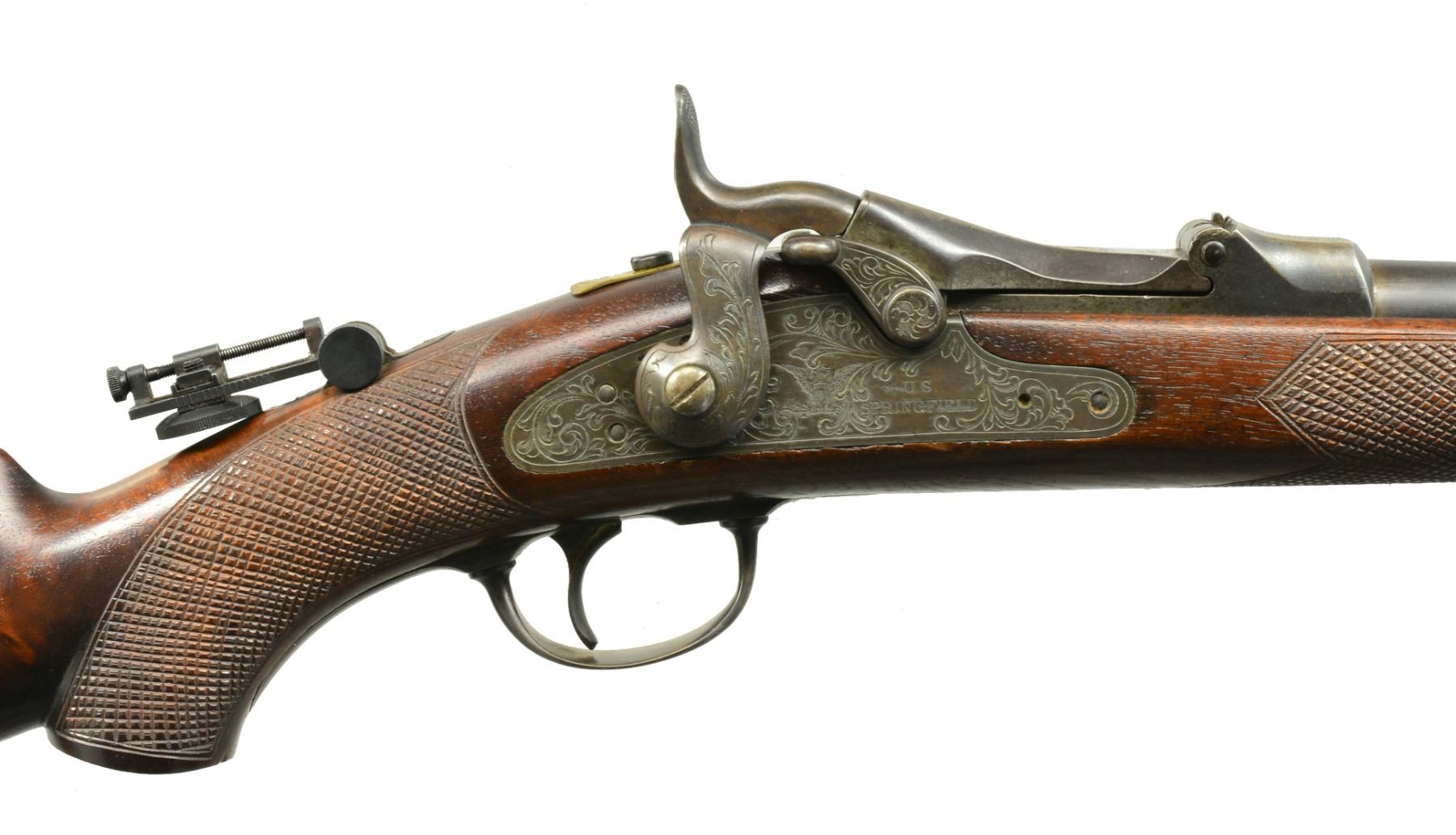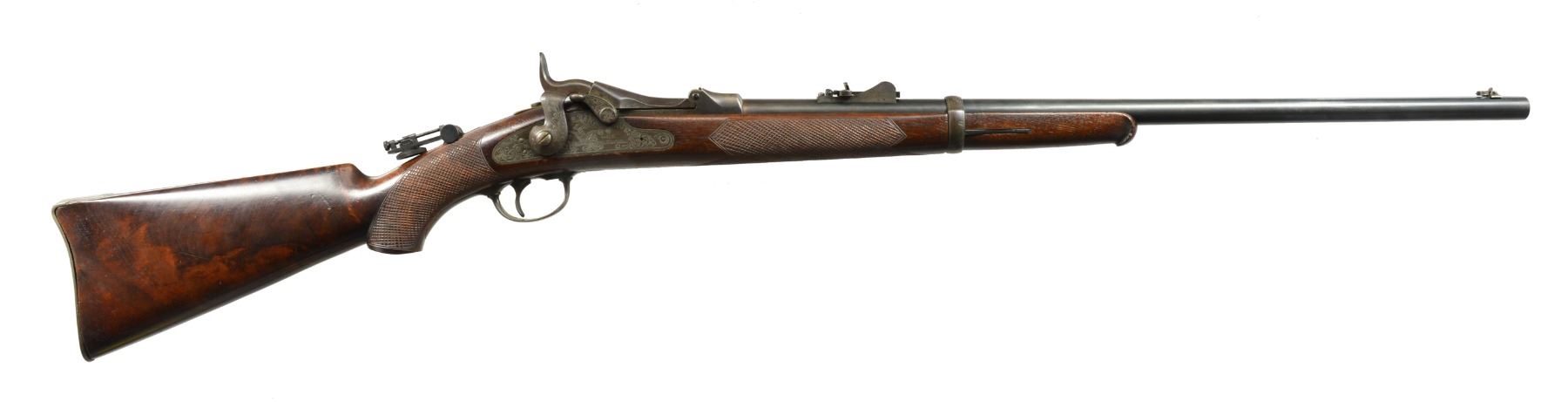 RESEMBLE THE RARE 1881 MARKSMAN RIFLE. Cal. 45-70. S# 1881. Bbl. 26” mounted w/ standard 1873 rear sight & has folding Beech front dovetailed through. 1873 Action is so marked on breech block. Rear portion is engraved “1881” in place of S#. "Springfield" & eagle marked lock & other major parts including action, trigger guard bow & buttplate are engraved w/ open scroll resembling engraving found on the Officers model. Crotch figured American walnut pistol grip stock has schnabeled tip. Poorly cut checkering is at grip & forend. Cast folding tang sight is at top of grip. Brass tag stamped “12” “C” “23” is affixed under tang screw. CONDITION: good, as rebuilt. Most original blue remains on bbl. Areas w/ engraving have been cleaned & reblued. Stock retains most of its original finish. Bore is fair, somewhat pitted. (01-17390/MGM95). ANTIQUE. $2,000-3,000.