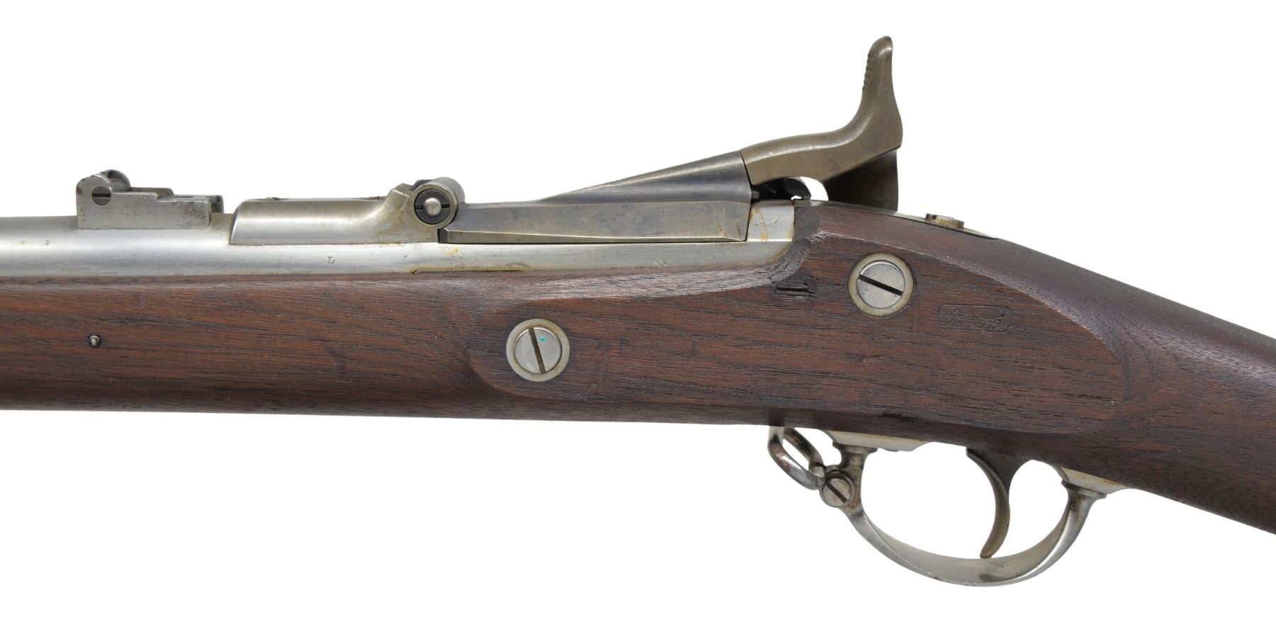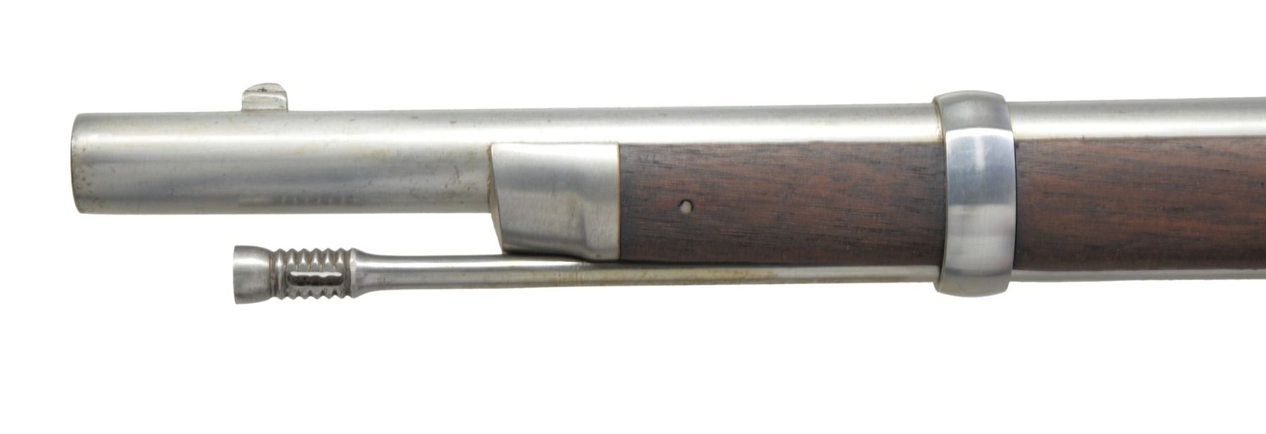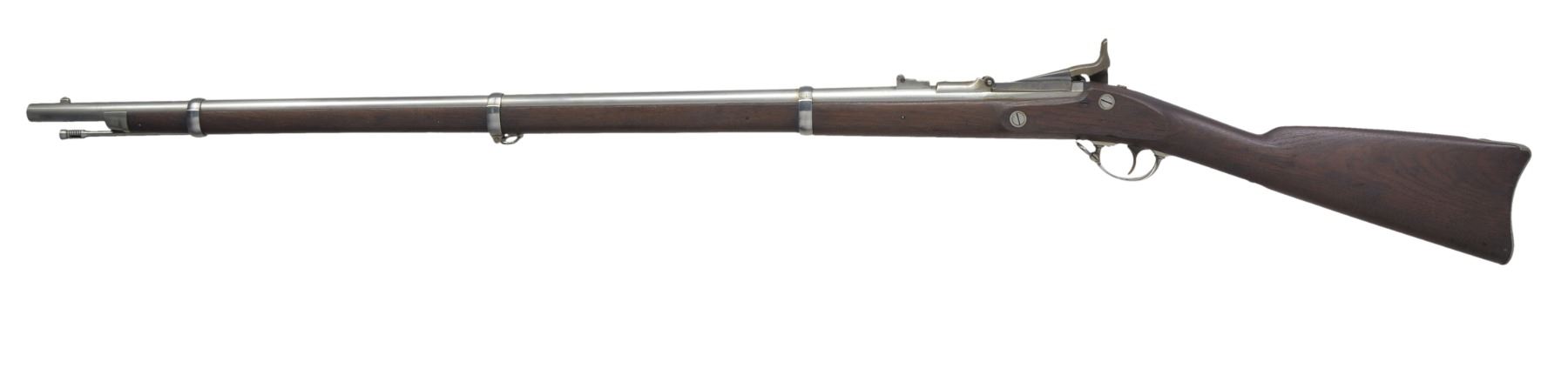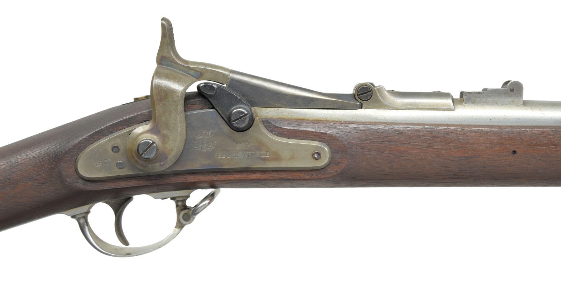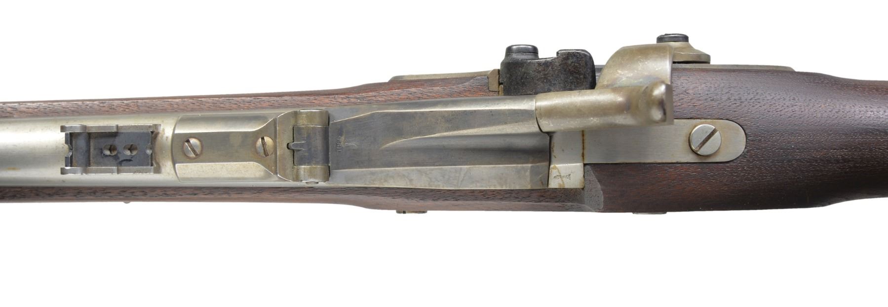 Cal. 50-70. NSN. Bbl. 36 5/8". Blade front sight w/ 2 leaf rear sight. Blued breech block w/ 1866 date over eagle's head. Case colored Springfield lock w/ 1865 date. 3 Band walnut stock w/ iron musket buttplate & fittings. Slotted tipped iron ramrod. Left side of stock has partially legible cartouche. CONDITION: bbl. has good "in the white" finish showing spots of freckling. Breech block has dull fading blue. Lock & hammer retain 40% light & fading case colors. Refinished stock shows scattered dents & handling marks w/ sm. chips along ramrod channel. Bore is bright w/ sharp rifling. (01-17005/DS). ANTIQUE. $1,200-1,800.