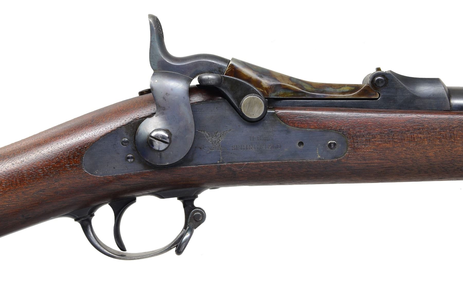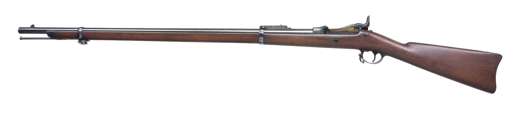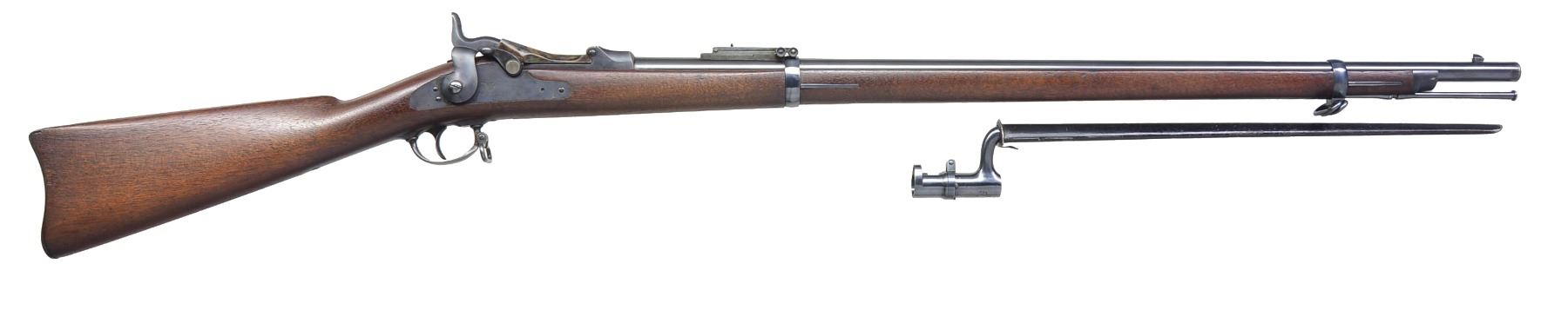 Cal. 45-70. S# 345629. Bbl. 32 5/8" w/ Buffington rear sight & pinned blade front sight. Blued lock w/ American Eagle marked "US / SPRINGFIELD". 1873 Dated replacement case colored low arch breech block. Full length band fastened Model 1879 style long comb walnut stock w/ clear 1880 dated cartouche. Slotted tipped iron cleaning rod. UNATTACHED ACCESSORIES: bayonet & steel scabbard. CONDITION: very fine as arsenal refinished. Bbl., bands & cleaning rod retain 98% bright blue showing sm. scratches. Buttplate, floorplate & trigger guard retain 70% lightly faded blue showing wear marks. Stock has very good finish showing a few sm. dents. Bright near excellent bore. Bayonet retains 95% bright blue showing sm. spots of freckling & wear. Scabbard retains 70% painted finish. (01-17347/DS). ANTIQUE. $1,000-1,500.
